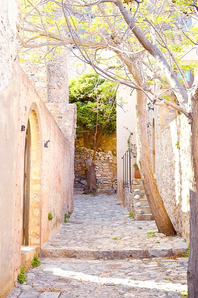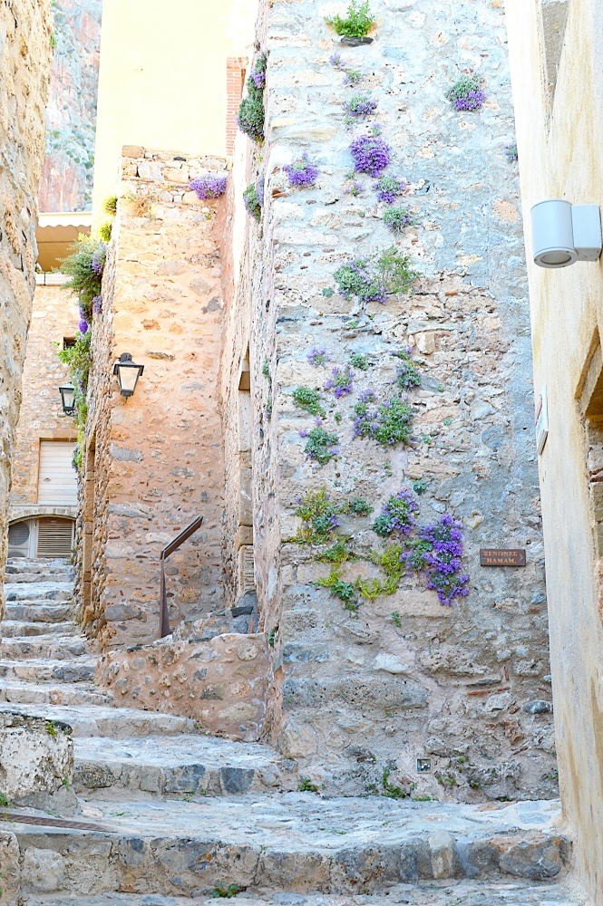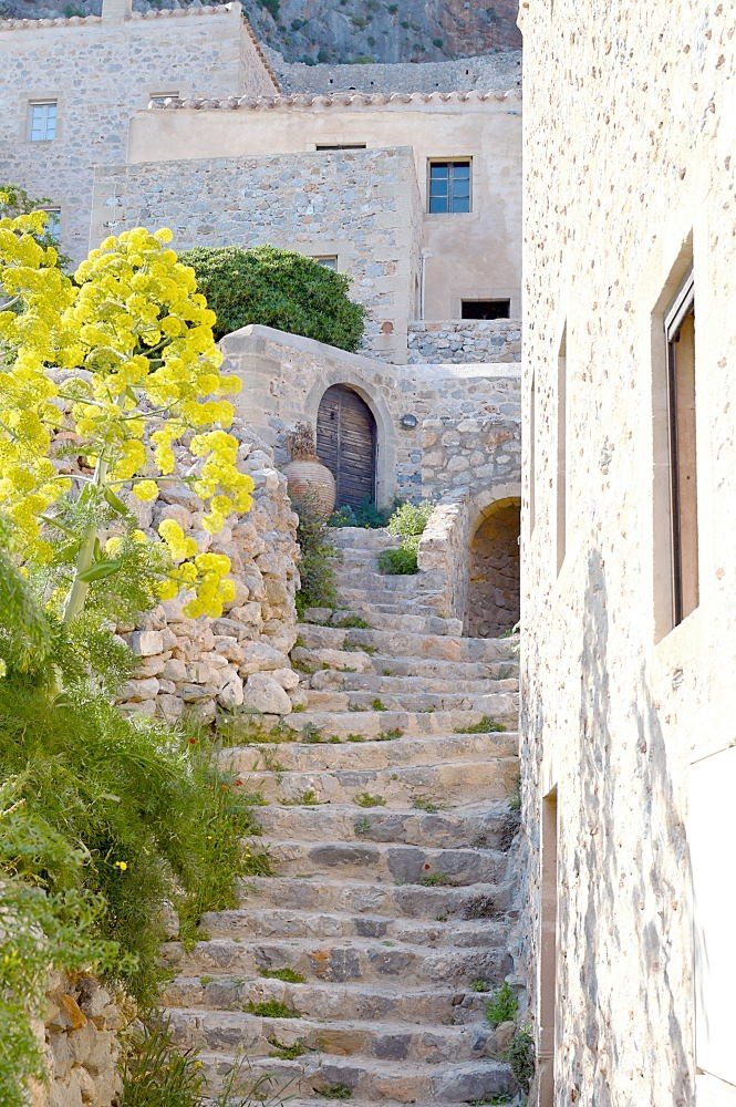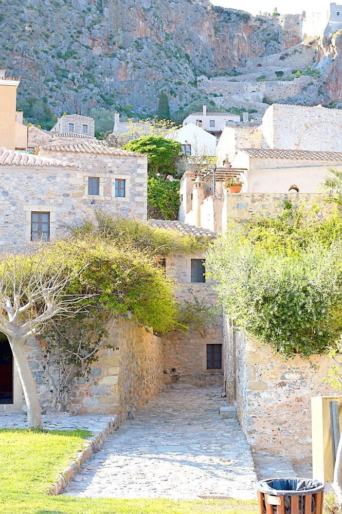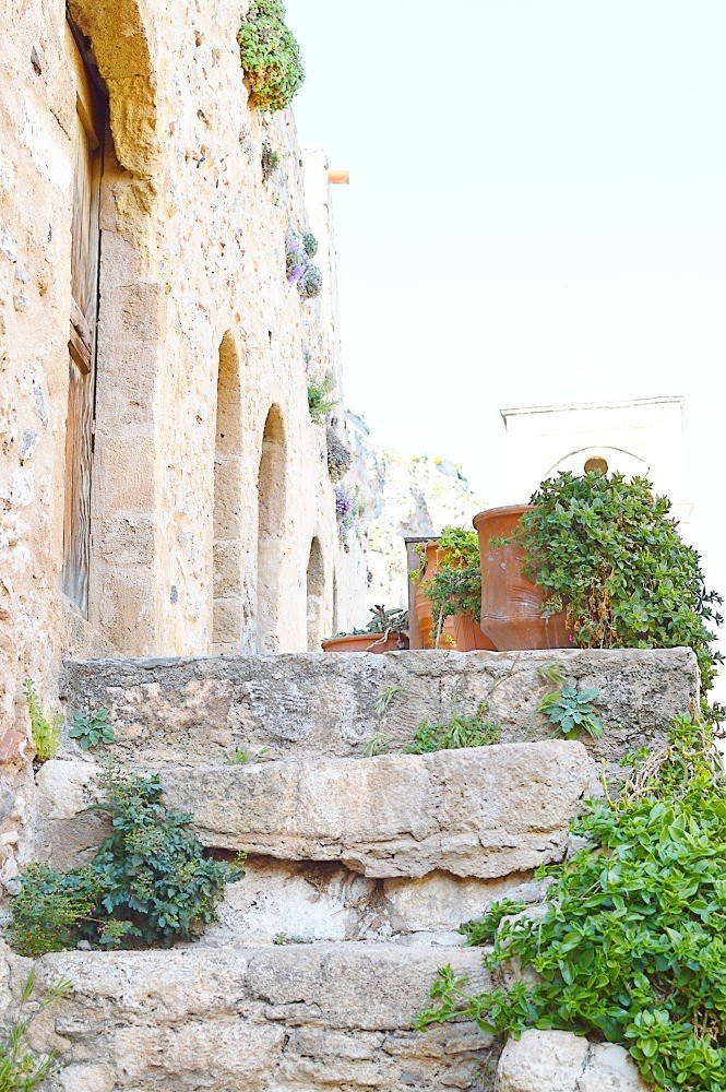 While the famous white houses of Cyclades are impressive, in Monemvasia, you won’t find a single white house in sight. The town is full of stone, warm yellow and rose colored houses with ceramic roofs. This gives the rustic, Italian/Venetian feel to the whole area, completely different to the usual Greek town. Although, trees and nature are growing from every nook and cranny, we recommend you visit Monemvasia before August, maybe even in May, when everything is green and blossoming.