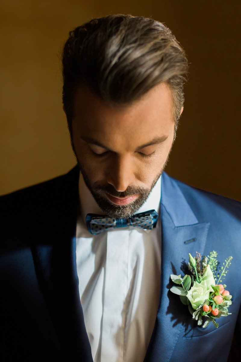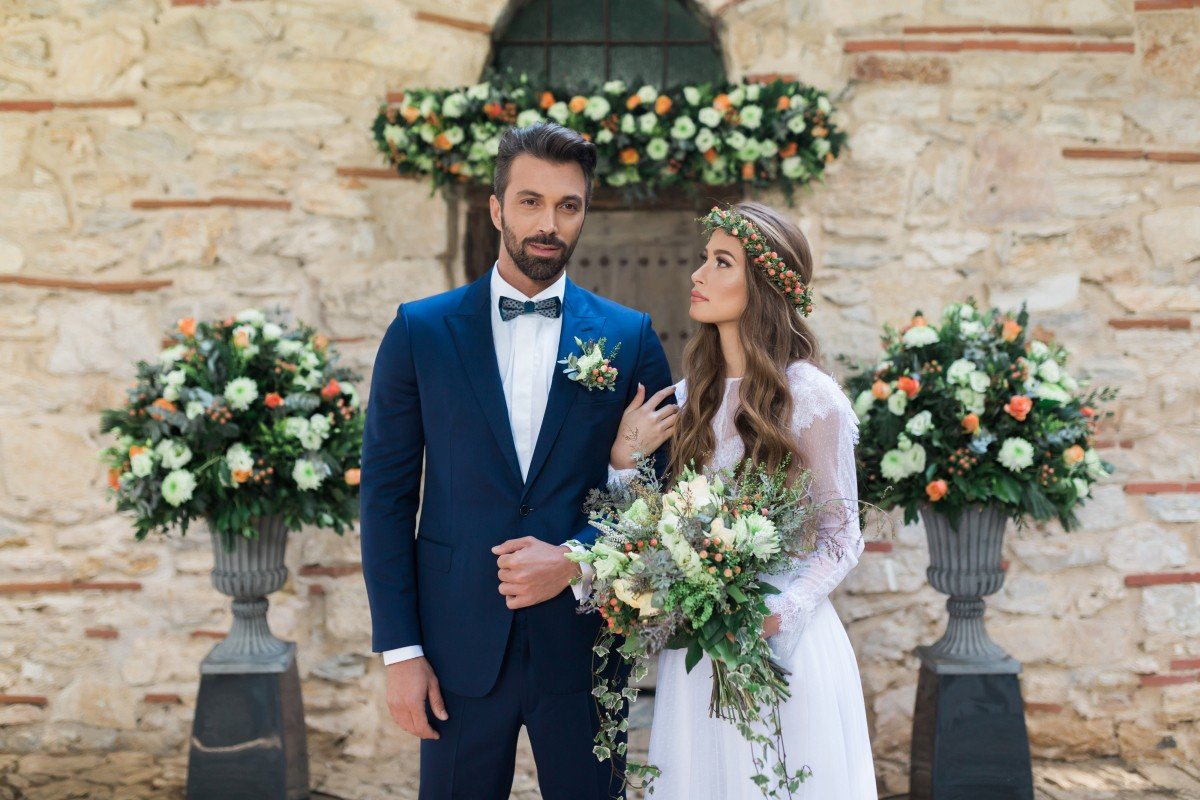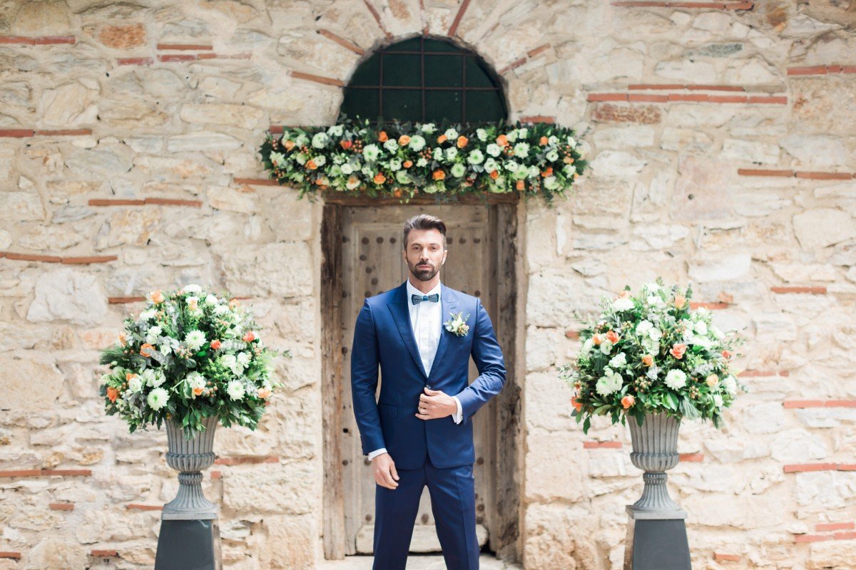 This romantic dress of French Chantilly lace and skirt made of silk and cotton tulle with impressive embroidery on the neckline and on the front slit, was perfect for our bride Elisabetta. Then again, this smoking one button slim line suit in blue black color for our groom Adrian. For this unique occasion, Elena Soulioti and Takis Giannetos joined forces, to bring the fairytale to life.
