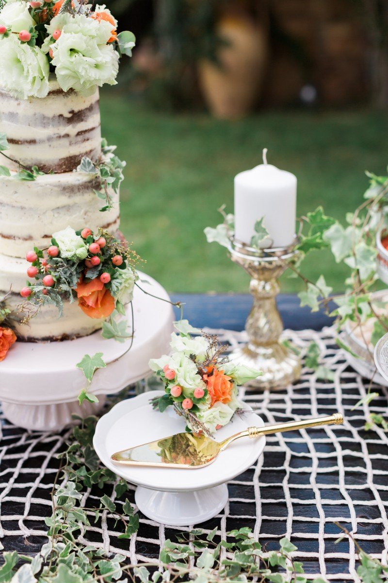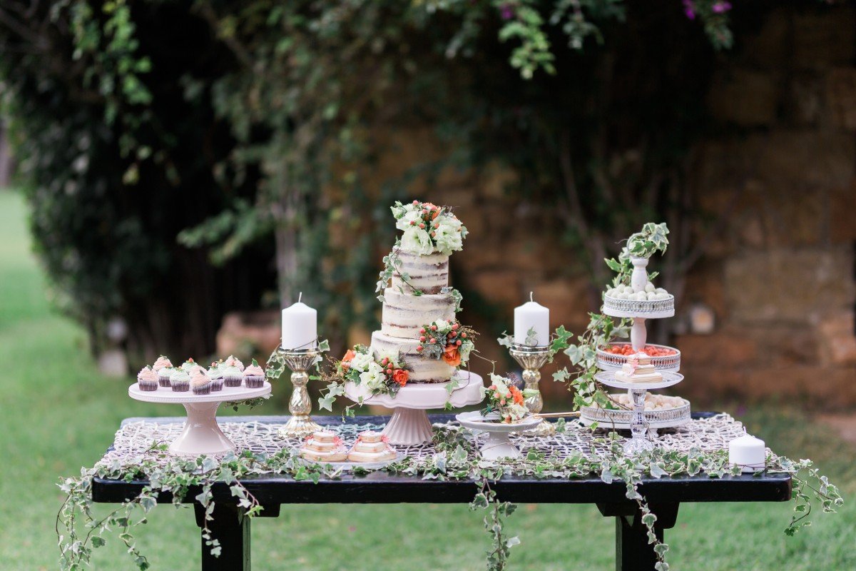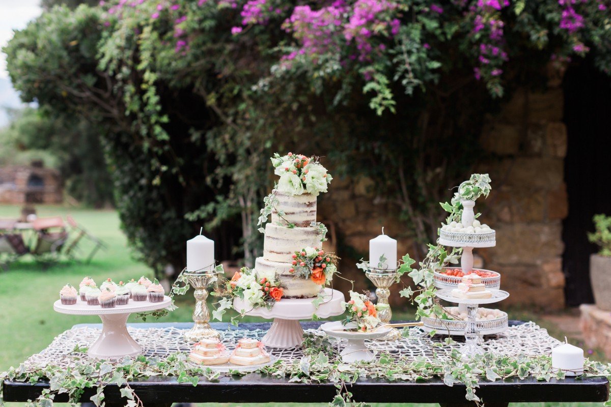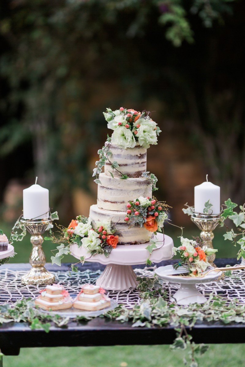 Most noteworthy, our dessert table covered with ivy leaves and sweets to satisfy both eyes and taste. Even more, the naked, lush cake was calling you to take a bite. Furthermore, the journey, full of vanilla cream & red velvet flavors of this delicious cake was handcrafted by Piece of Cake.