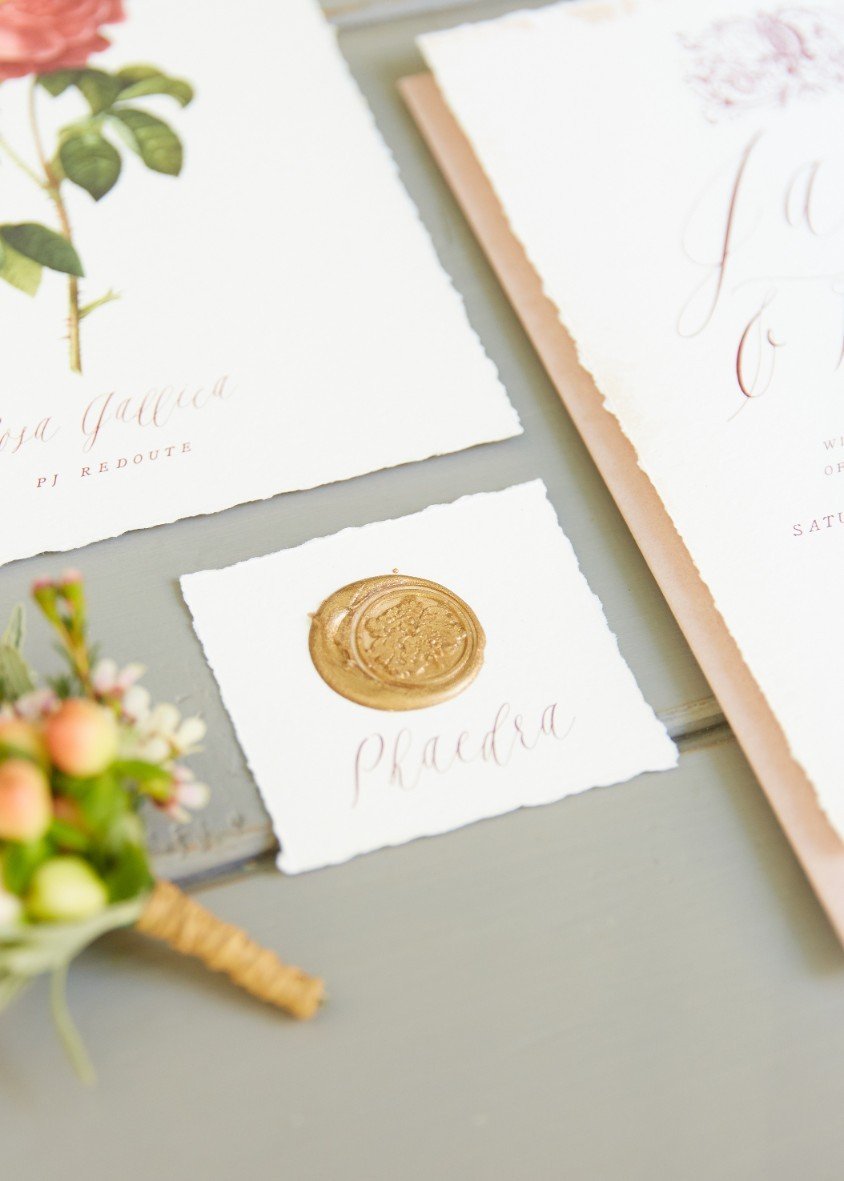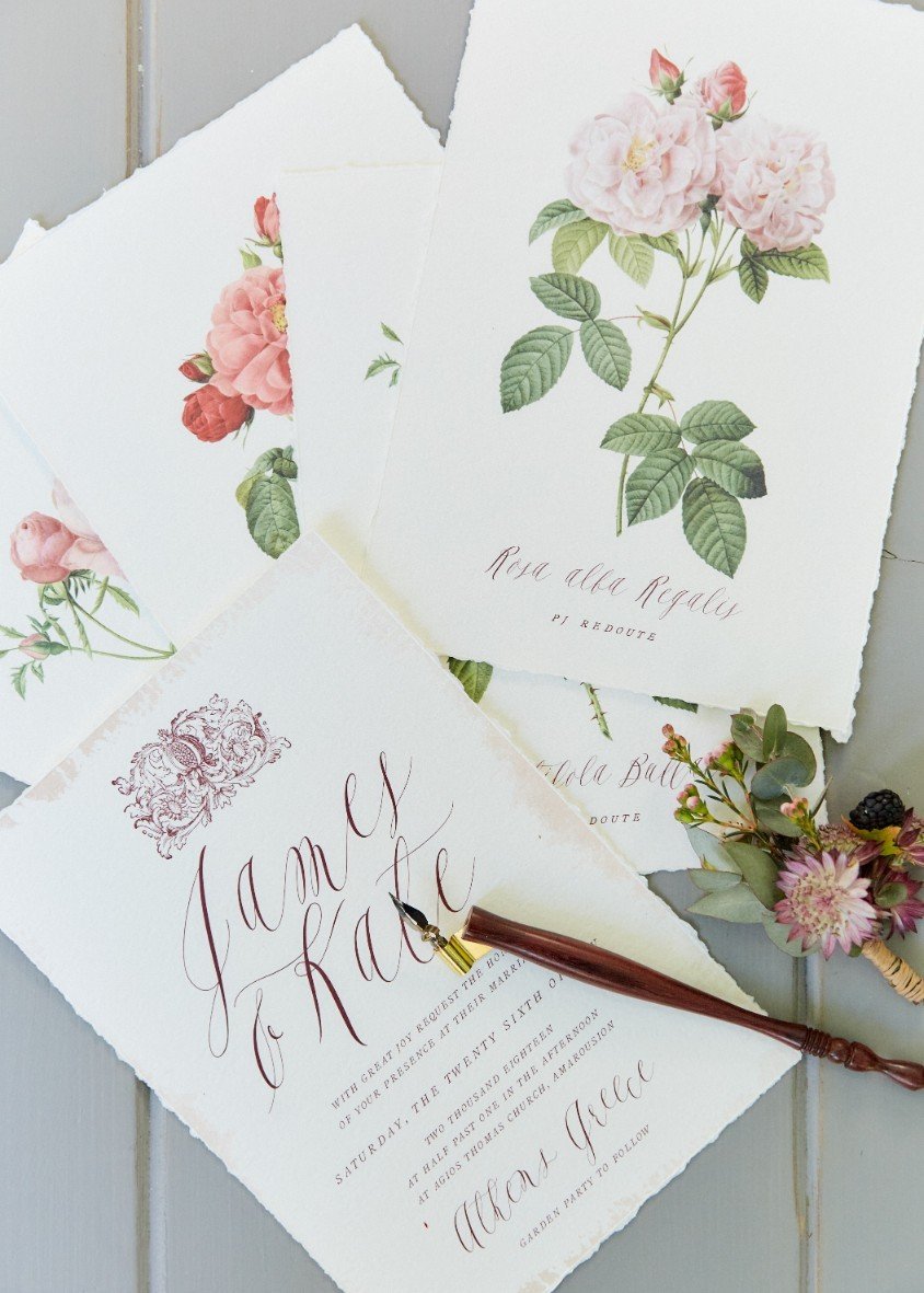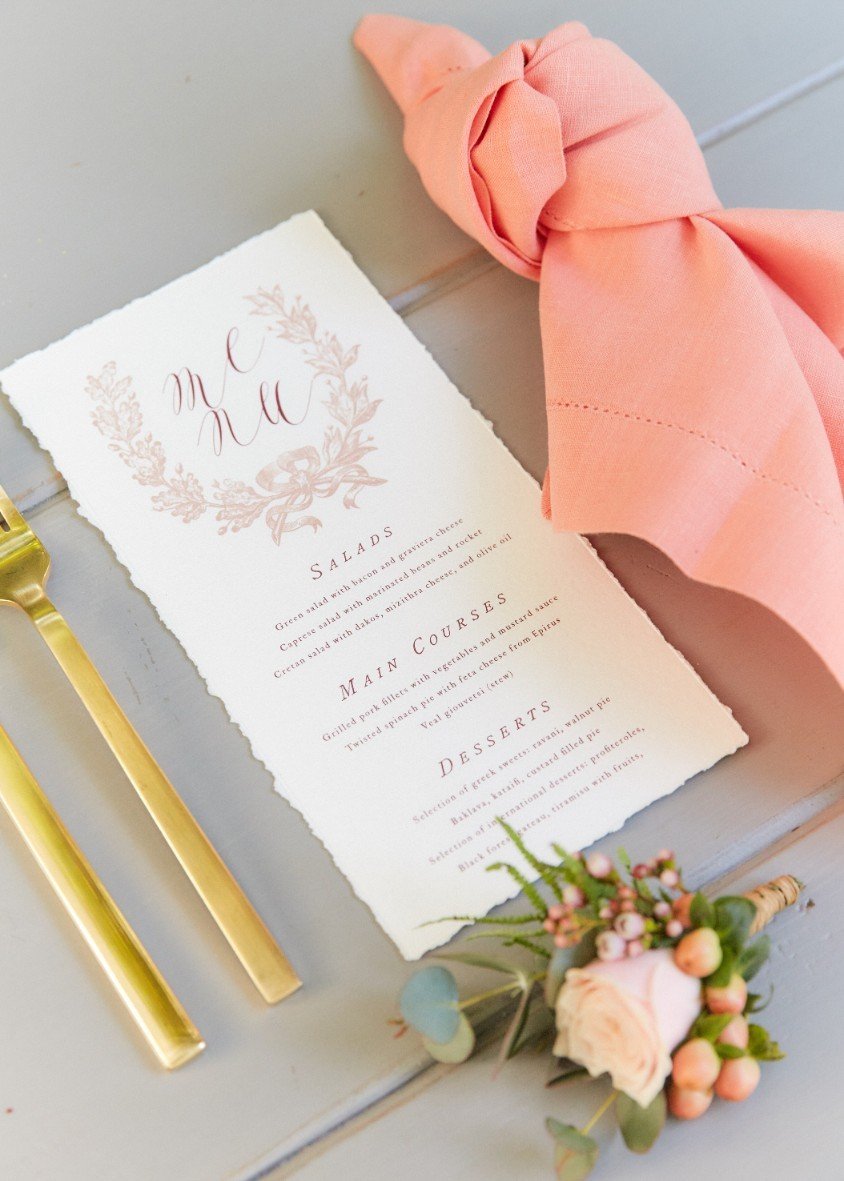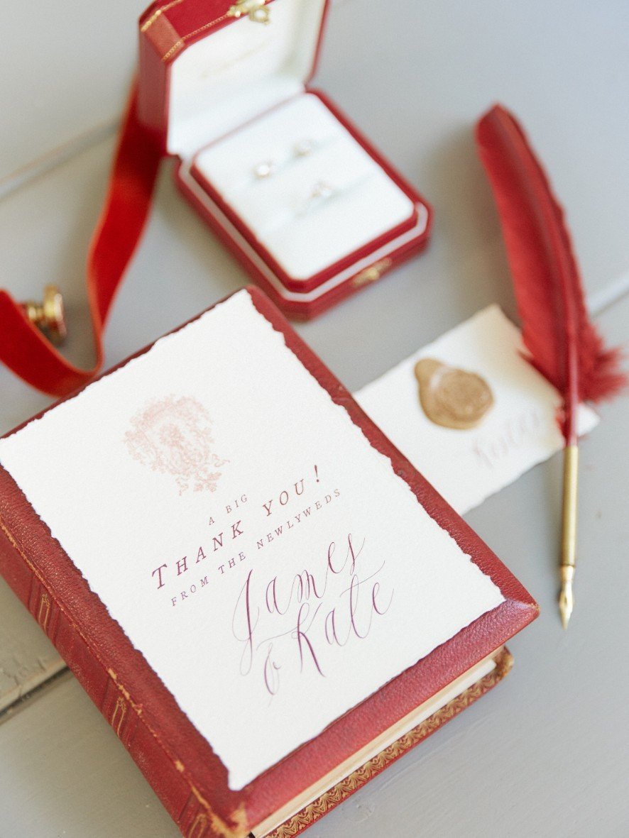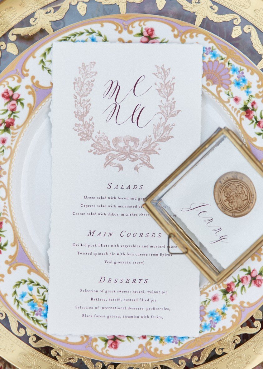 All stationery was designed by Atelier Invitations. Thank-you cards, save the dates, invitations, menus, name cards and even personalised floral cards were all made in peach and burgundy hues with golden accents and wax seals, which correlated with the rest of the theme.
