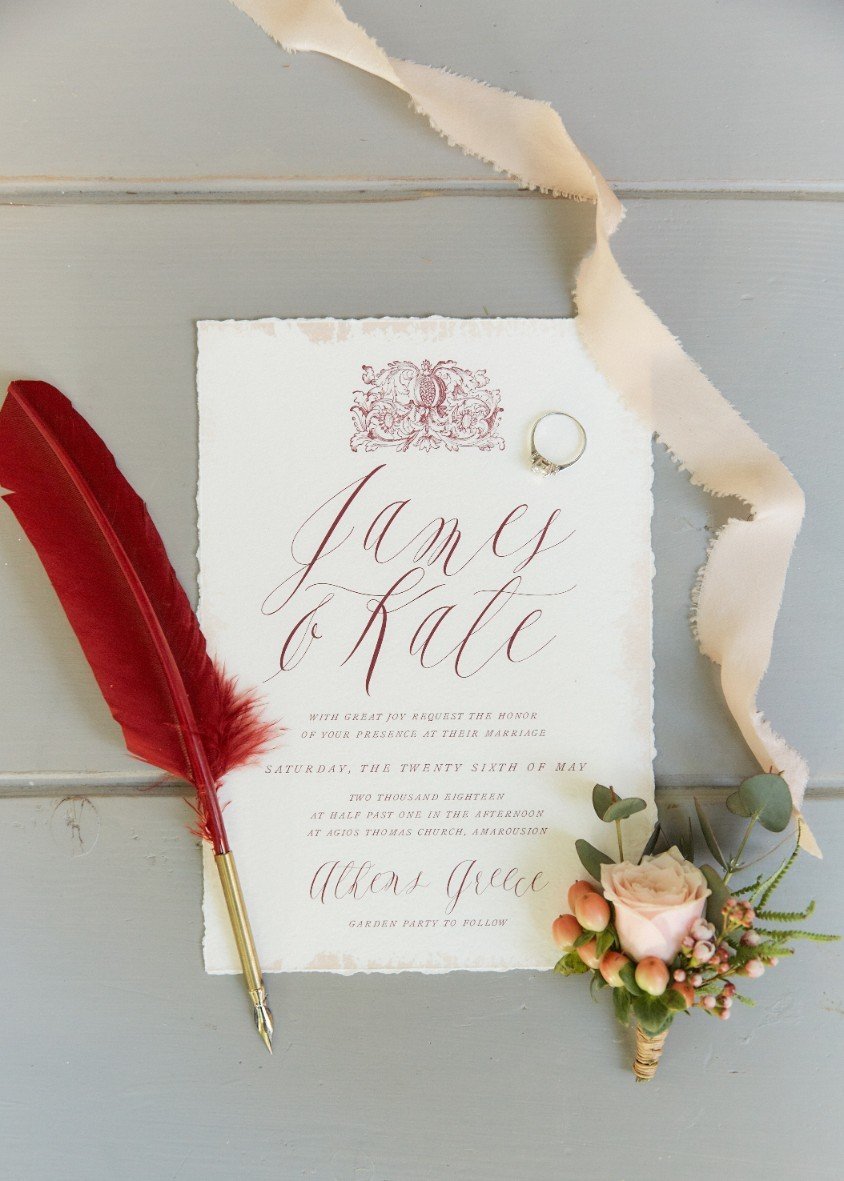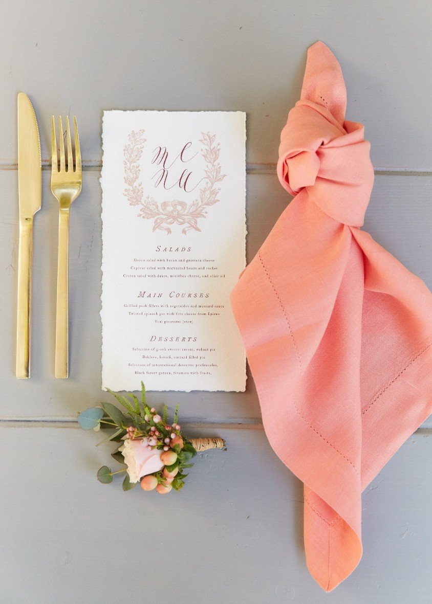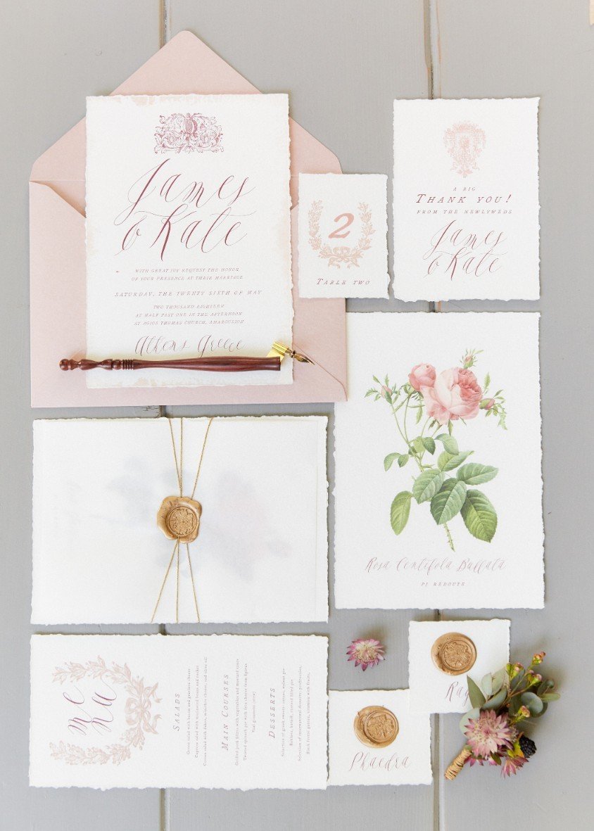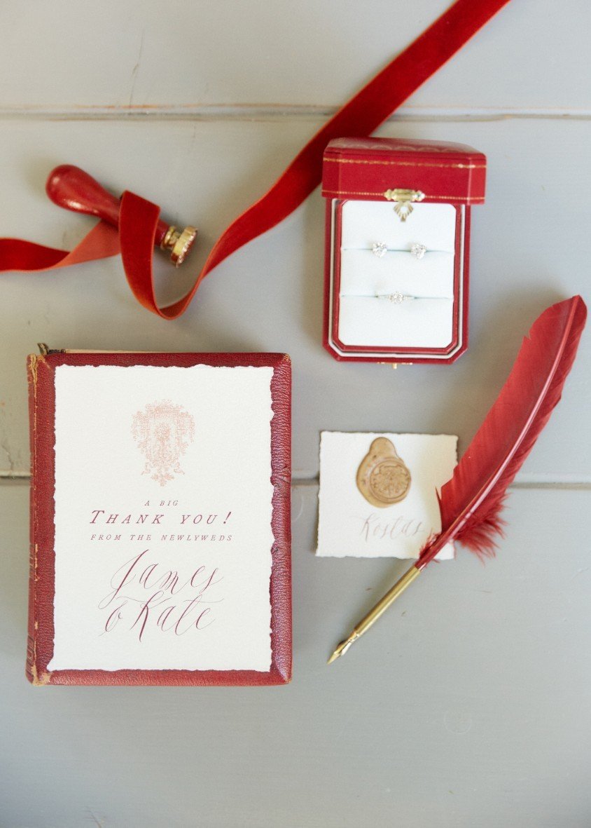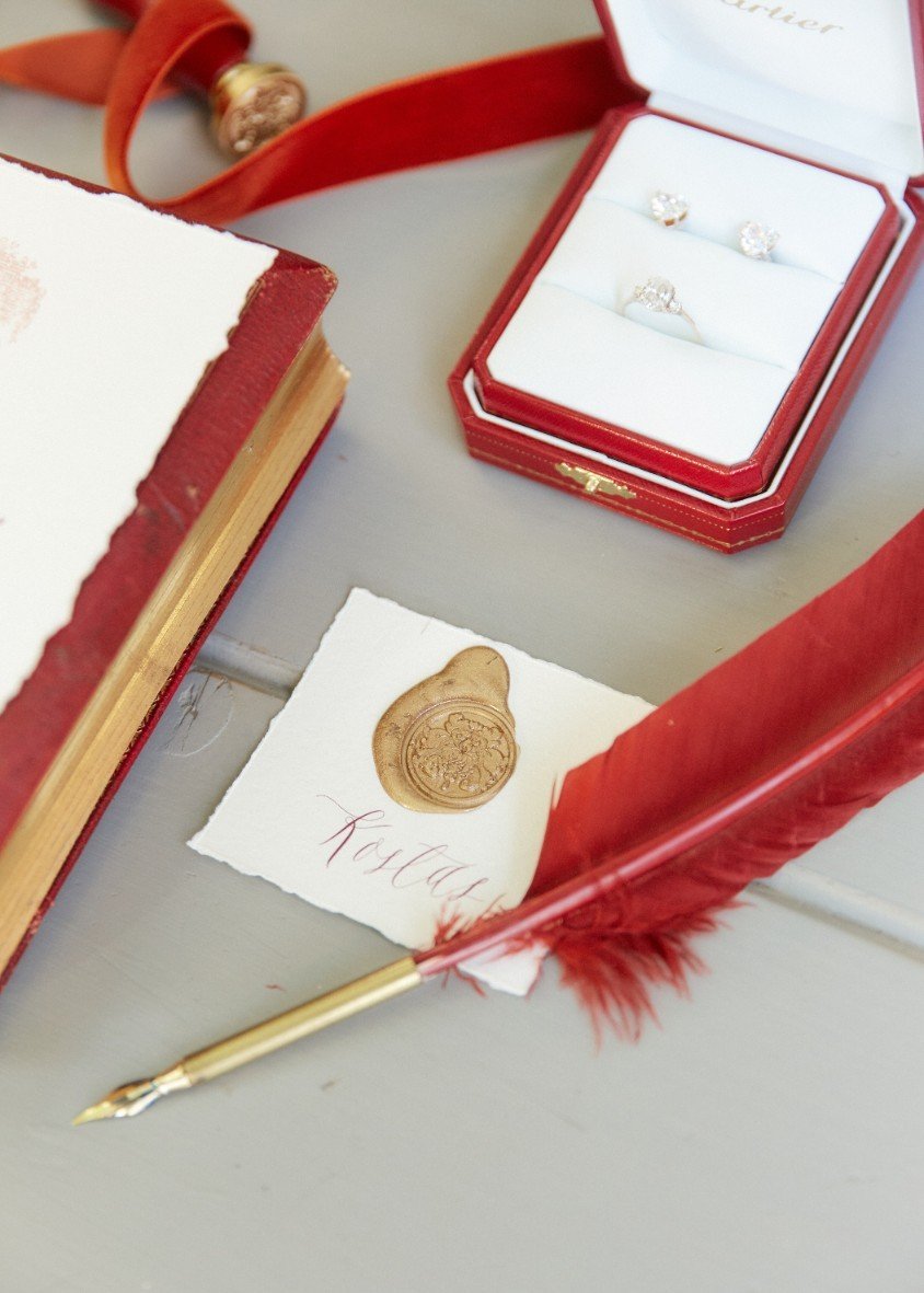 All stationery was designed by Atelier Invitations. Thank-you cards, save the dates, invitations, menus, name cards and even personalised floral cards were all made in peach and burgundy hues with golden accents and wax seals, which correlated with the rest of the theme.
