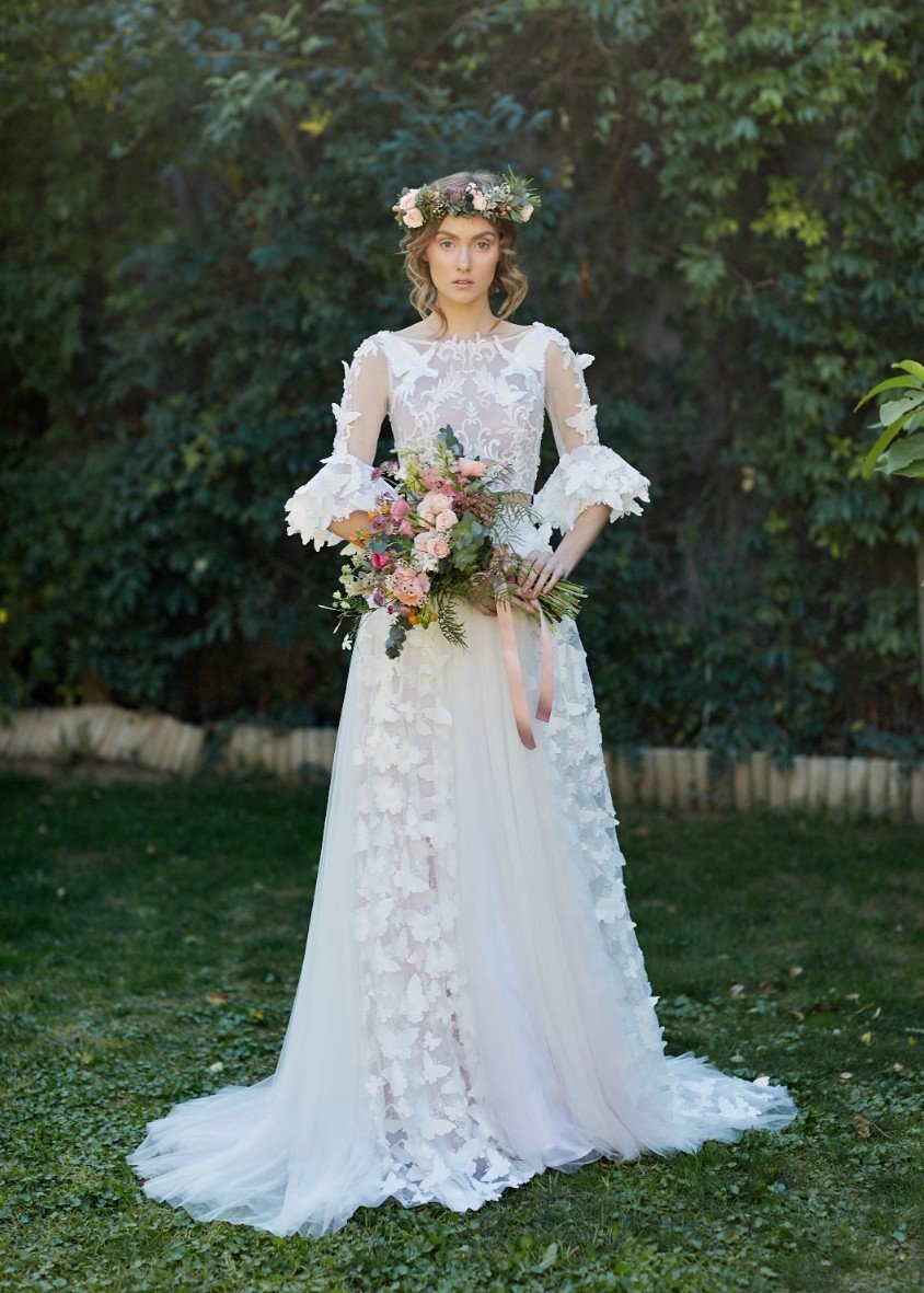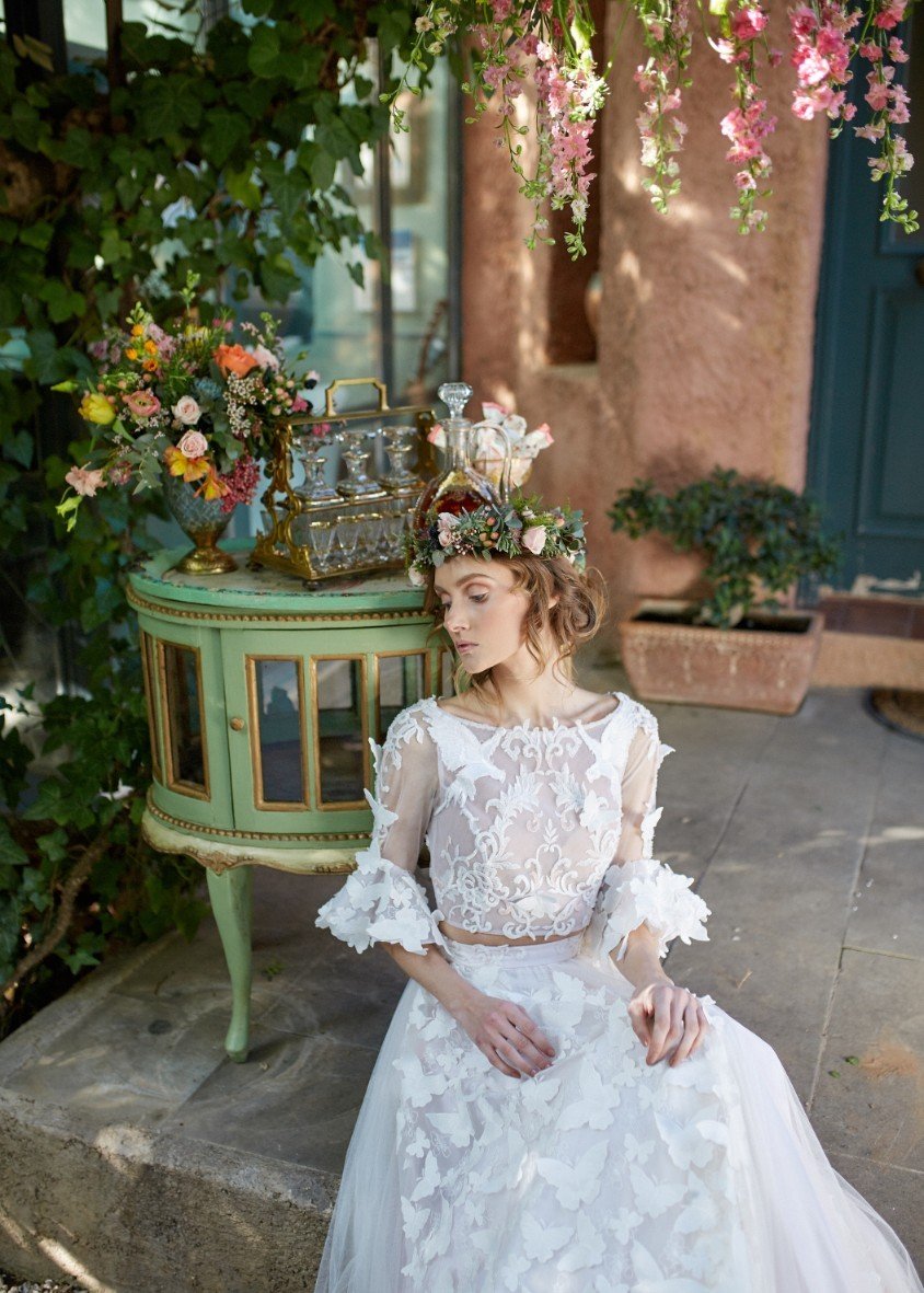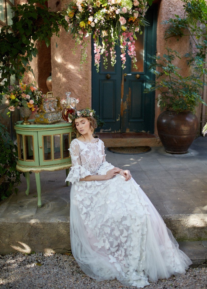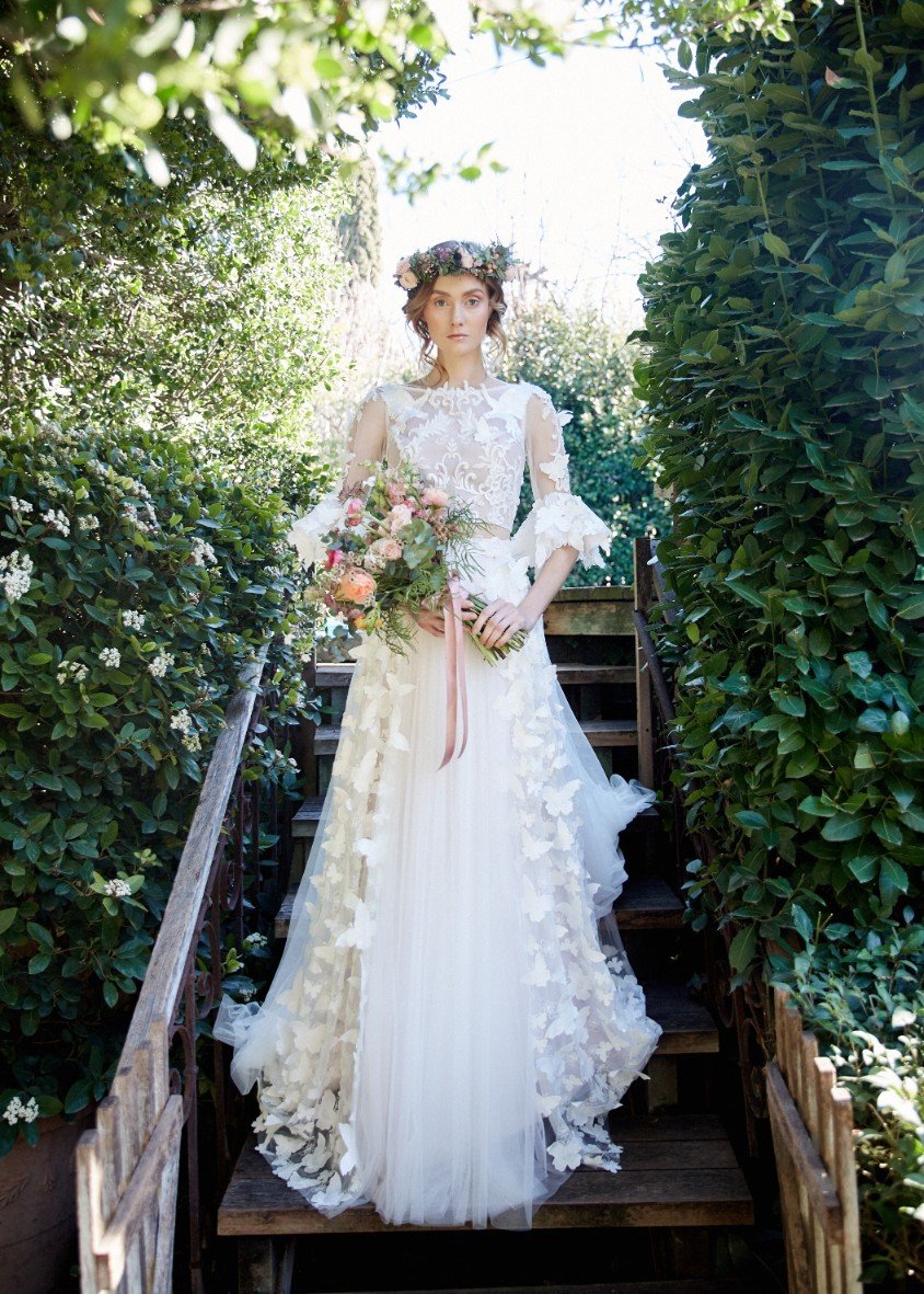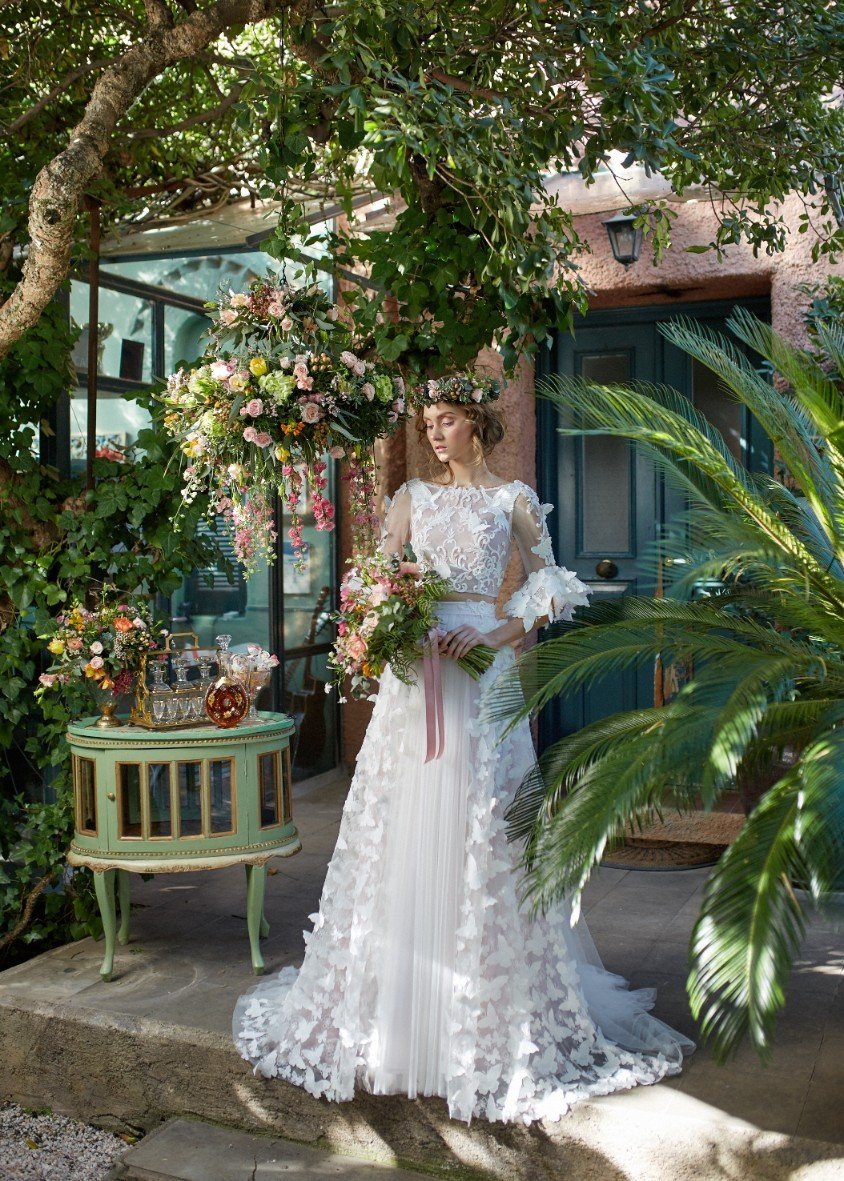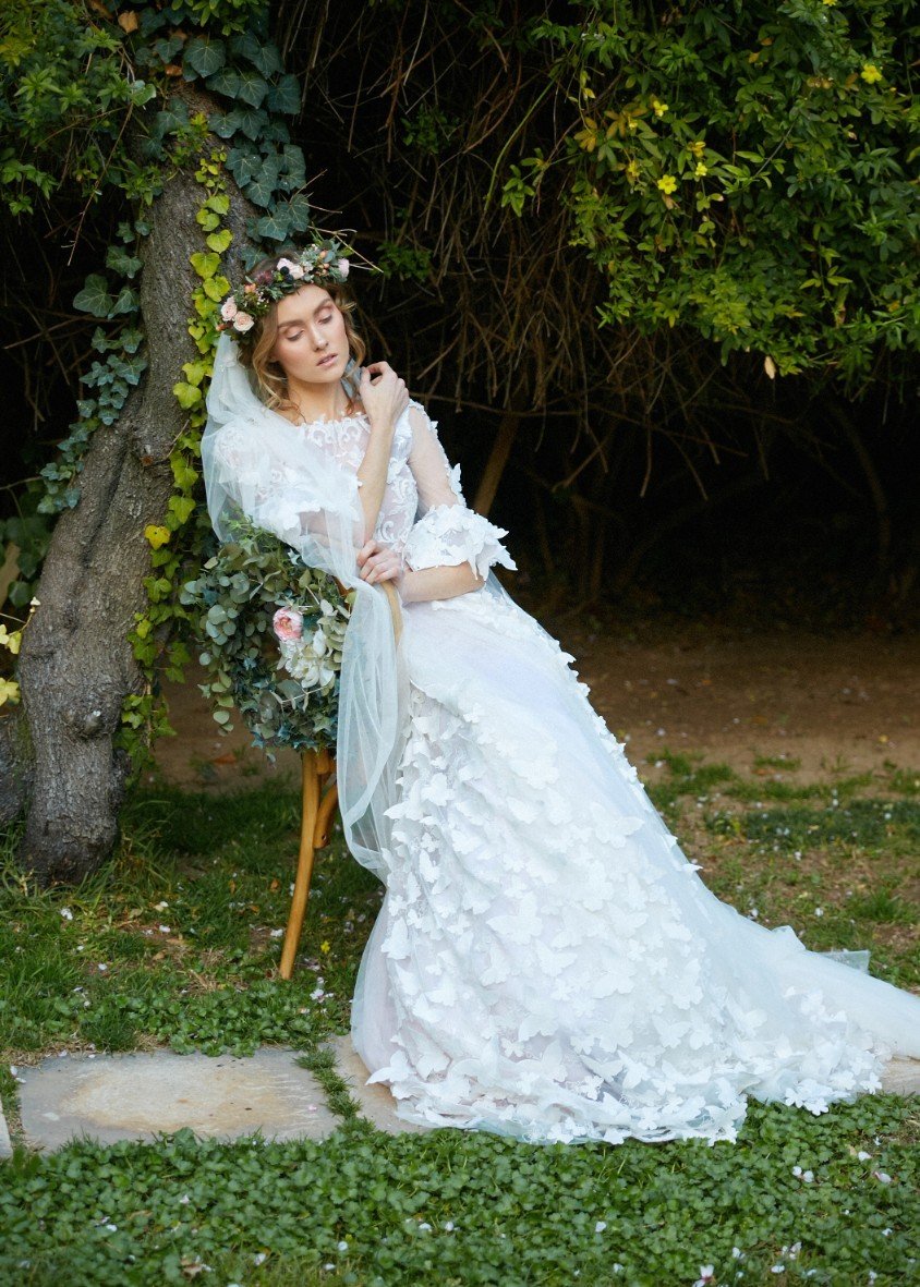 You may have noticed some of this year’s trends for bridal dresses, like bell sleeves or two pieced gowns. We took it a step further with our handmade dress from Made Bride by Antonea. The long flowy skirt was covered with butterflies on each side, which gave the dress the natural volume and flowy movement. The delicate lace top with half bell sleeves, was decorated with birds, butterflies and other embroidery shapes or patterns of the “Enchanted Garden”.