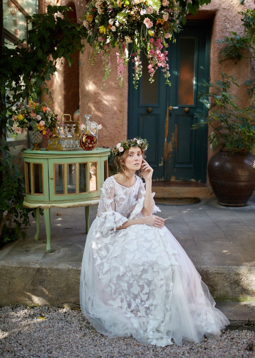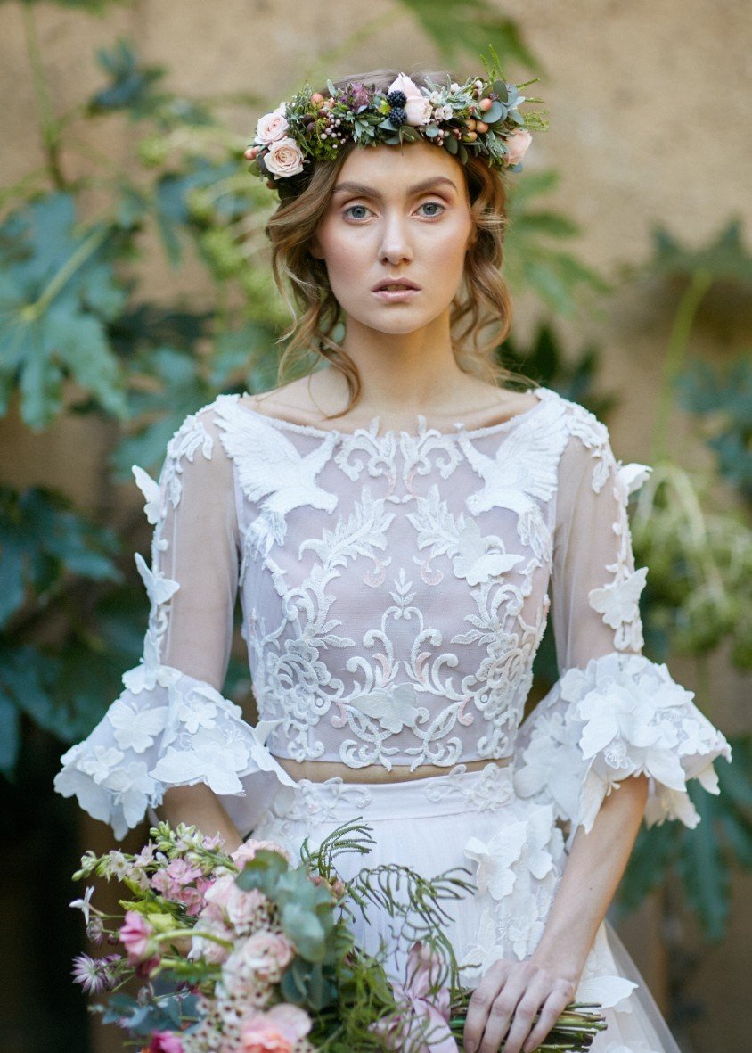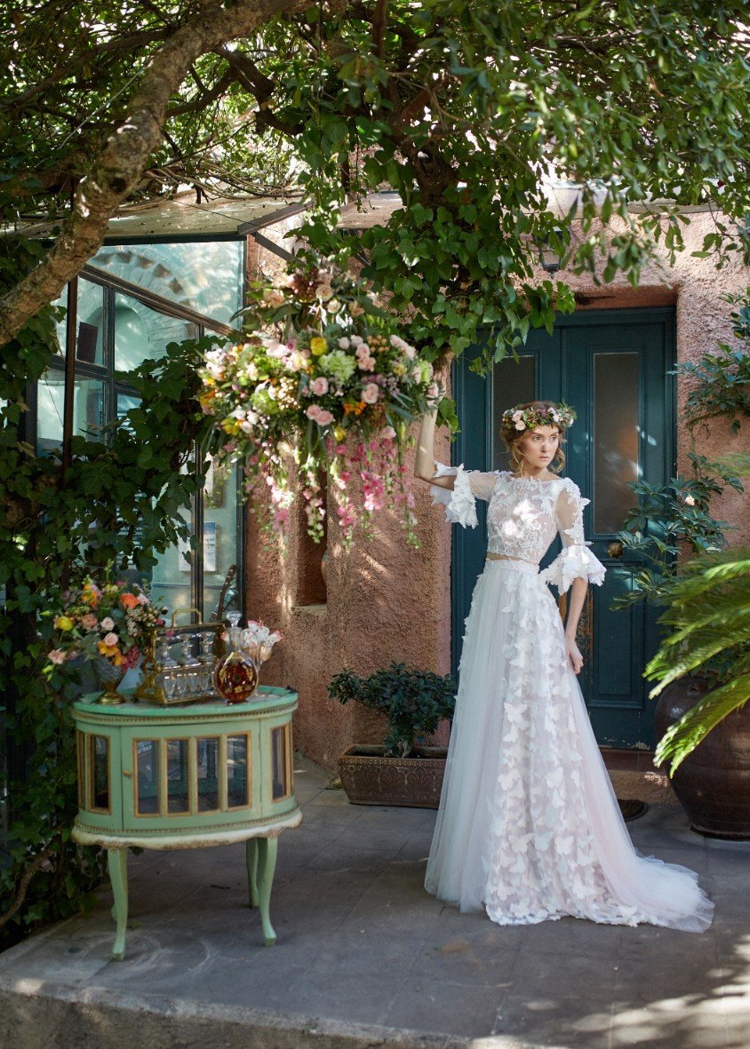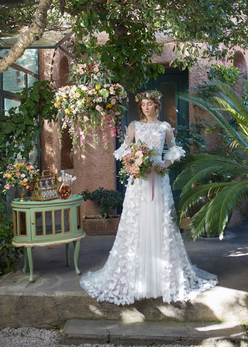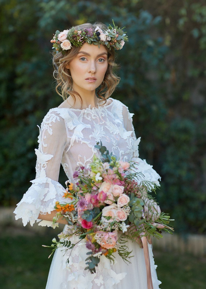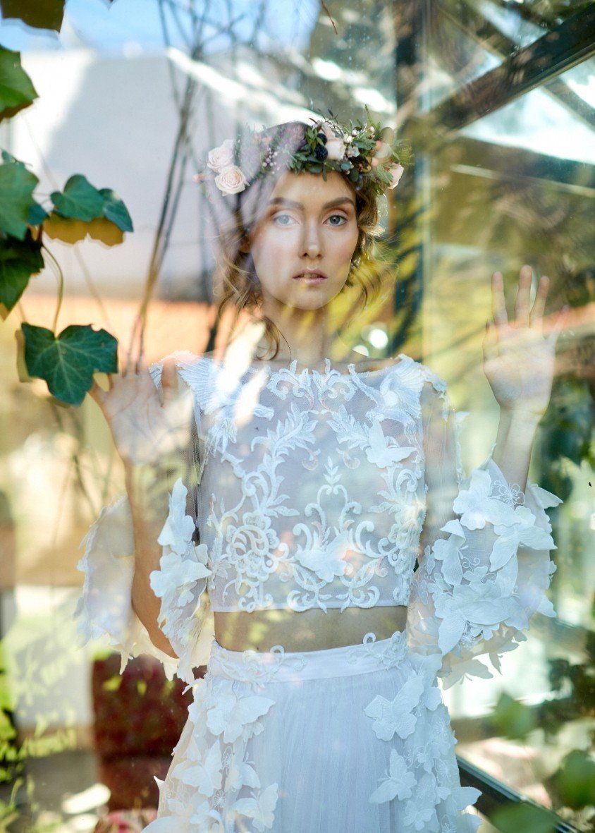 You may have noticed some of this year’s trends for bridal dresses, like bell sleeves or two pieced gowns. We took it a step further with our handmade dress from Made Bride by Antonea. The long flowy skirt was covered with butterflies on each side, which gave the dress the natural volume and flowy movement. The delicate lace top with half bell sleeves, was decorated with birds, butterflies and other embroidery shapes or patterns of the “Enchanted Garden”.
