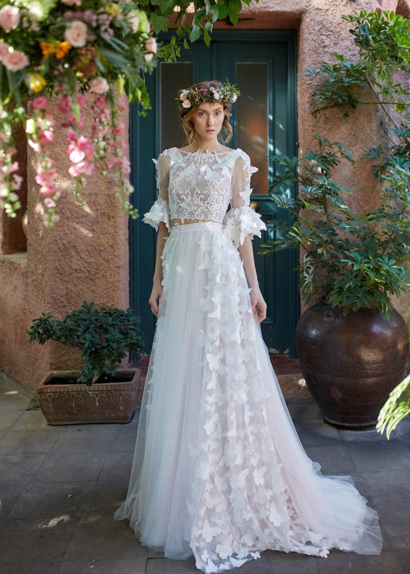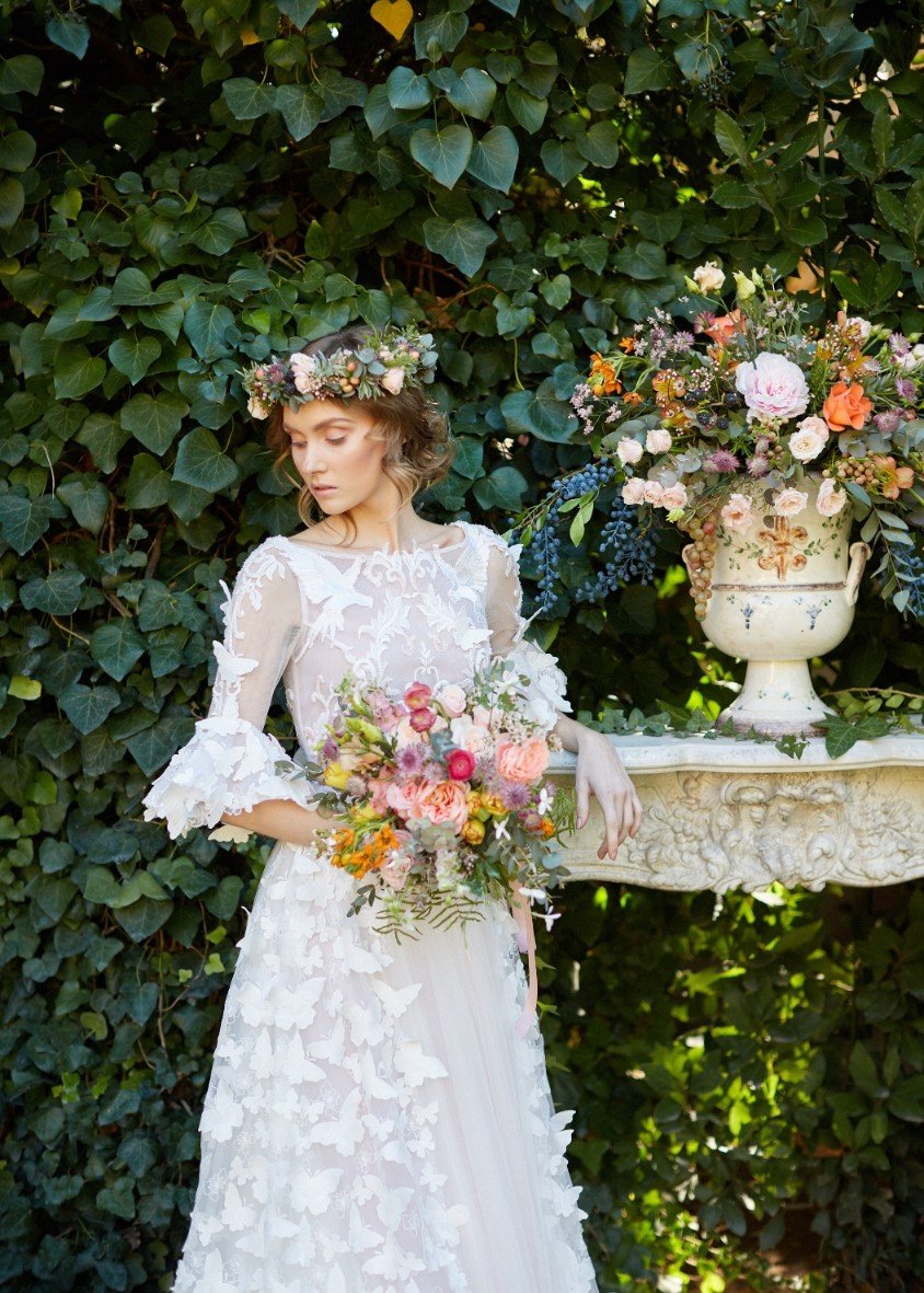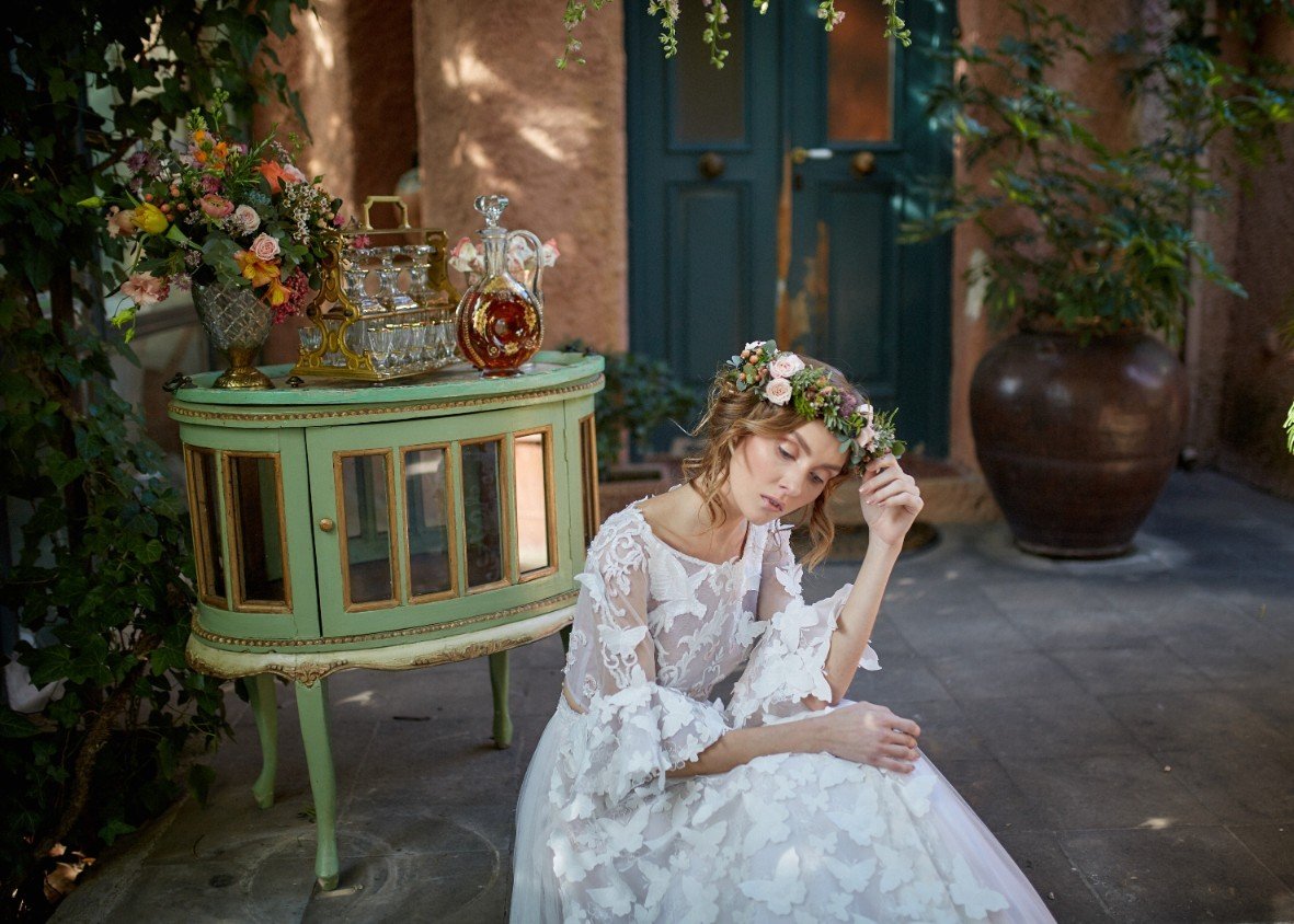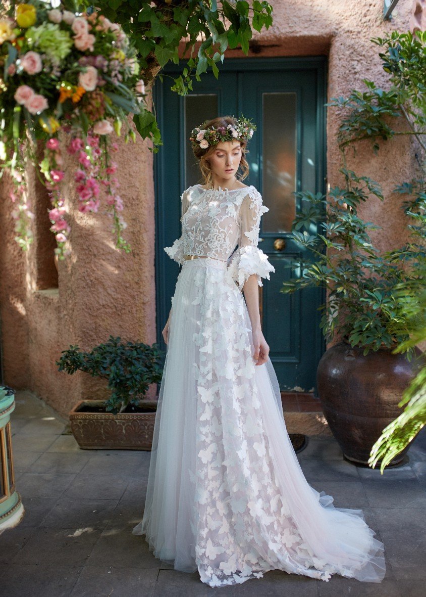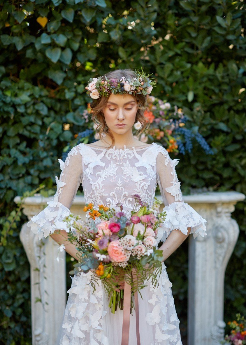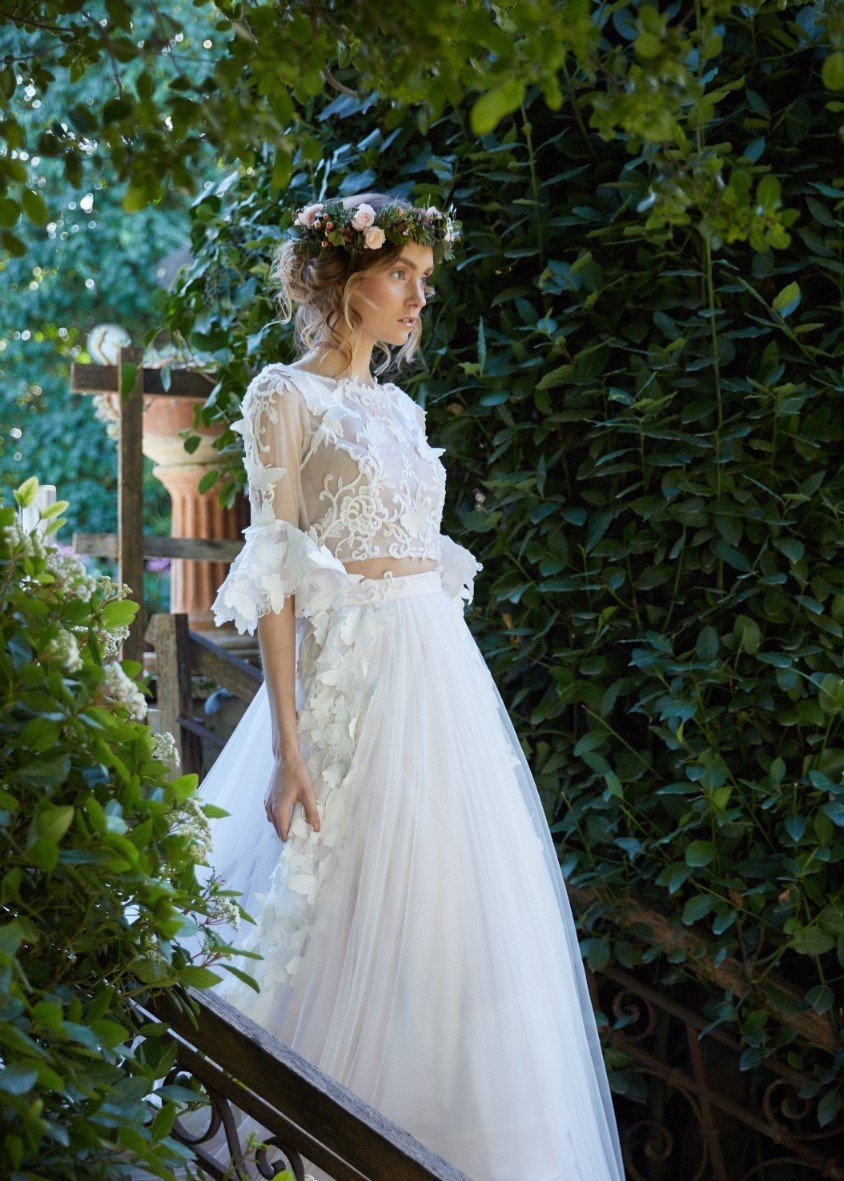 You may have noticed some of this year’s trends for bridal dresses, like bell sleeves or two pieced gowns. We took it a step further with our handmade dress from Made Bride by Antonea. The long flowy skirt was covered with butterflies on each side, which gave the dress the natural volume and flowy movement. The delicate lace top with half bell sleeves, was decorated with birds, butterflies and other embroidery shapes or patterns of the “Enchanted Garden”.