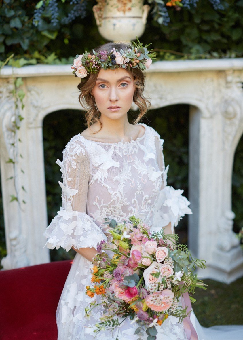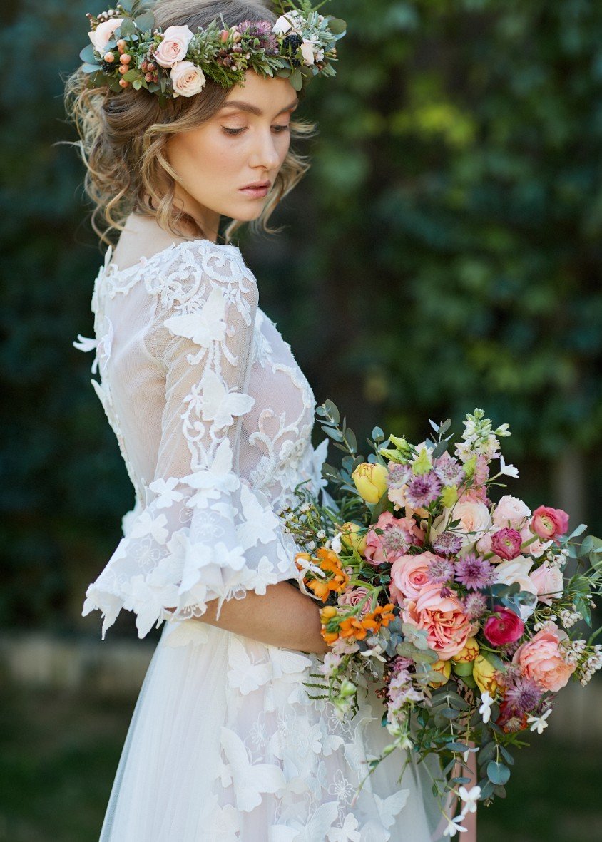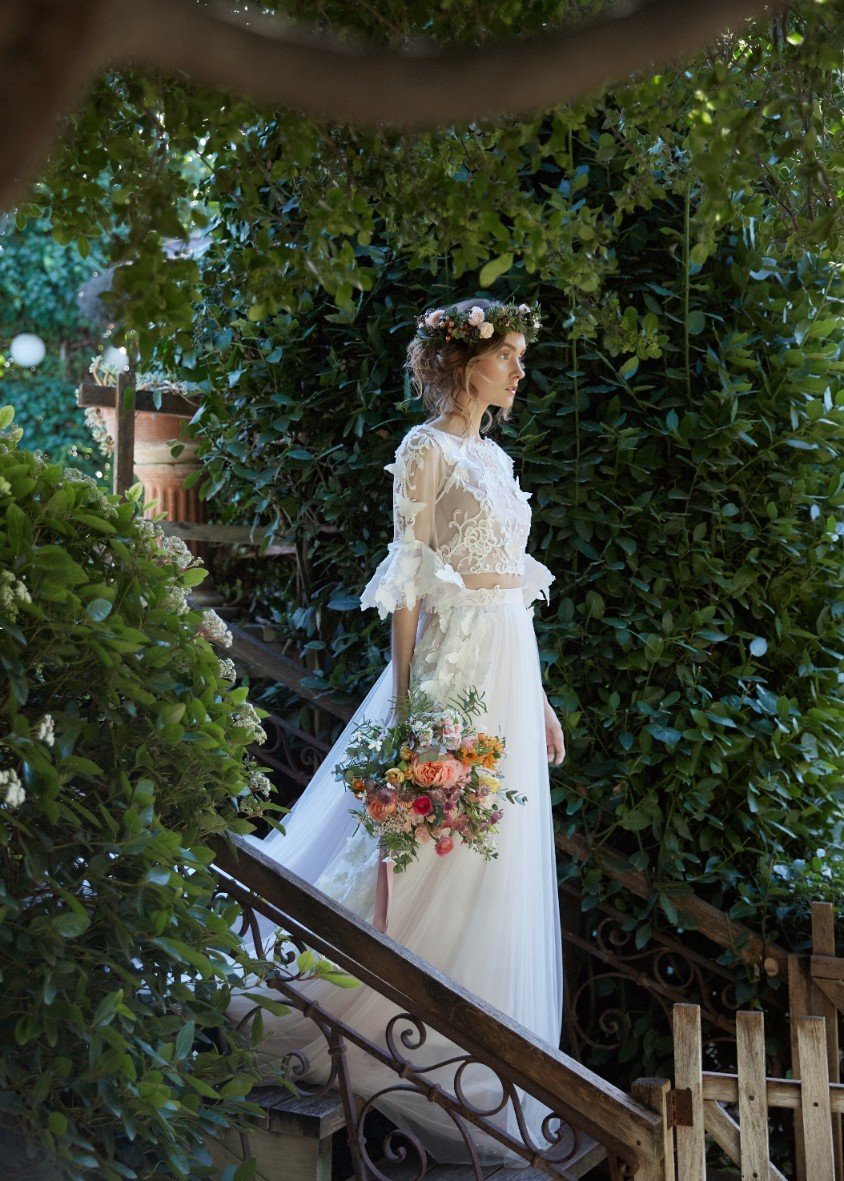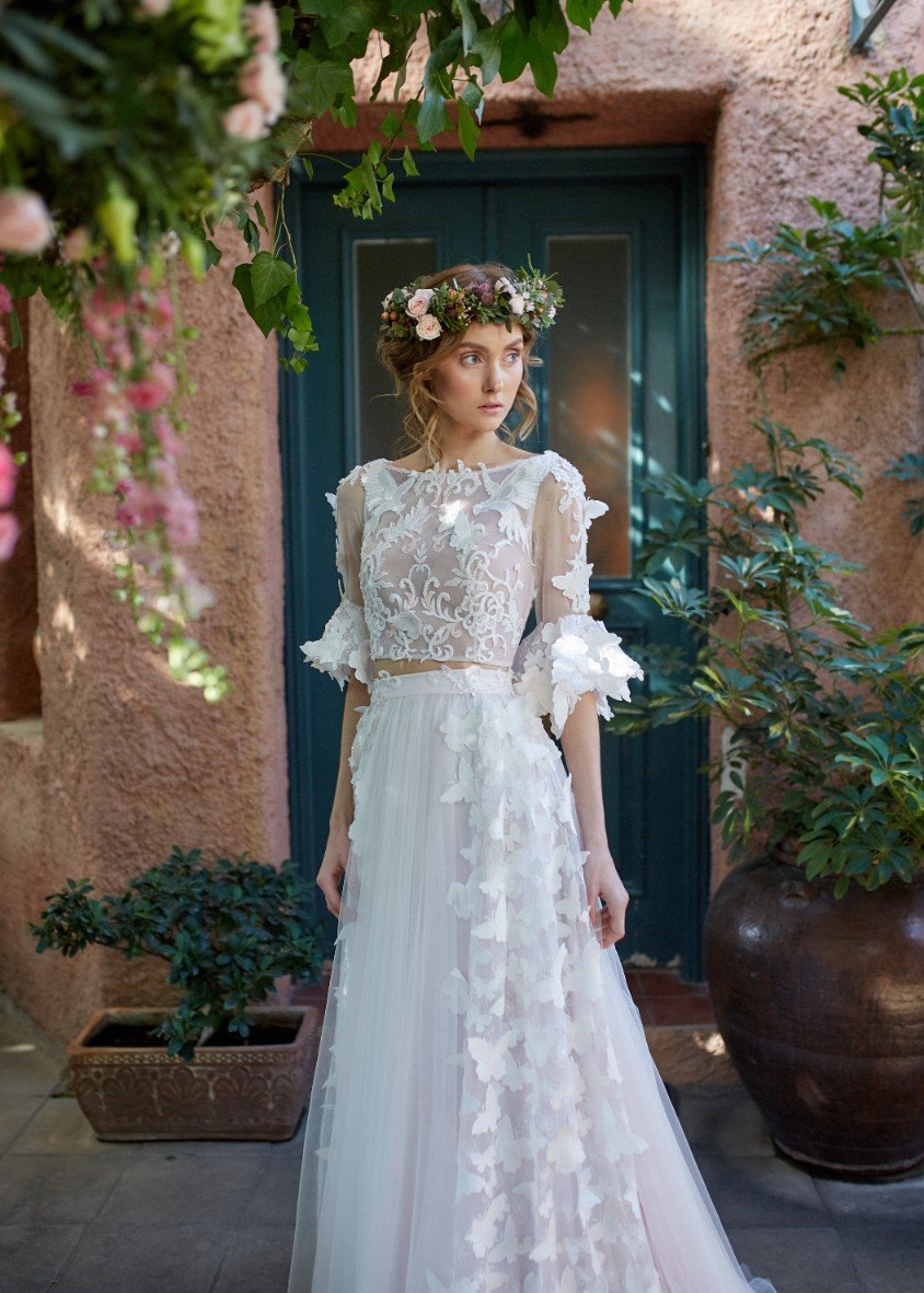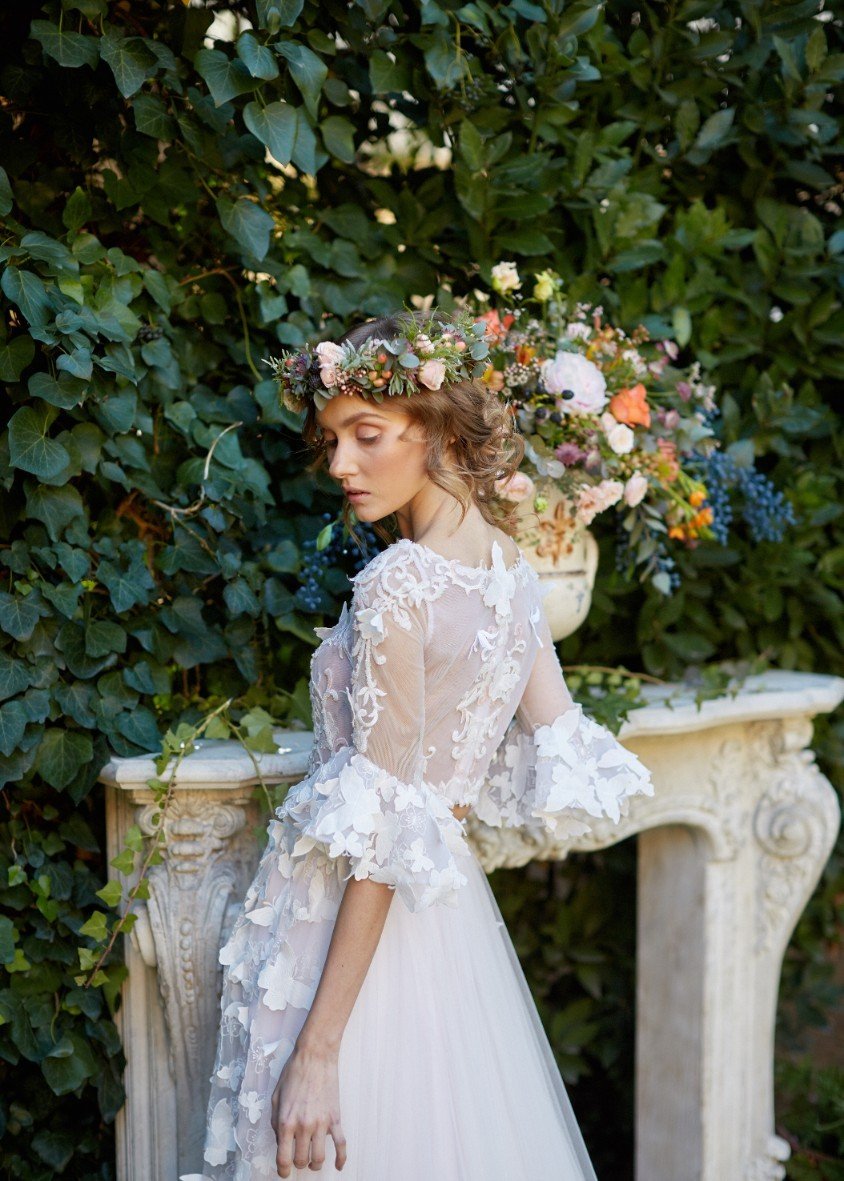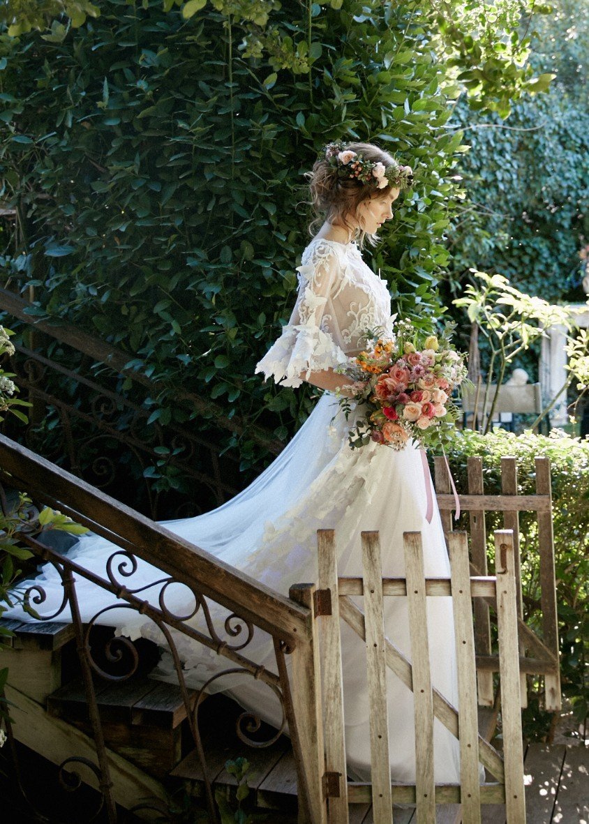 You may have noticed some of this year’s trends for bridal dresses, like bell sleeves or two pieced gowns. We took it a step further with our handmade dress from Made Bride by Antonea. The long flowy skirt was covered with butterflies on each side, which gave the dress the natural volume and flowy movement. The delicate lace top with half bell sleeves, was decorated with birds, butterflies and other embroidery shapes or patterns of the “Enchanted Garden”.