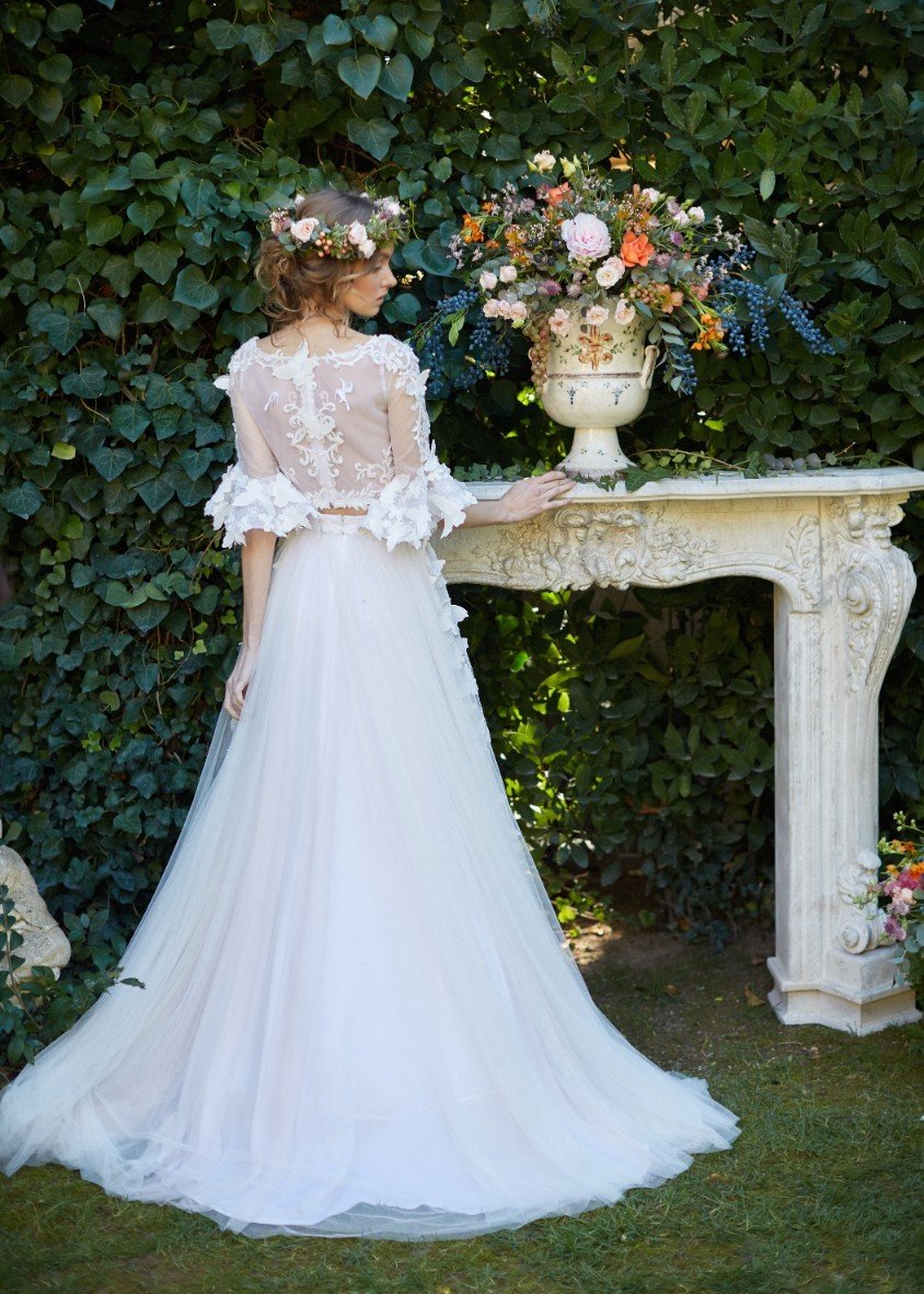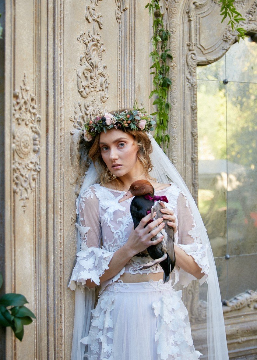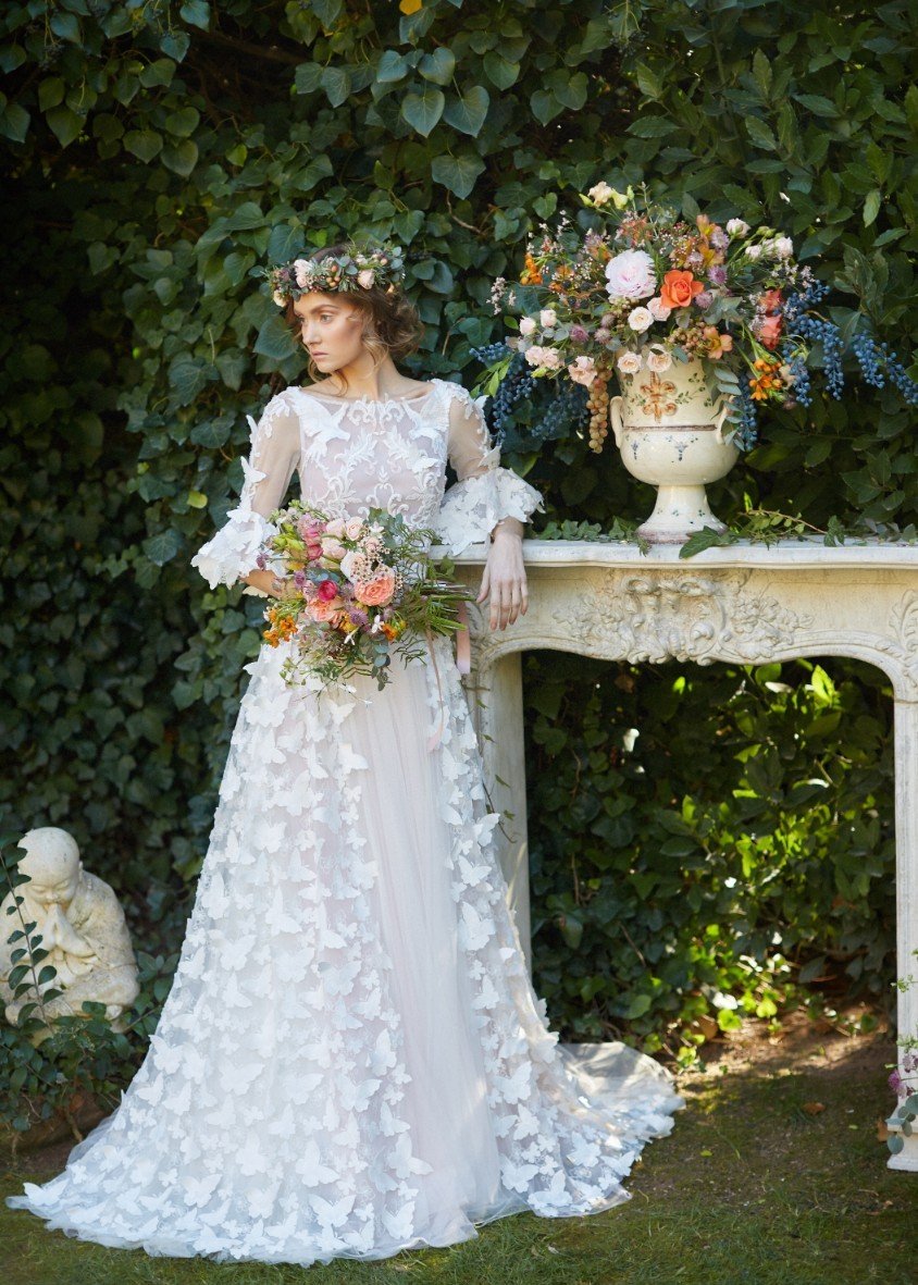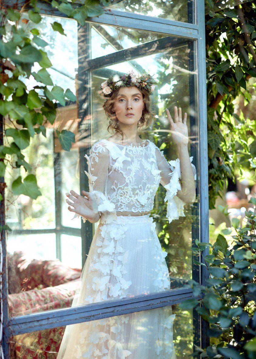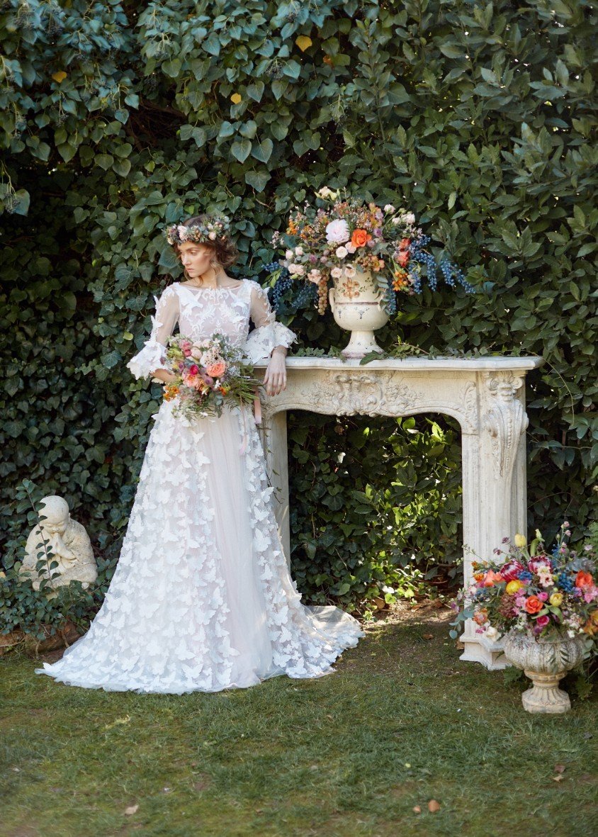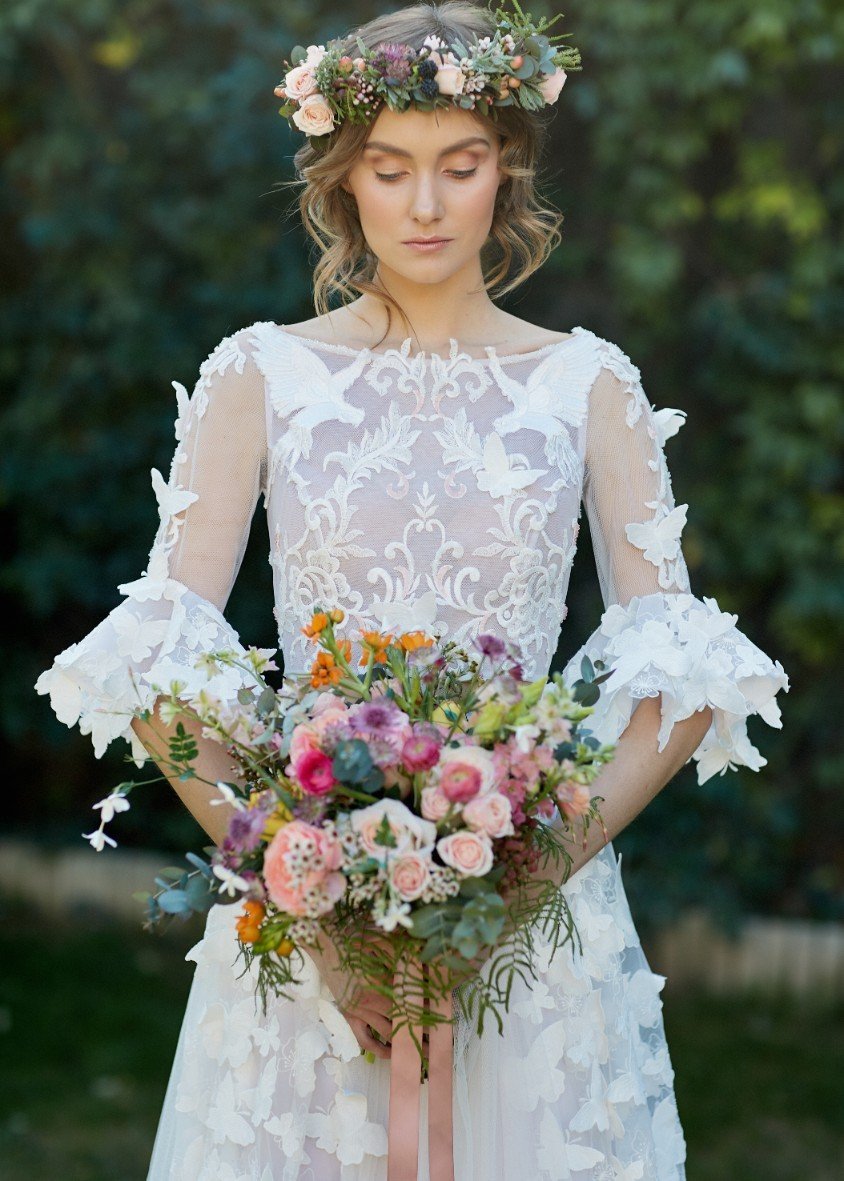 You may have noticed some of this year’s trends for bridal dresses, like bell sleeves or two pieced gowns. We took it a step further with our handmade dress from Made Bride by Antonea. The long flowy skirt was covered with butterflies on each side, which gave the dress the natural volume and flowy movement. The delicate lace top with half bell sleeves, was decorated with birds, butterflies and other embroidery shapes or patterns of the “Enchanted Garden”.