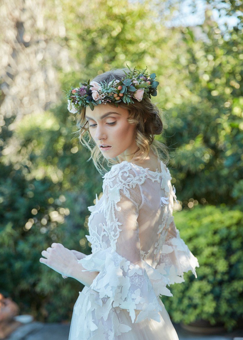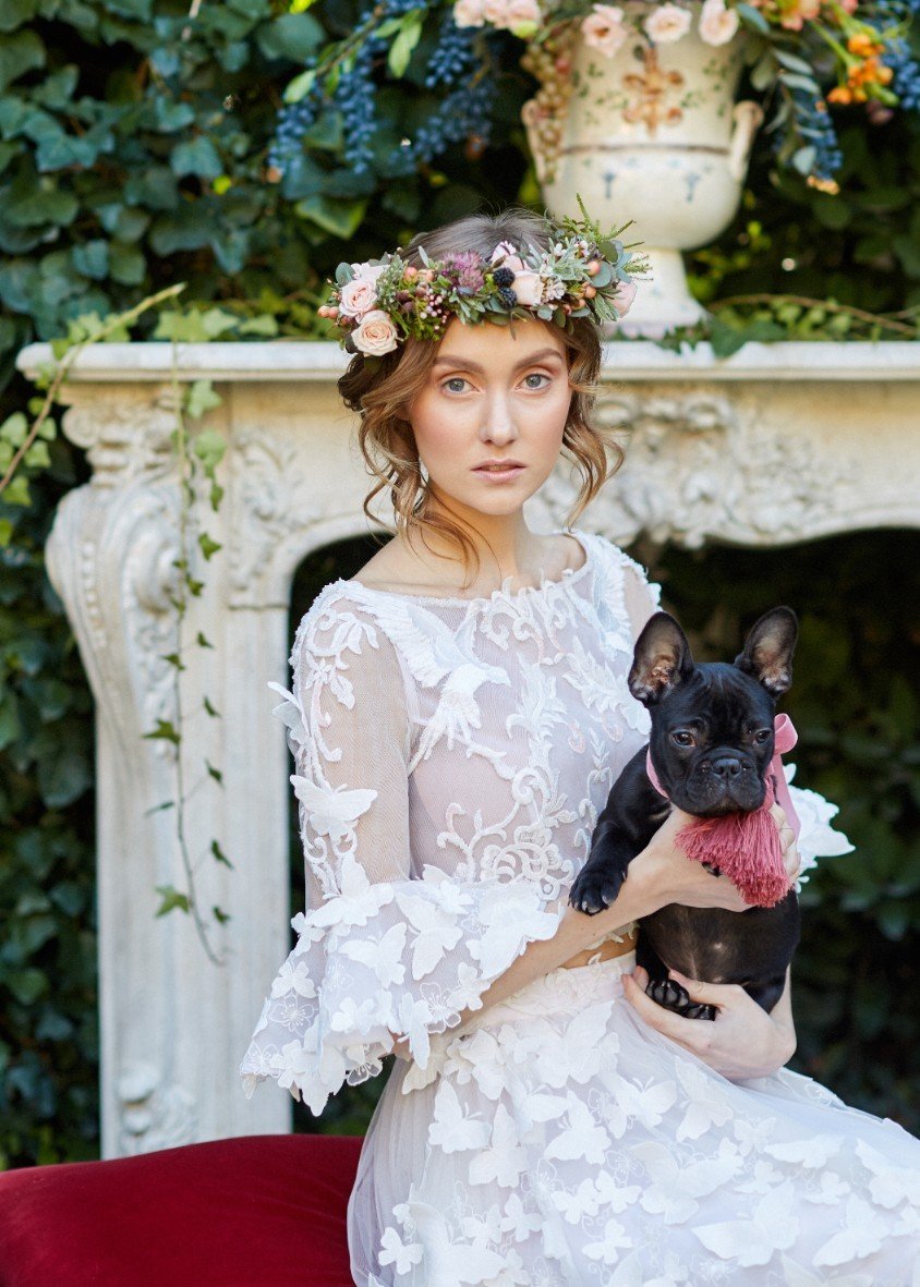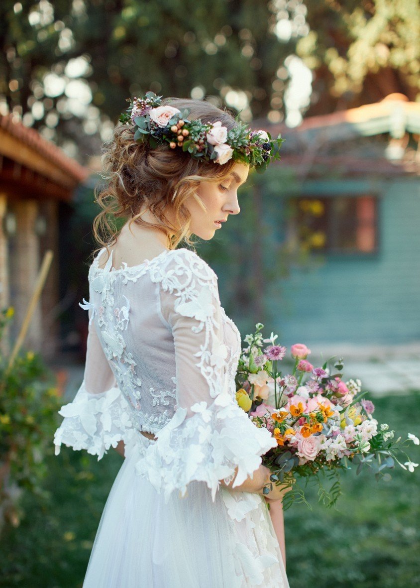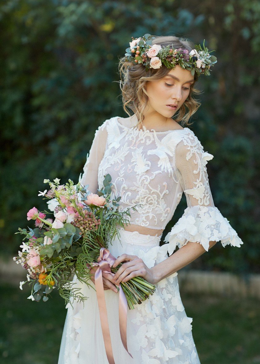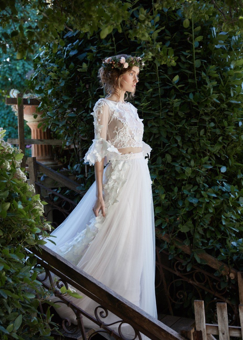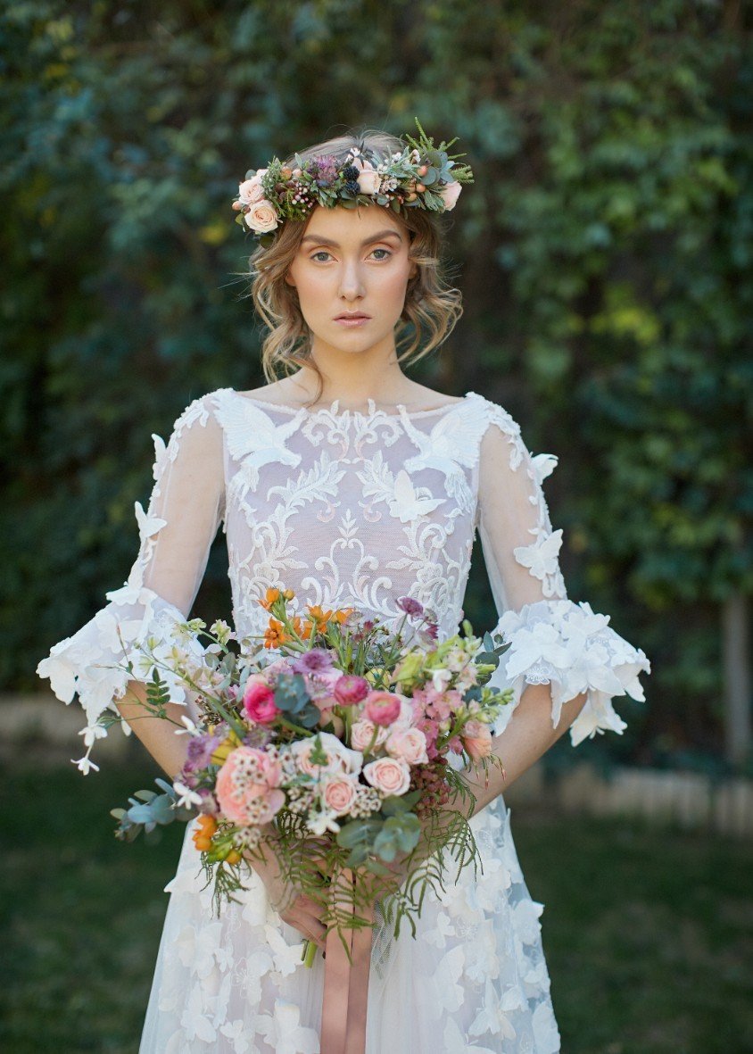 You may have noticed some of this year’s trends for bridal dresses, like bell sleeves or two pieced gowns. We took it a step further with our handmade dress from Made Bride by Antonea. The long flowy skirt was covered with butterflies on each side, which gave the dress the natural volume and flowy movement. The delicate lace top with half bell sleeves, was decorated with birds, butterflies and other embroidery shapes or patterns of the “Enchanted Garden”.