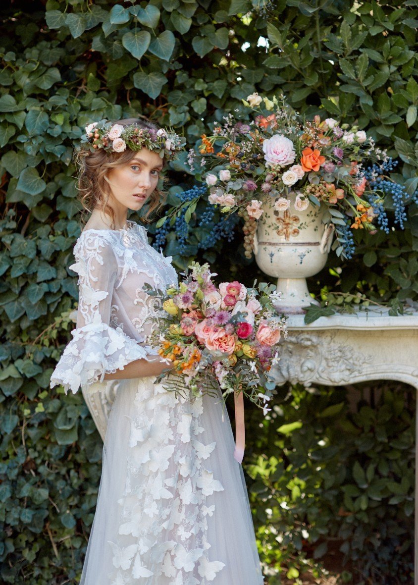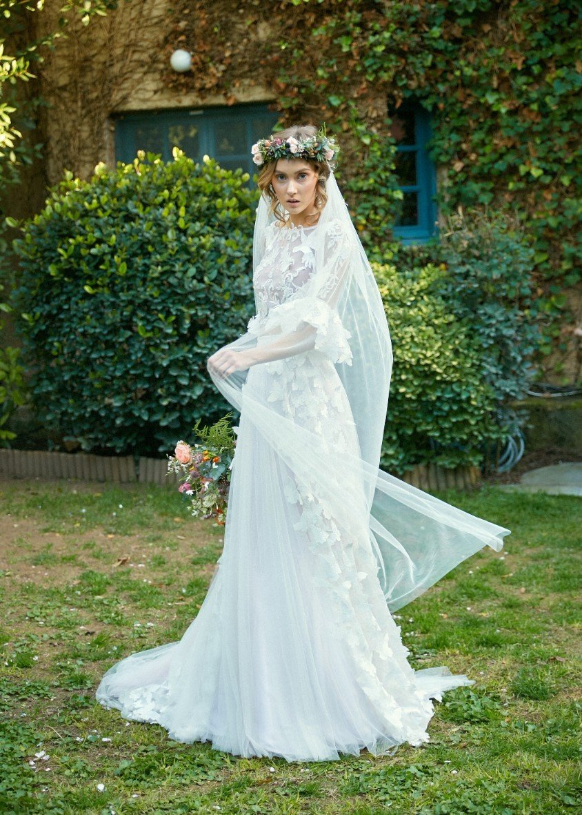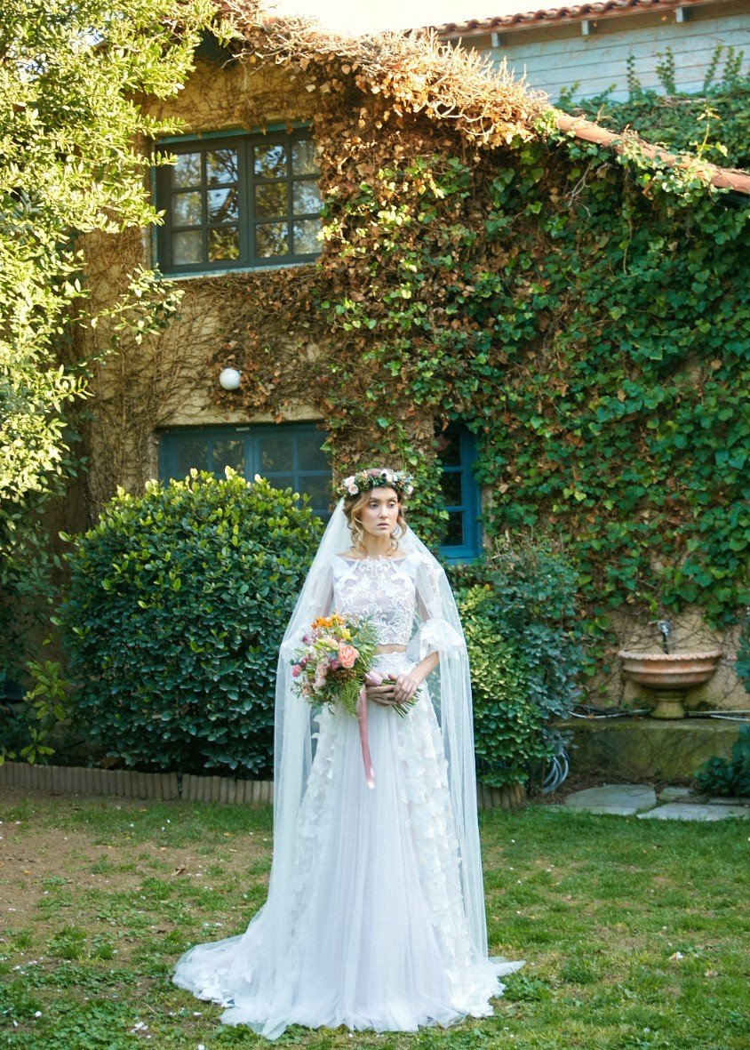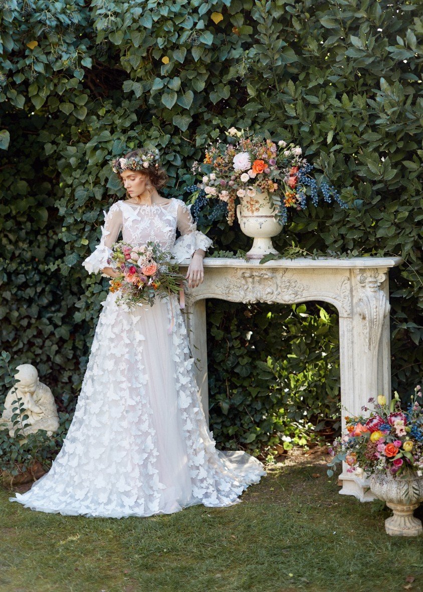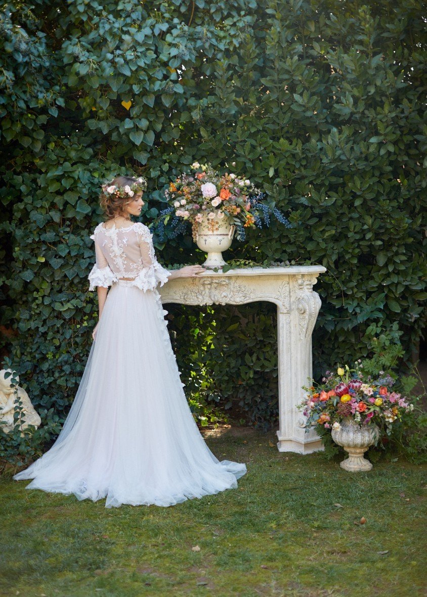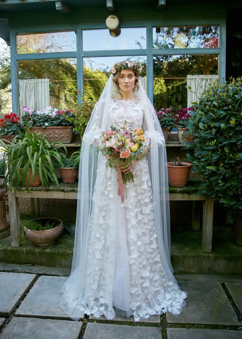 You may have noticed some of this year’s trends for bridal dresses, like bell sleeves or two pieced gowns. We took it a step further with our handmade dress from Made Bride by Antonea. The long flowy skirt was covered with butterflies on each side, which gave the dress the natural volume and flowy movement. The delicate lace top with half bell sleeves, was decorated with birds, butterflies and other embroidery shapes or patterns of the “Enchanted Garden”.
