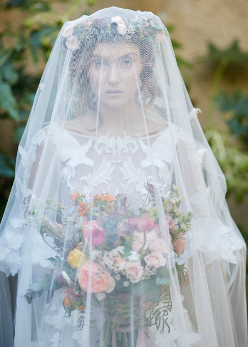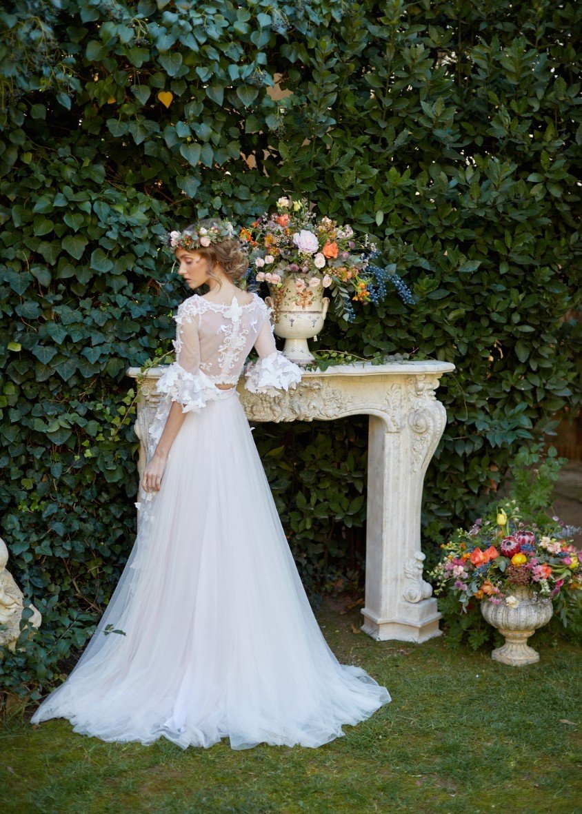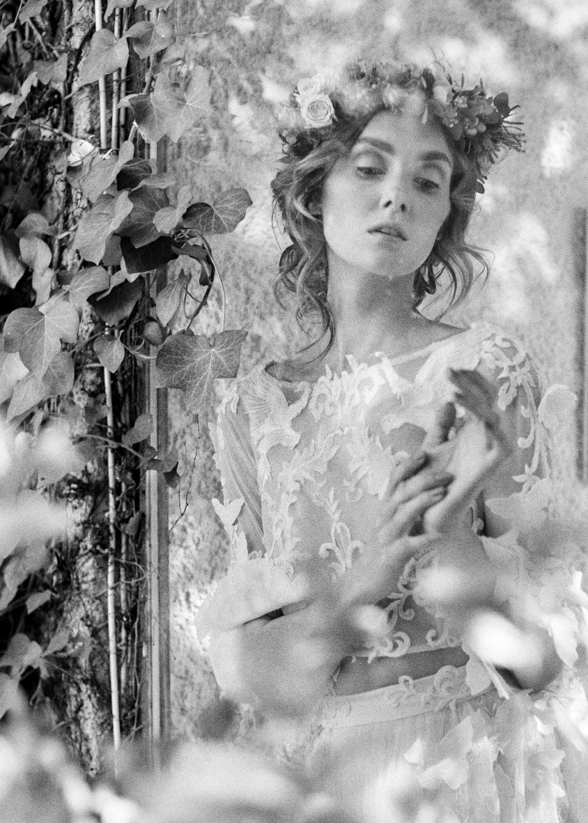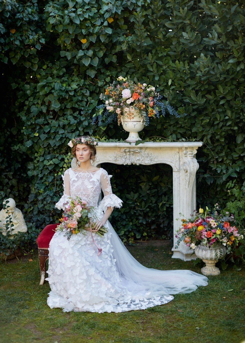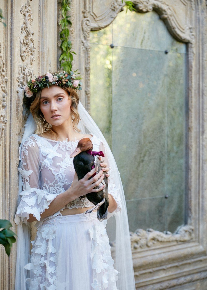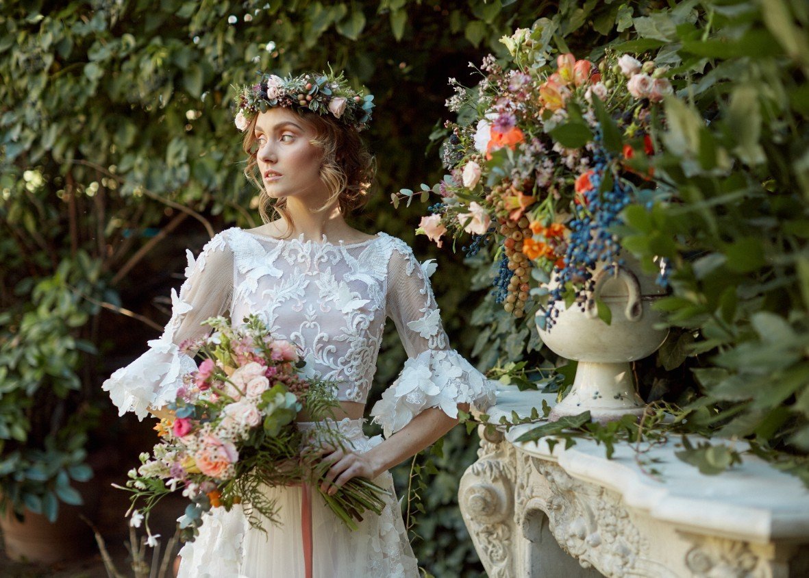 You may have noticed some of this year’s trends for bridal dresses, like bell sleeves or two pieced gowns. We took it a step further with our handmade dress from Made Bride by Antonea. The long flowy skirt was covered with butterflies on each side, which gave the dress the natural volume and flowy movement. The delicate lace top with half bell sleeves, was decorated with birds, butterflies and other embroidery shapes or patterns of the “Enchanted Garden”.
