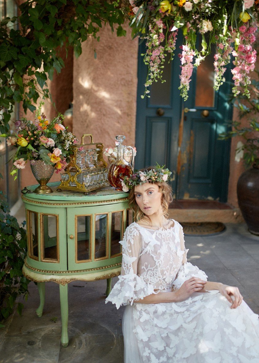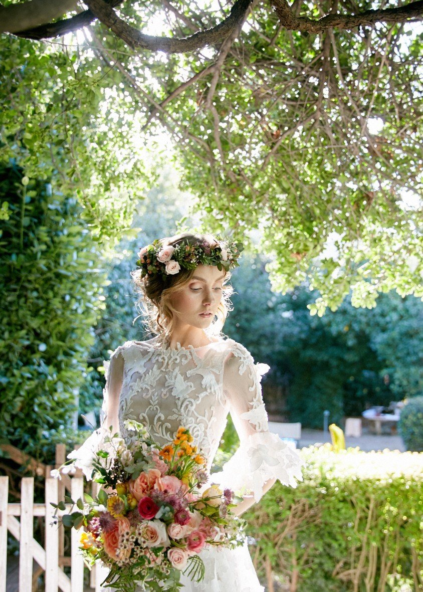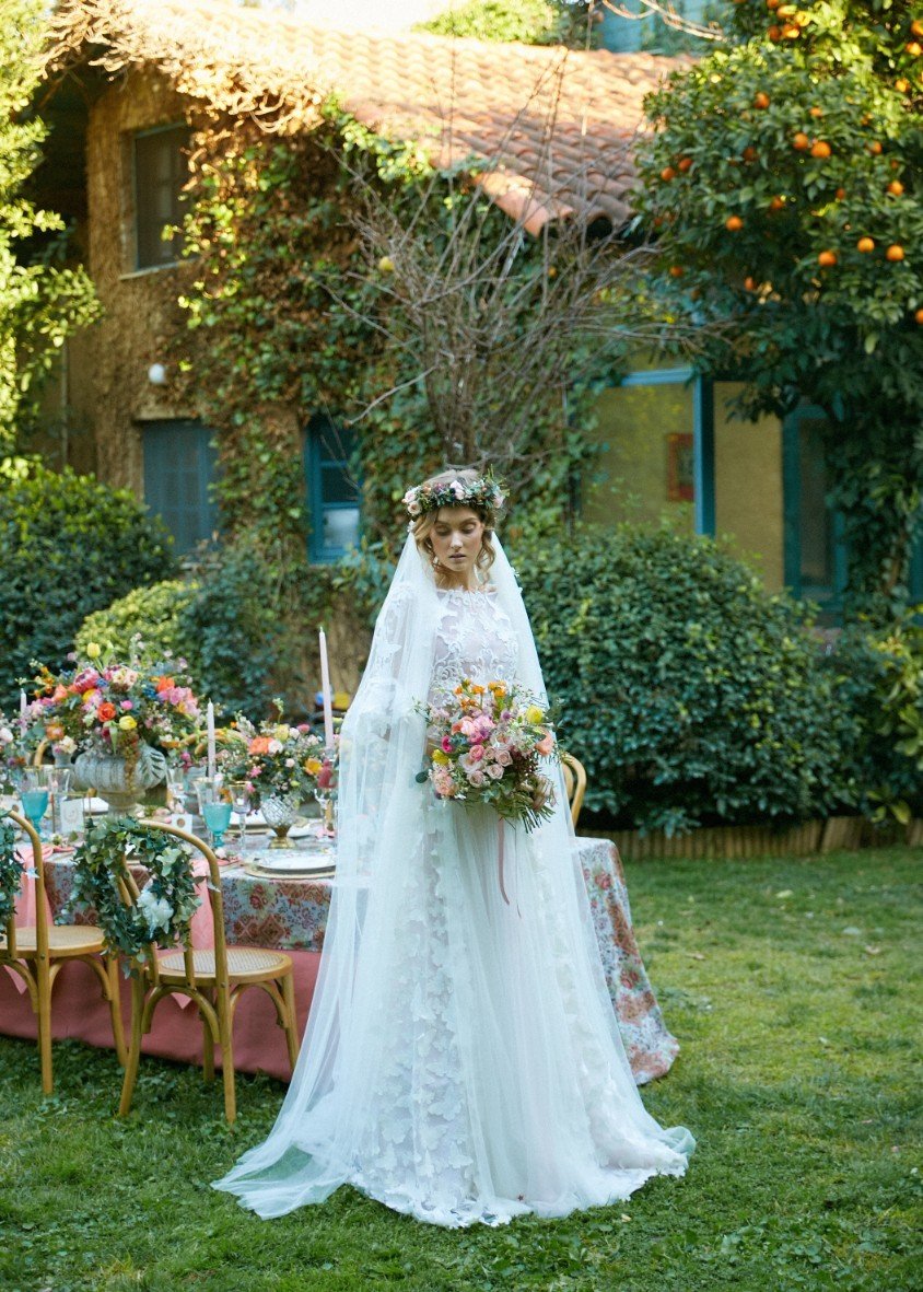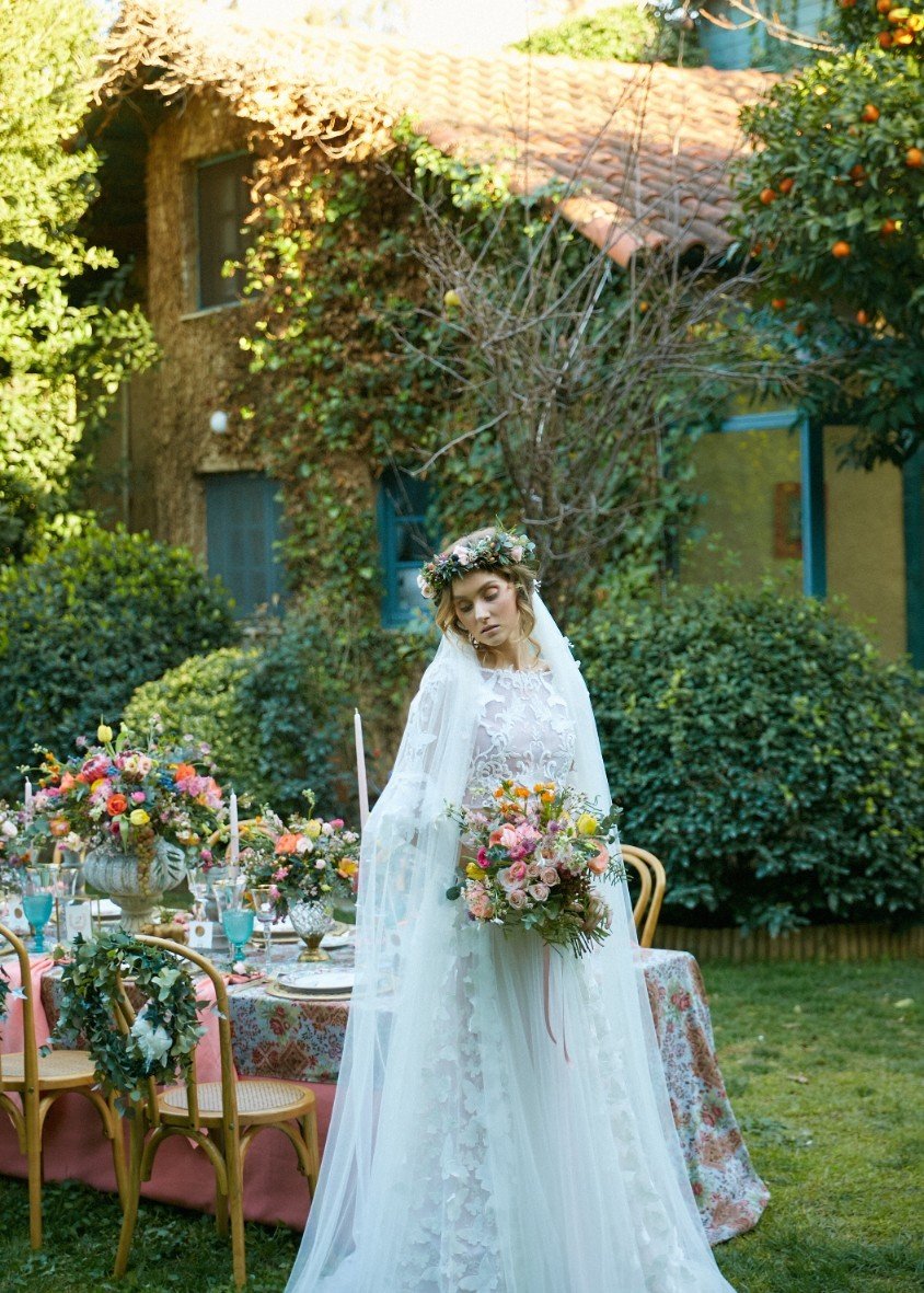 Embrace nature, think of your selected venue. In our case this was a private villa with a true secret backyard, hidden in the middle of the cement jungle in Athens. This venue was perfect for our “Secret Garden” themed editorial with its own glass winter garden gazebo, a picturesque shed, with greenery, orange and almond trees, bushes and flowers fresh in bloom.