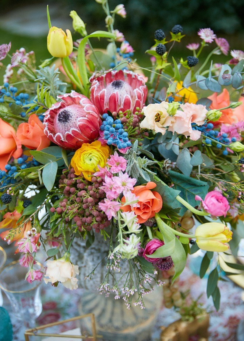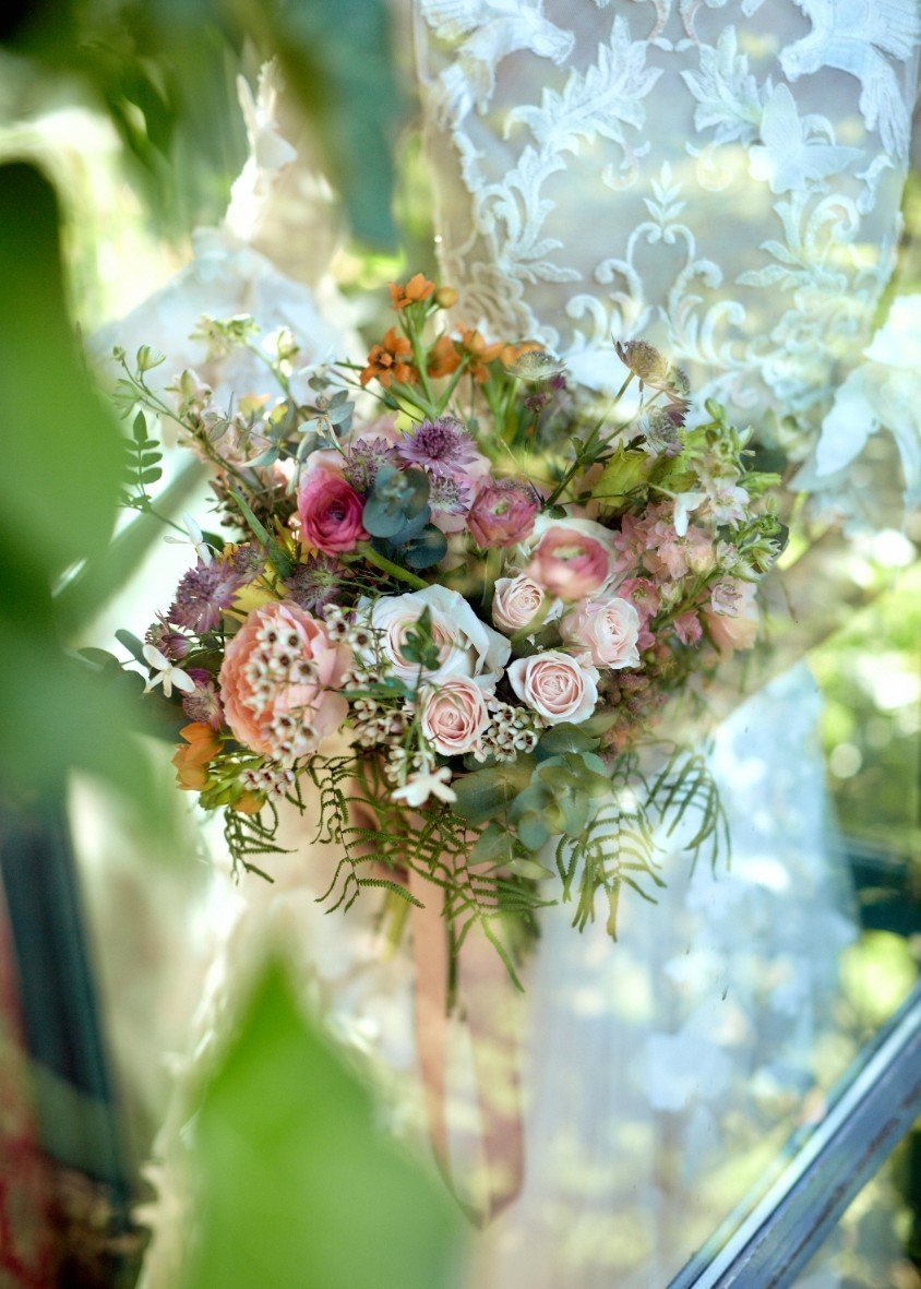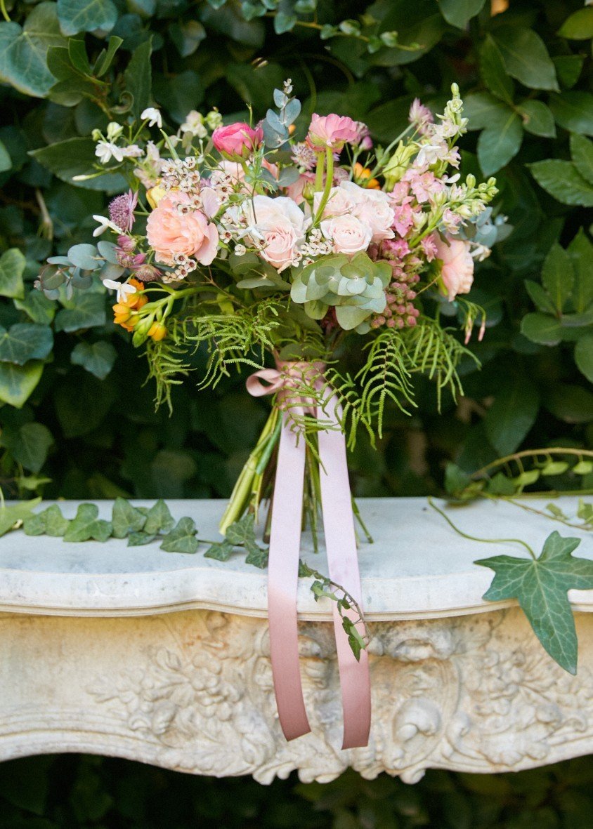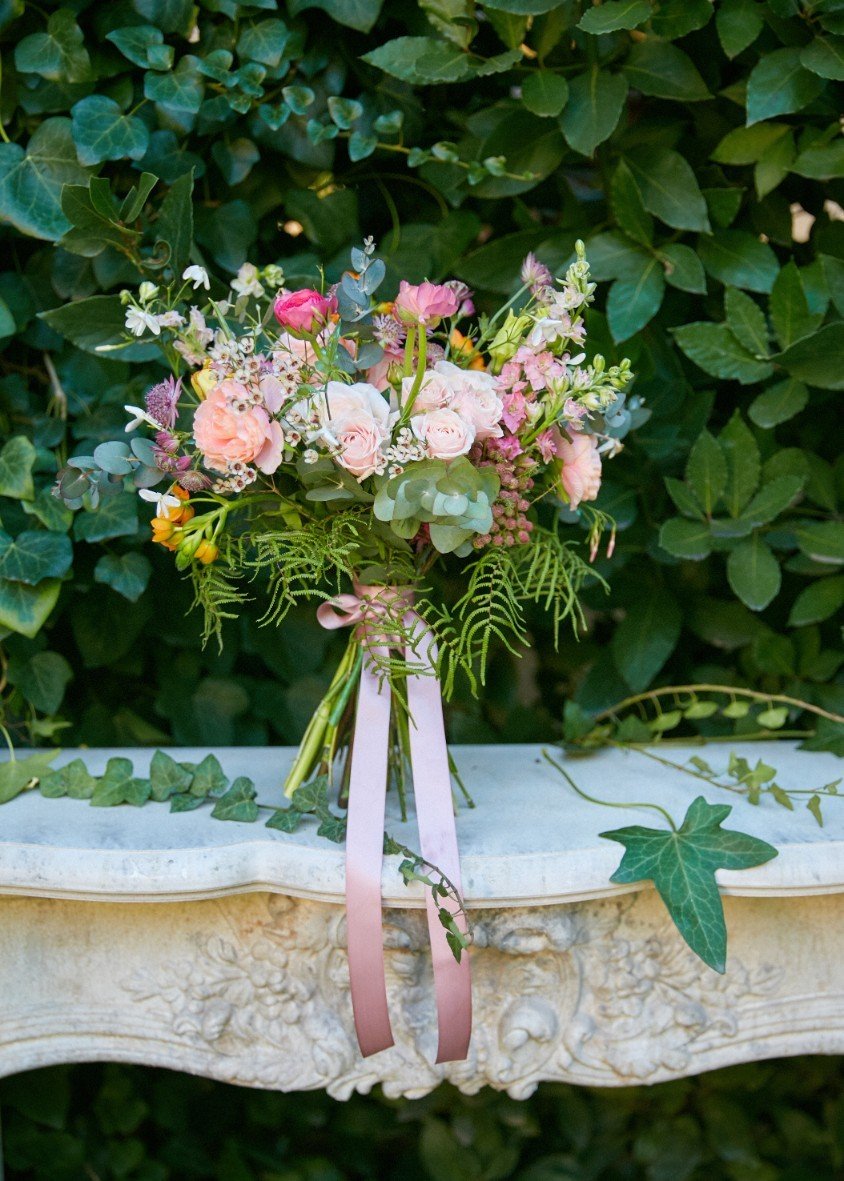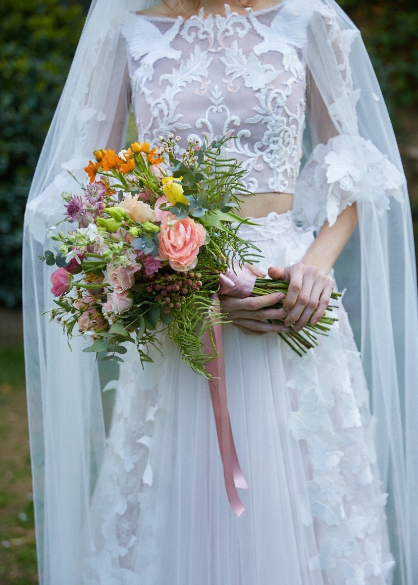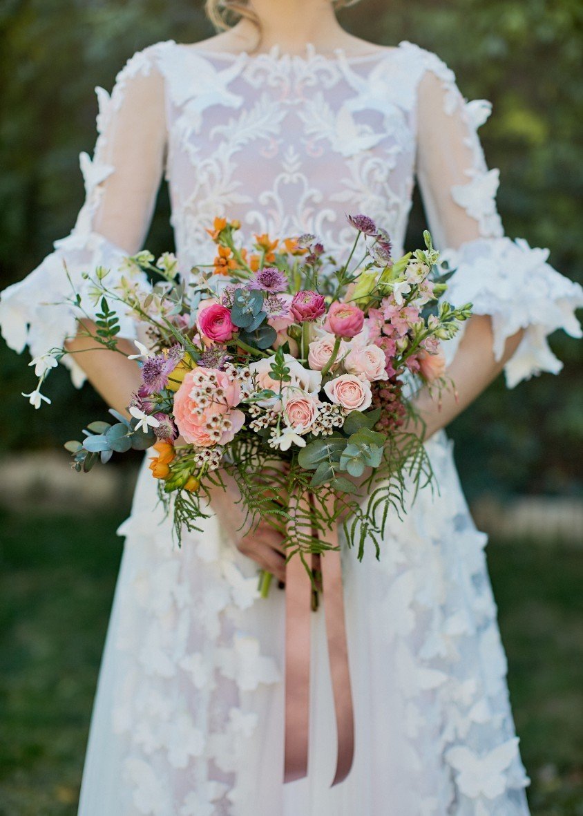 Studio 7 Florescence hand crafted all floral arrangements as well as this beautiful spring inspired bridal bouquet following the new trending flowy ikebana style with a variety of colourful flowers and greens. From Ranunculus to a simple Rose and local delicate wild flowers. The objective here, was more colour, less greens.