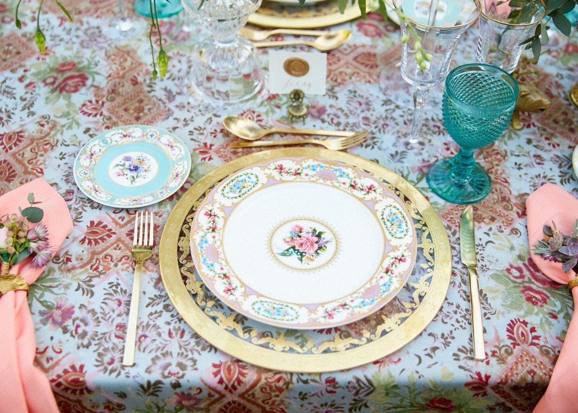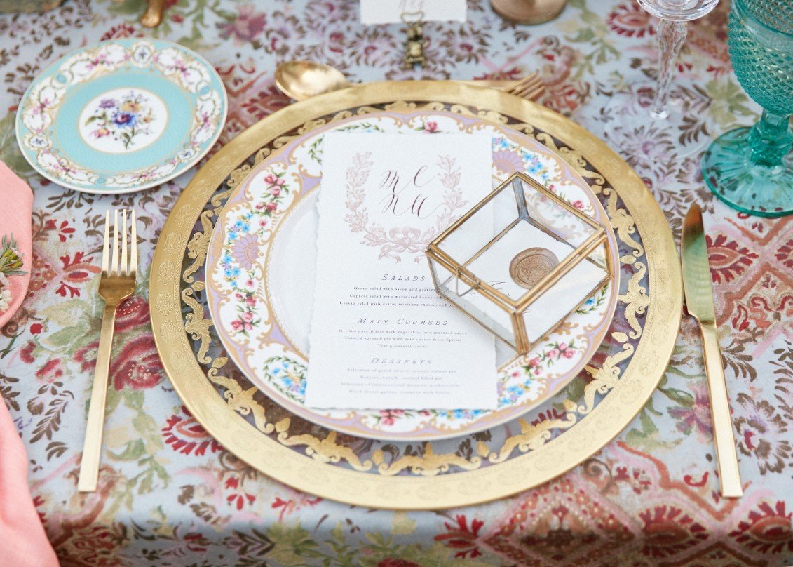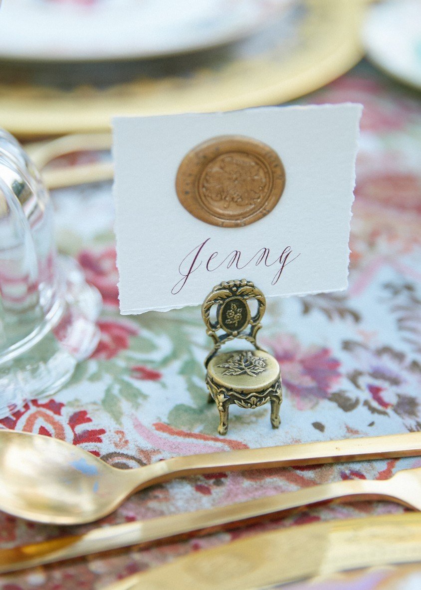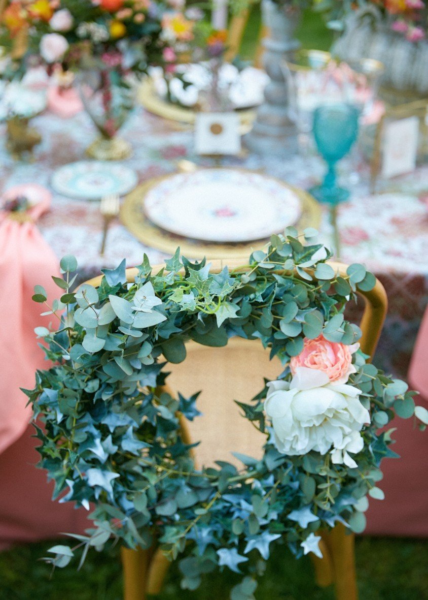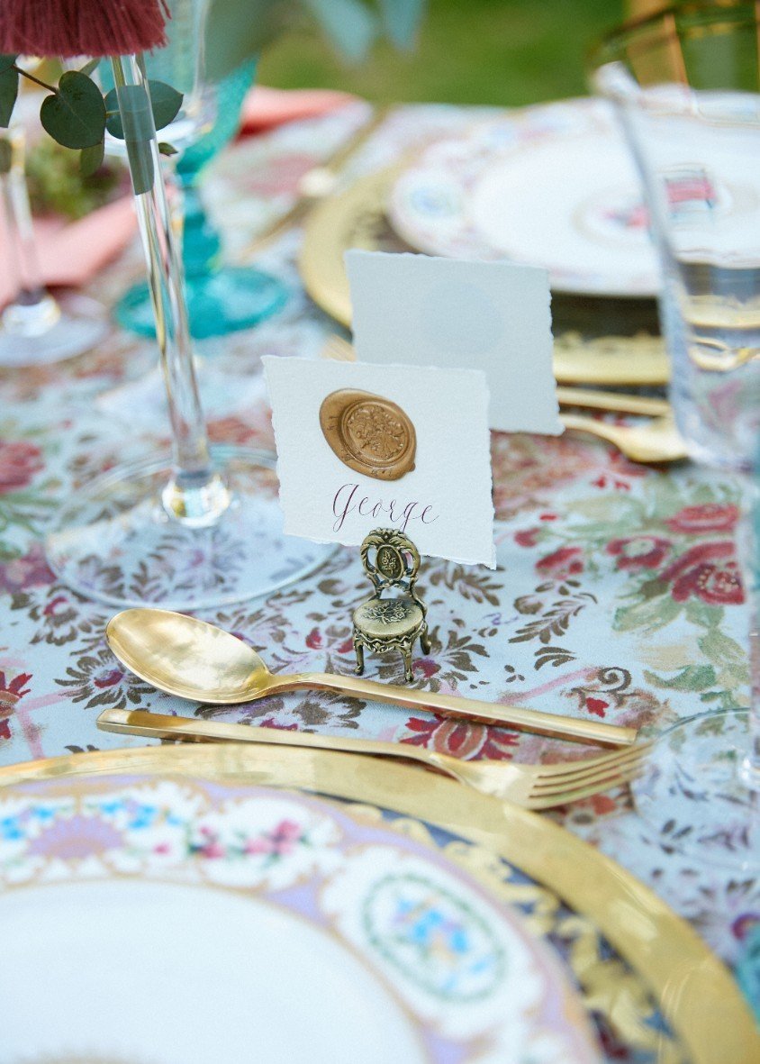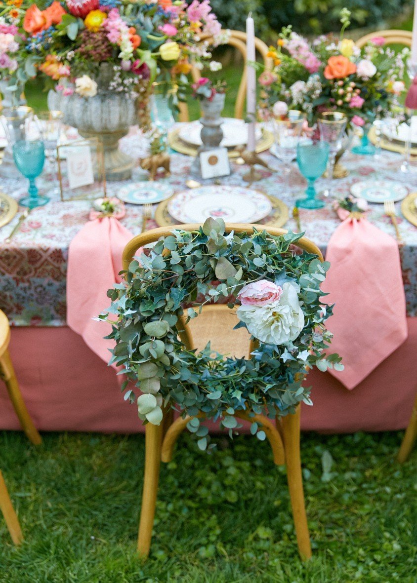 A remarkable table with a spectacular colourful velvet tablecloth, full of patterns, candles and even miniature animals was set up by Anjie and her team. All rentals from White Lilac and Style Box filled the table with lavish sets of dinnerware and other components like these selected chairs. Each chair was decorated with floral wreaths by Studio 7 Florescence, who also created all floral centrepieces, which harmoniously corresponded with the overall luxe table setting. To complete the look, Atelier Invitations crafted their signature stationery with place cards, personalised menus and table numbers all thoughtfully designed to fit the theme of the day.