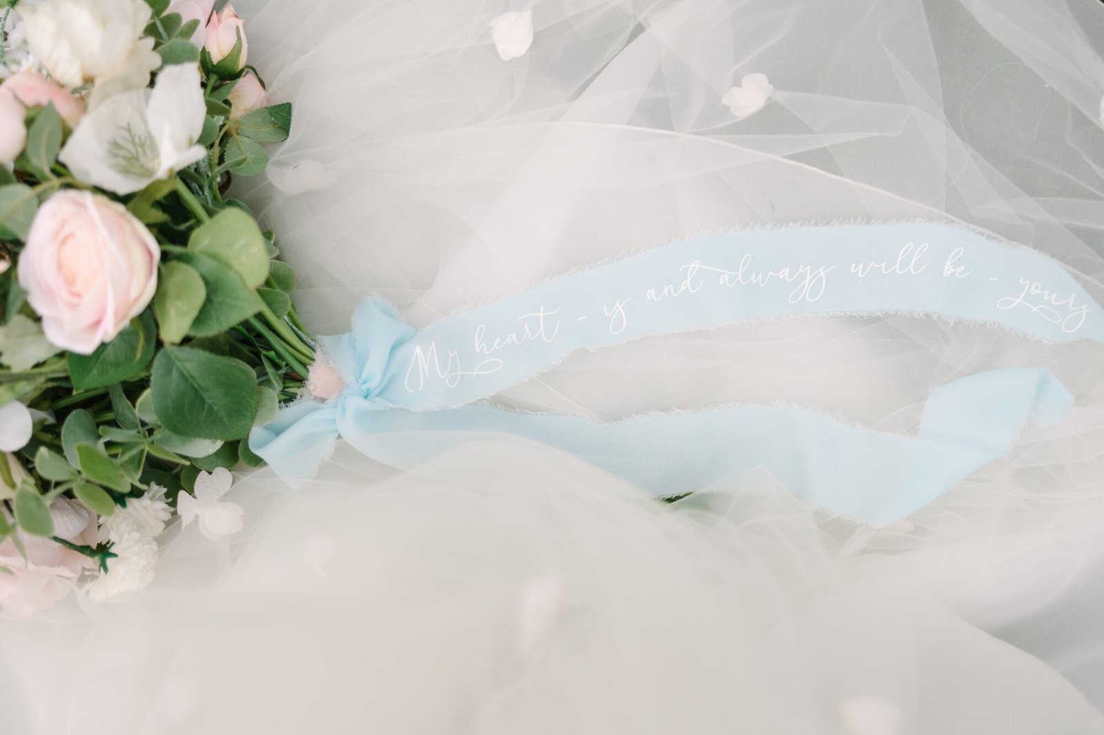 Personalized bouquet ribbons add movement and story to your florals without taking up any space in your luggage. They are made with heat transfer vinyl on your choice of ribbon with couples personalizing with their wedding date, a favorite quote, or even a message to one another. Author of Cricut Weddings and wedding DIY expert Chelsea recommends rolling your ribbons on a wooden spool or a cardboard tube to keep these keepsake ribbons pristine while traveling.