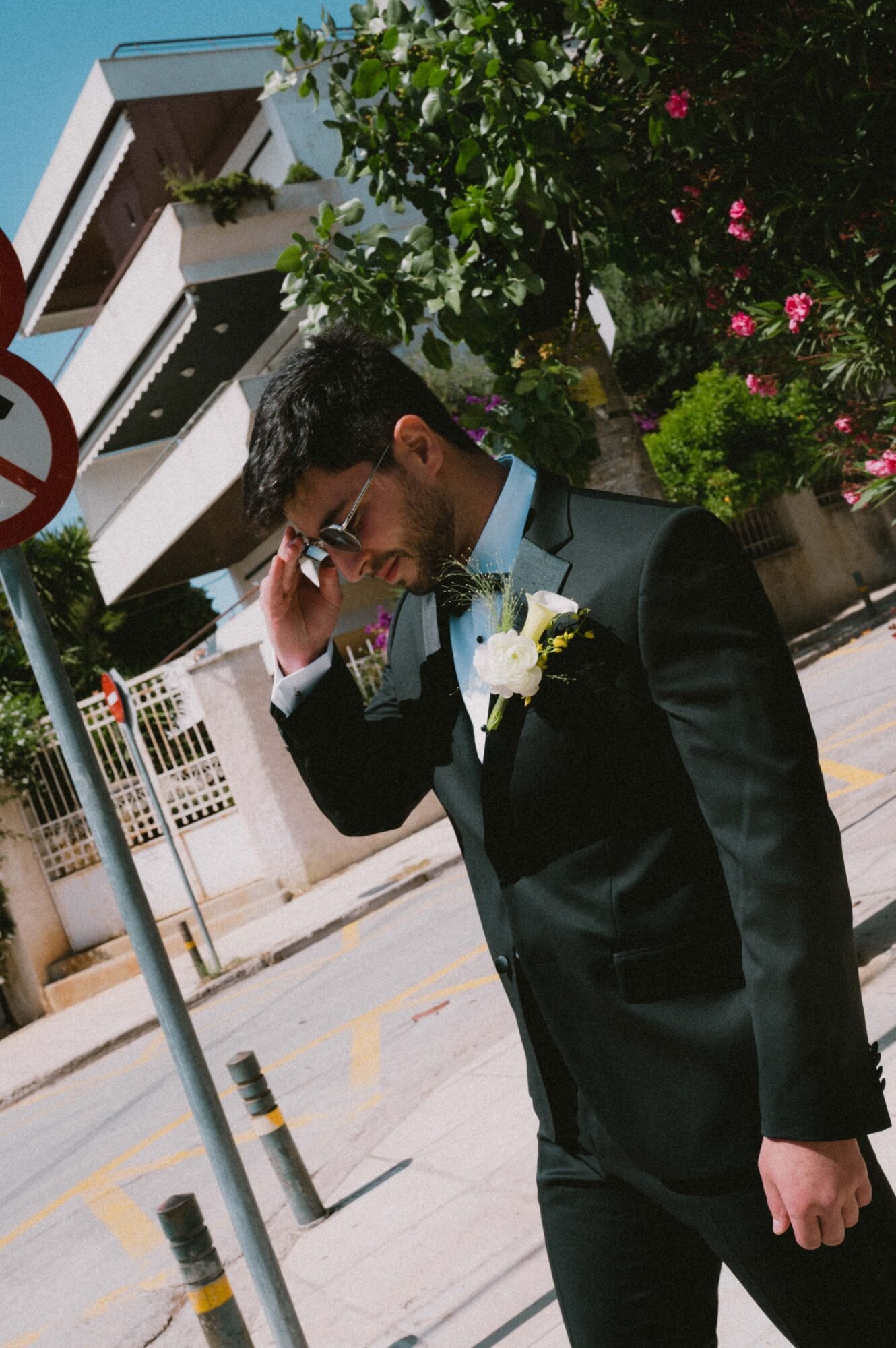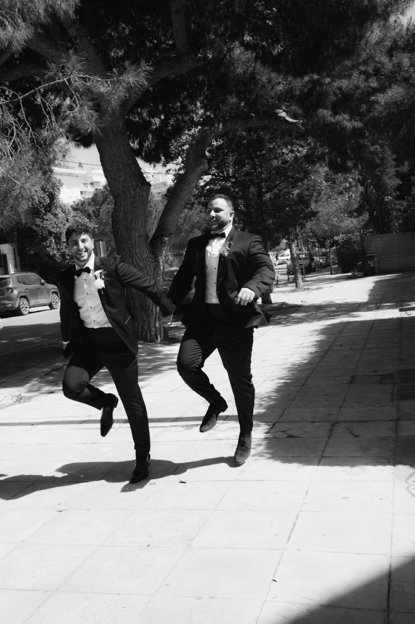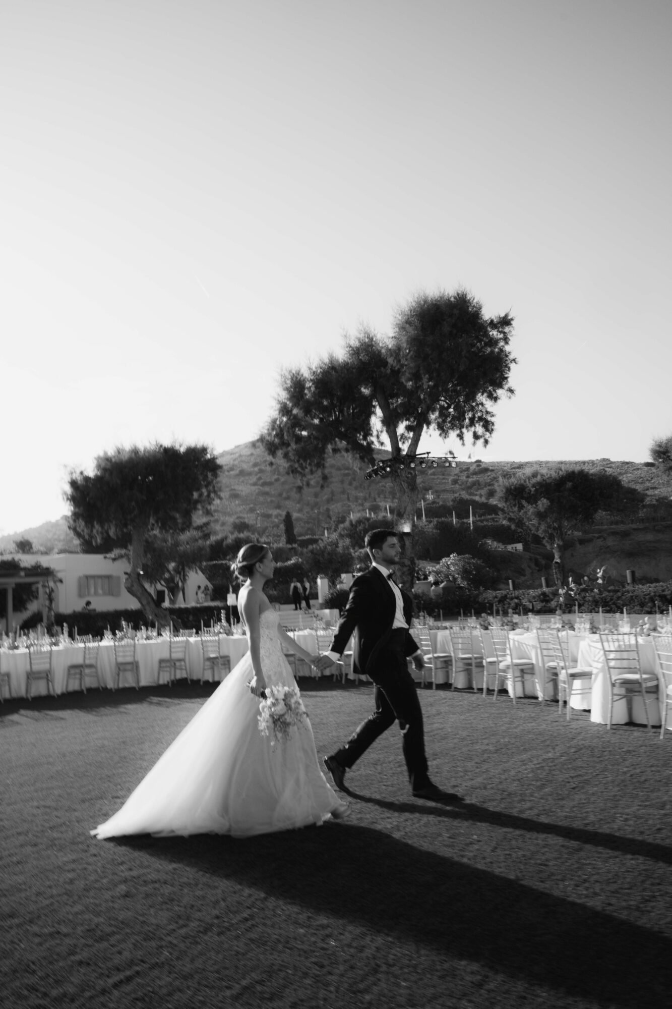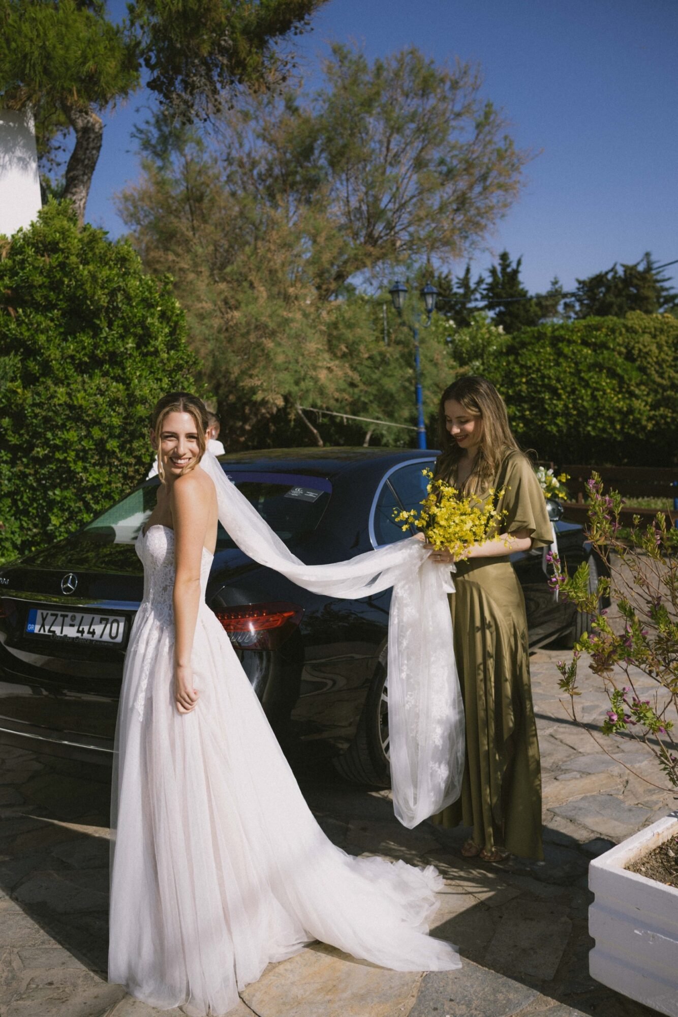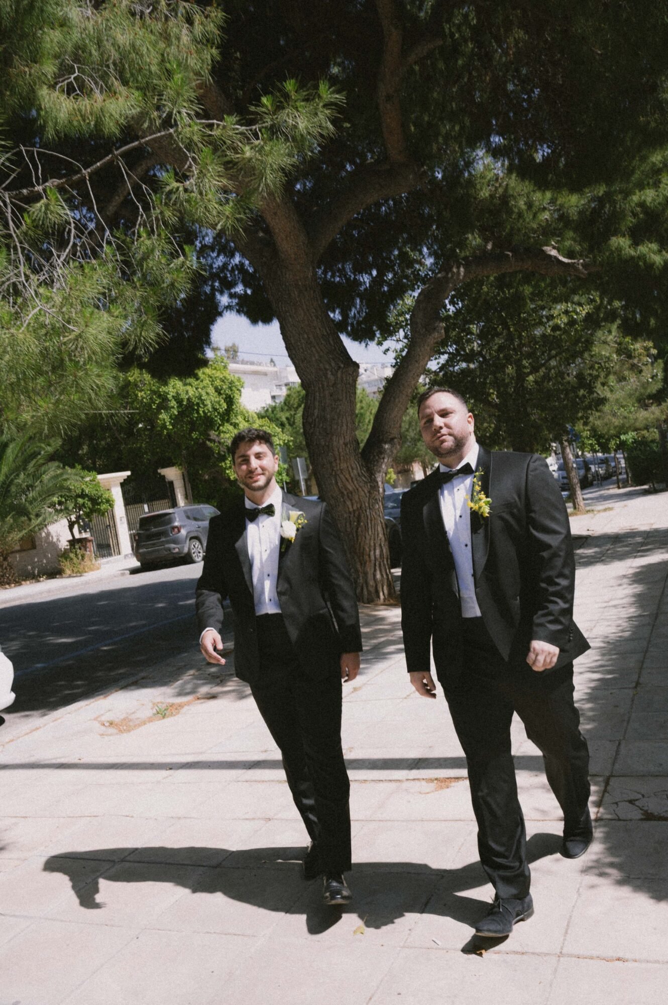 The groom and his “koumbaro” or groomsman exuded timeless sophistication, both dressed in matching black tuxedos from BOSS. The tuxedos featured sleek lines and a classic silhouette that conveyed elegance and modernity. Each ensemble was paired with a crisp white shirt and a sharp black bow tie, adding a touch of formal refinement. The deep black fabric offered a striking contrast to the natural, sunlit surroundings. Together, their coordinated look perfectly complemented the wedding’s chic, contemporary aesthetic.