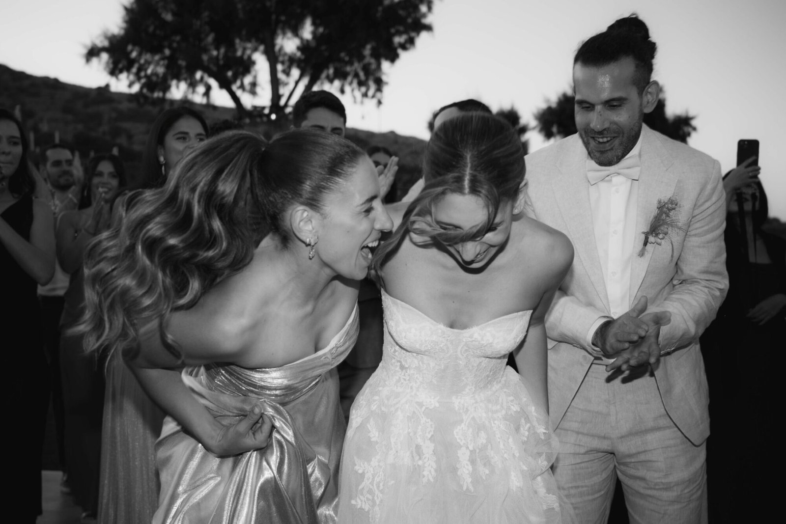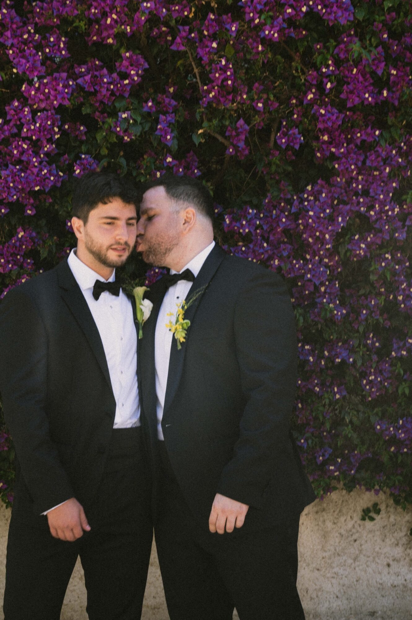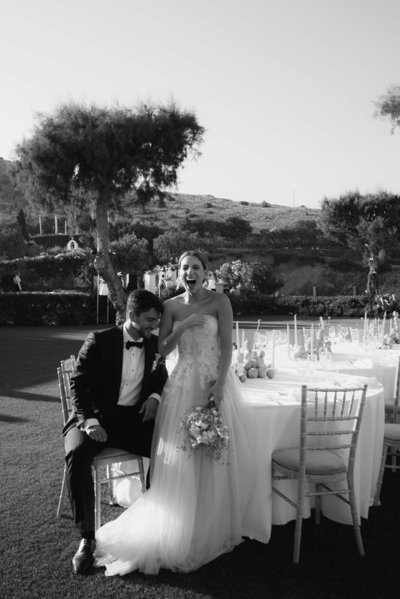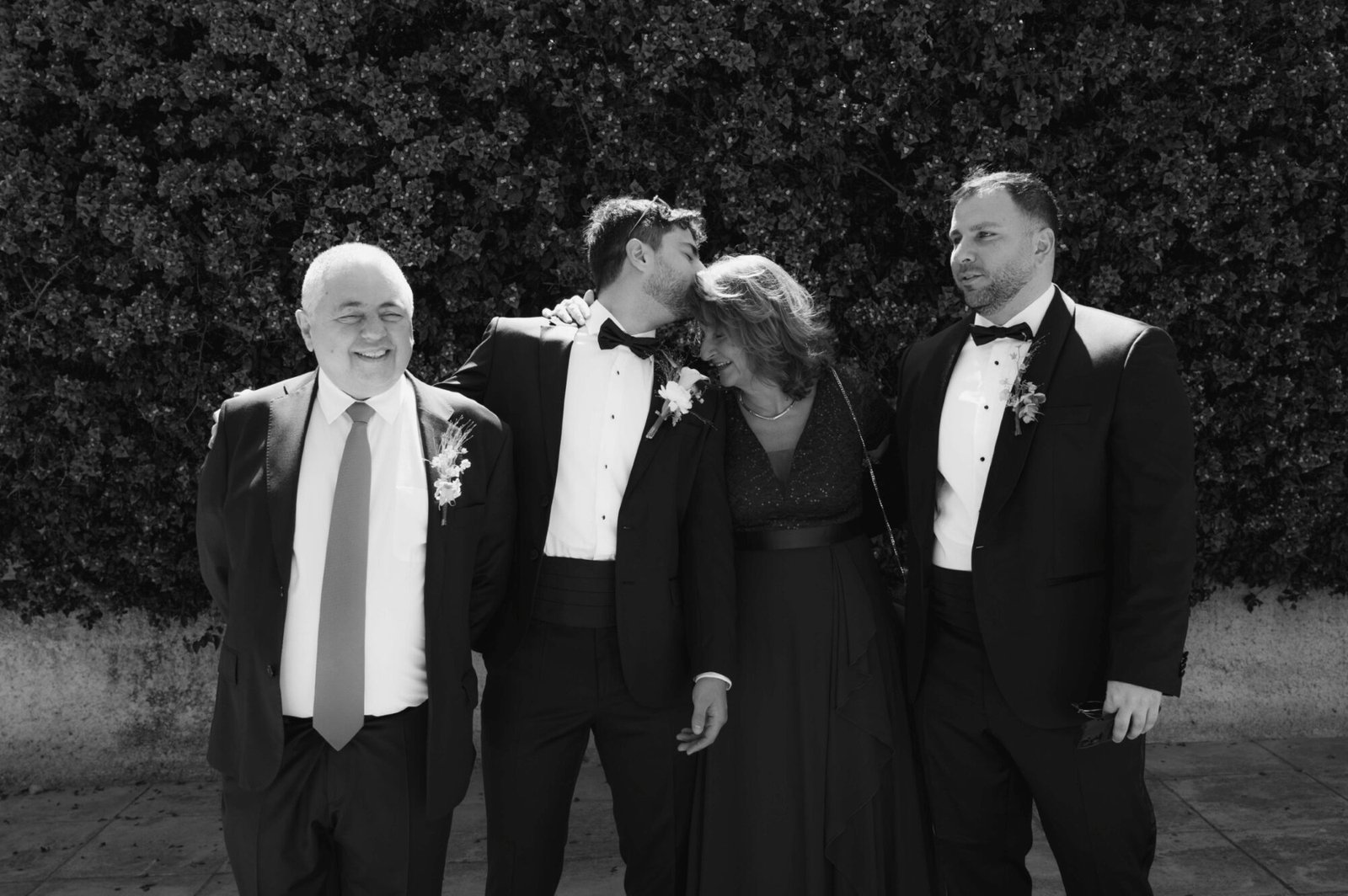 The groom and his “koumbaro” or groomsman exuded timeless sophistication, both dressed in matching black tuxedos from BOSS. The tuxedos featured sleek lines and a classic silhouette that conveyed elegance and modernity. Each ensemble was paired with a crisp white shirt and a sharp black bow tie, adding a touch of formal refinement. The deep black fabric offered a striking contrast to the natural, sunlit surroundings. Together, their coordinated look perfectly complemented the wedding’s chic, contemporary aesthetic.