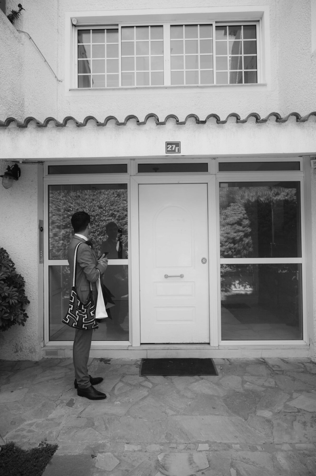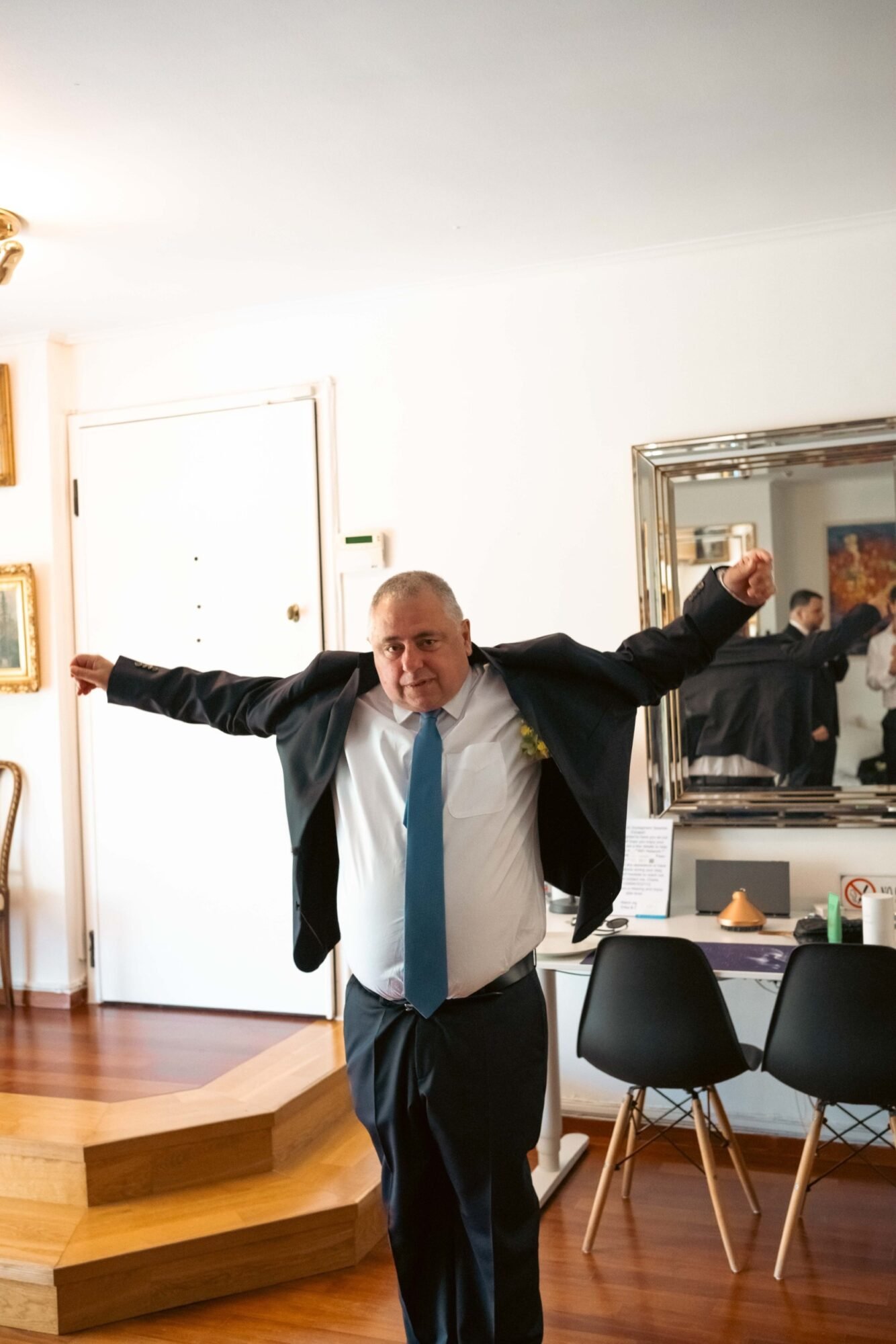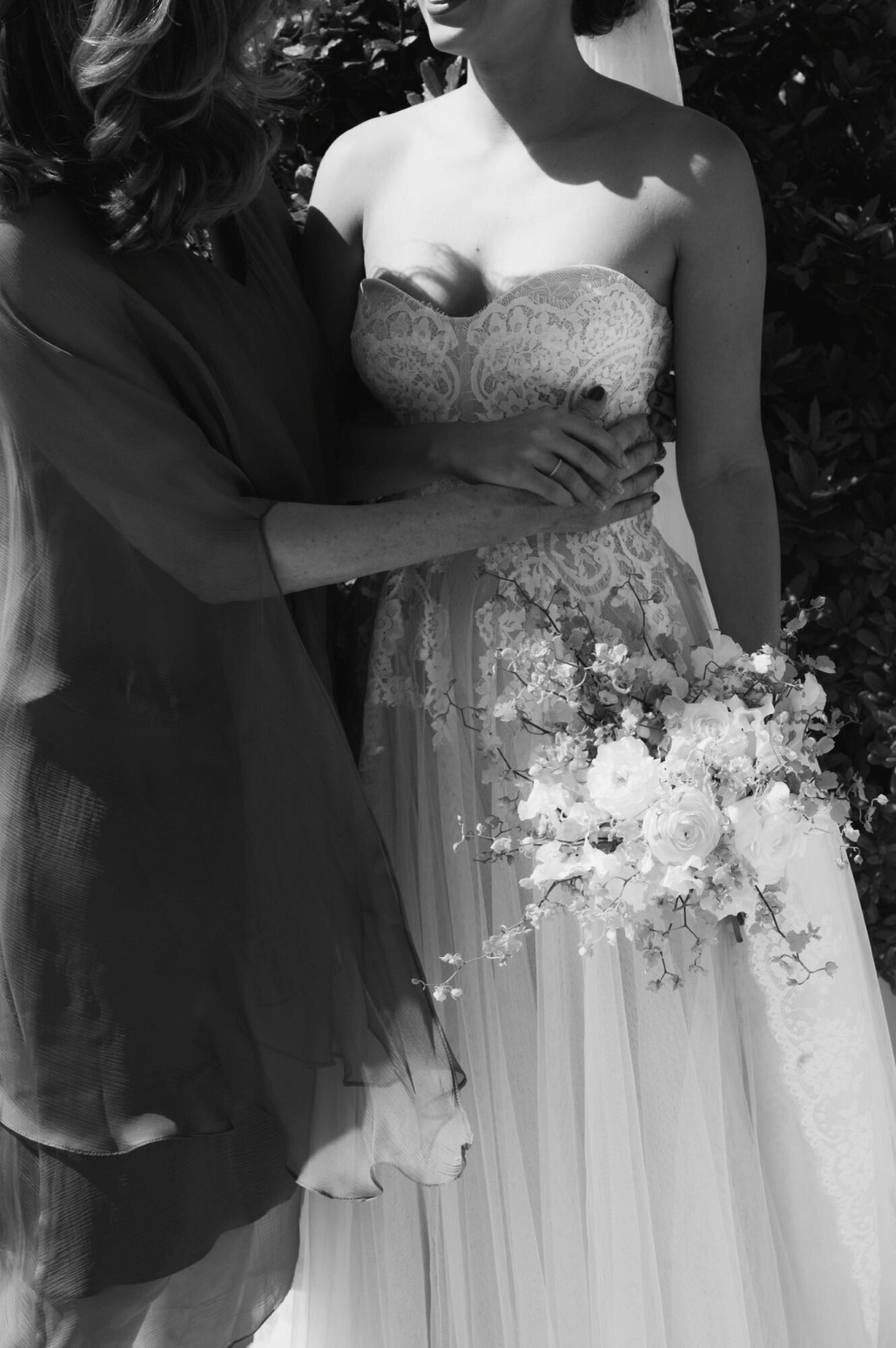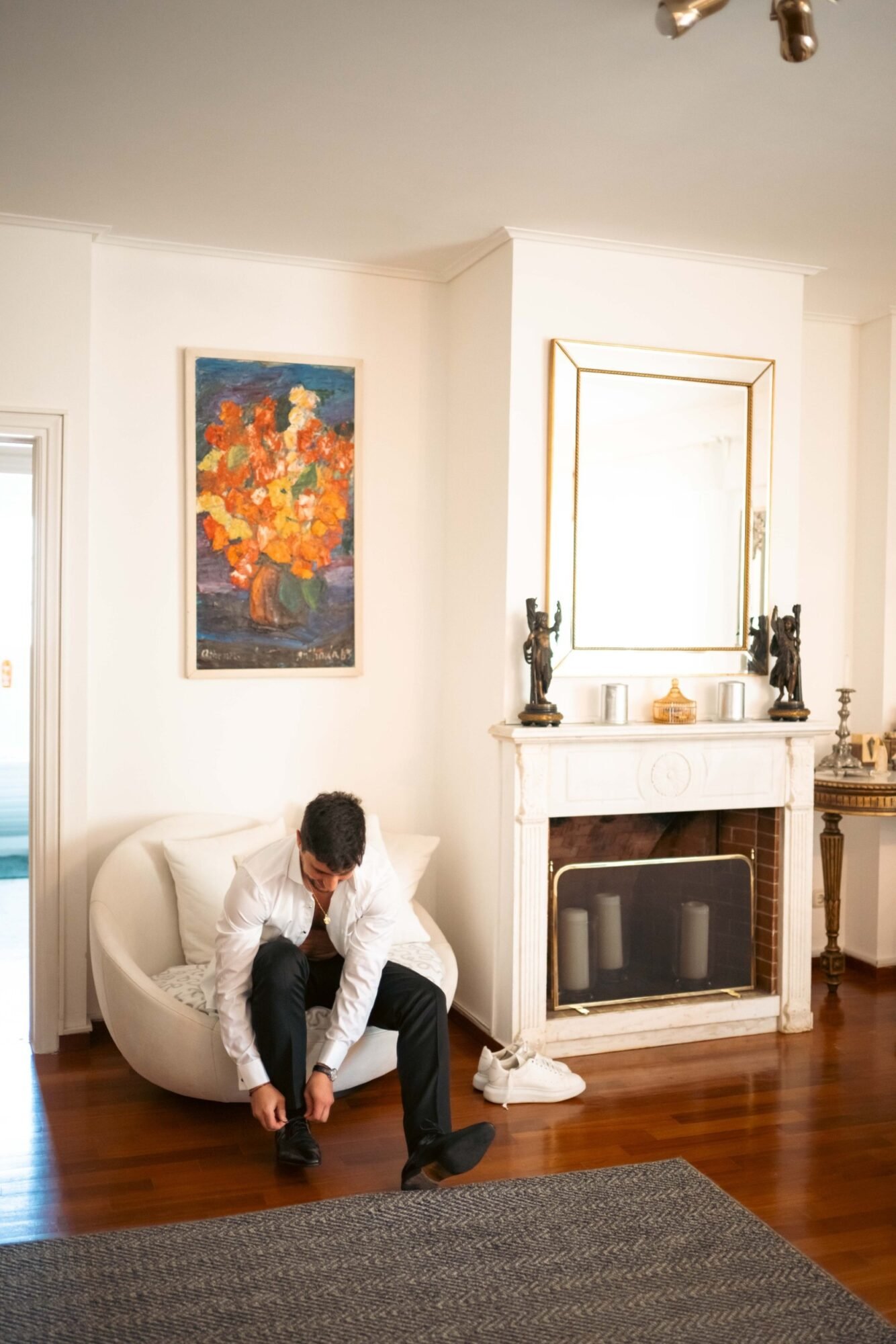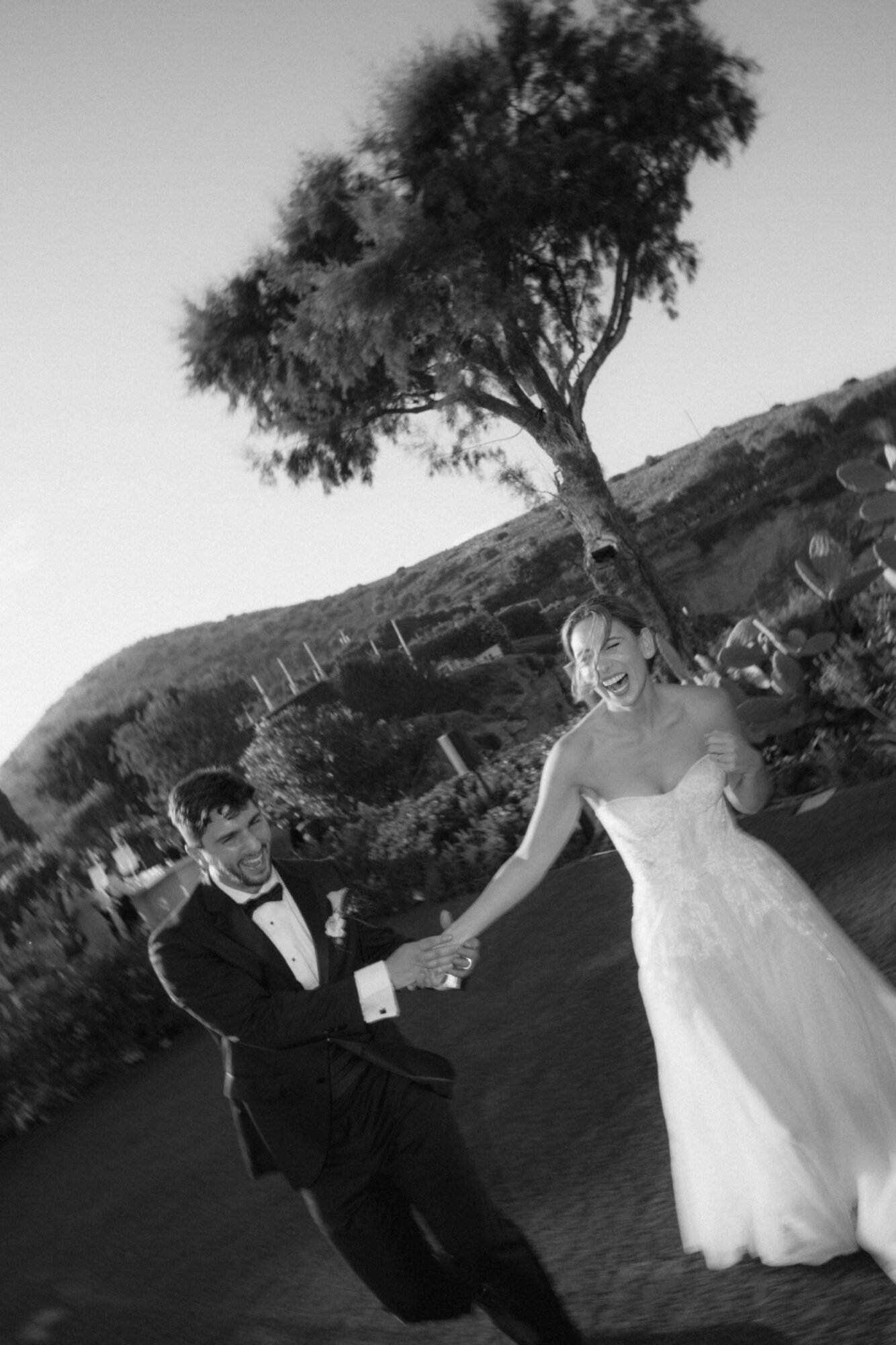The groom and his “koumbaro” or groomsman exuded timeless sophistication, both dressed in matching black tuxedos from BOSS. The tuxedos featured sleek lines and a classic silhouette that conveyed elegance and modernity. Each ensemble was paired with a crisp white shirt and a sharp black bow tie, adding a touch of formal refinement. The deep black fabric offered a striking contrast to the natural, sunlit surroundings. Together, their coordinated look perfectly complemented the wedding’s chic, contemporary aesthetic.