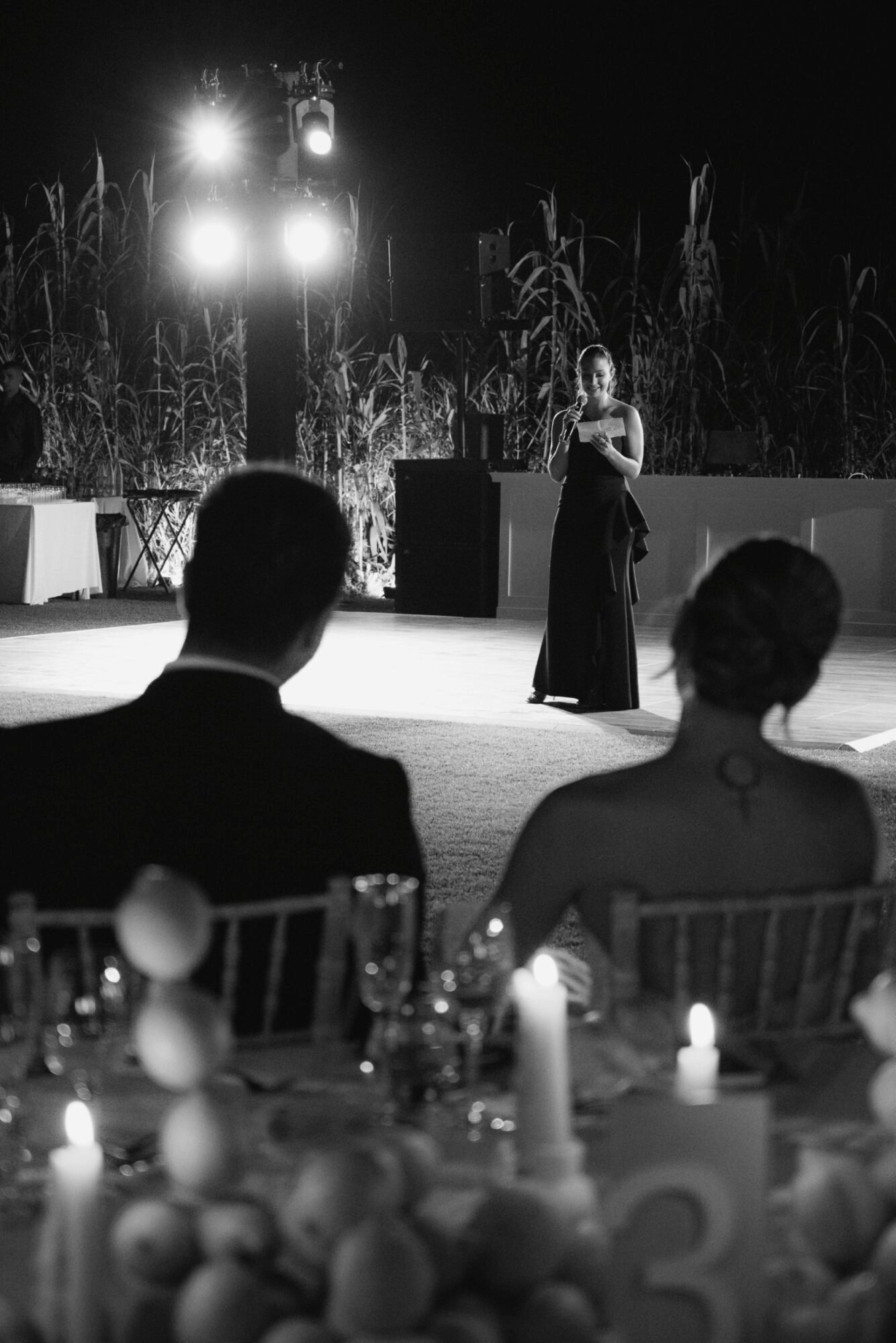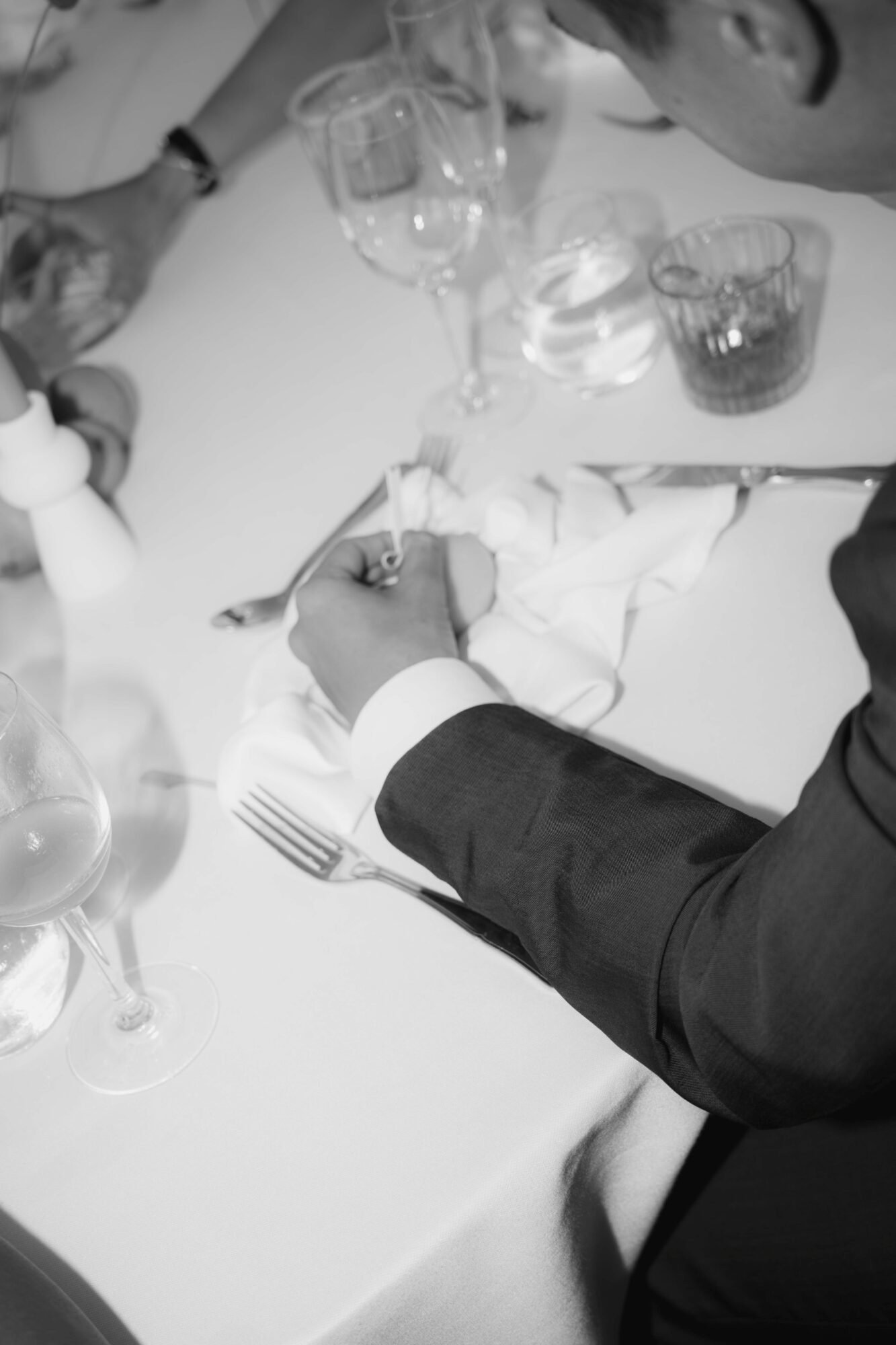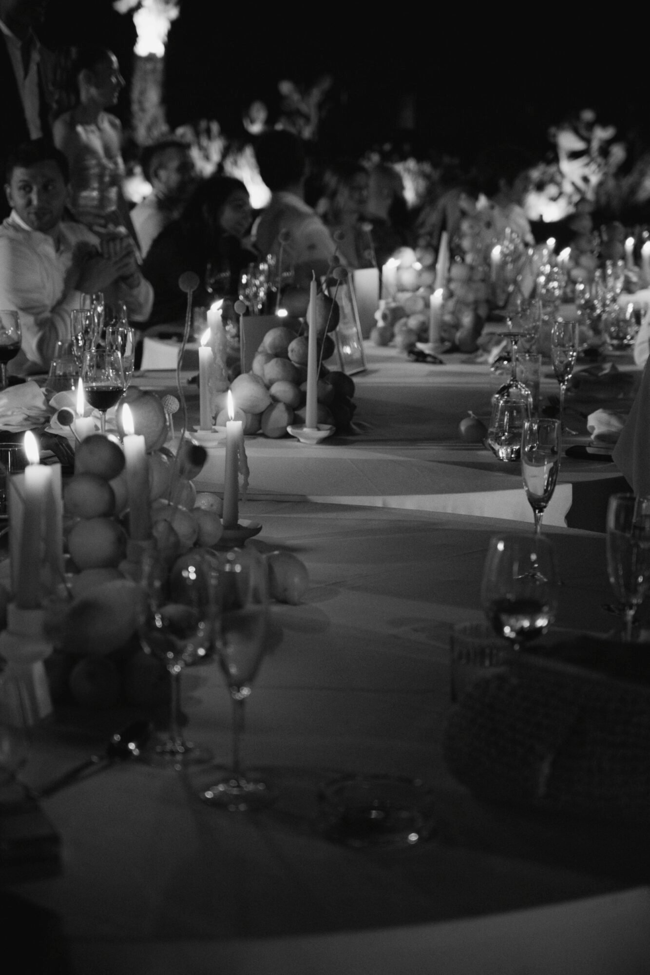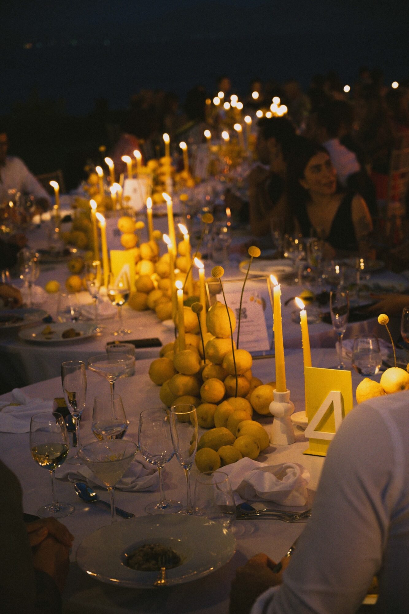 For the reception layout, we wanted to foster connection and a sense of togetherness. Instead of the traditional arrangement of round tables, we joined them in a flowing, wavy formation to create one continuous shared table. A symbolic gesture of unity and a visually striking contemporary centerpiece for the evening. The combination of clean white linens, sculptural candleholders, and lemon-yellow accents struck the perfect balance between modern sophistication and playful charm.