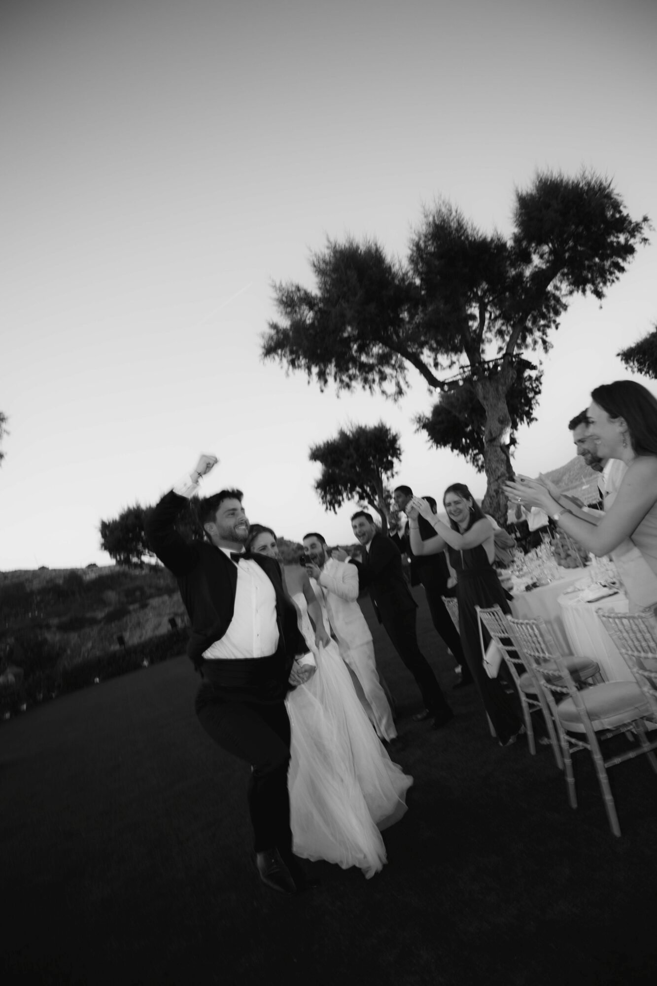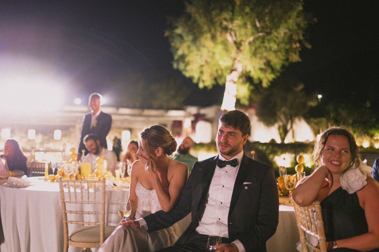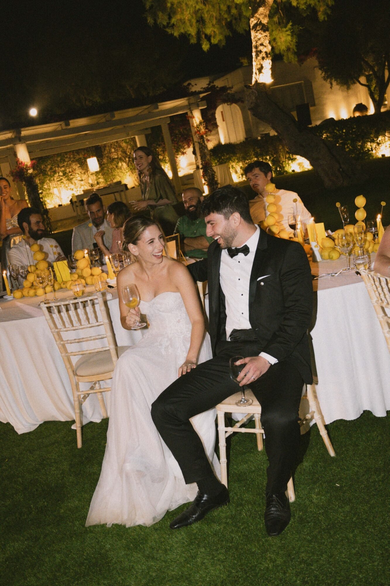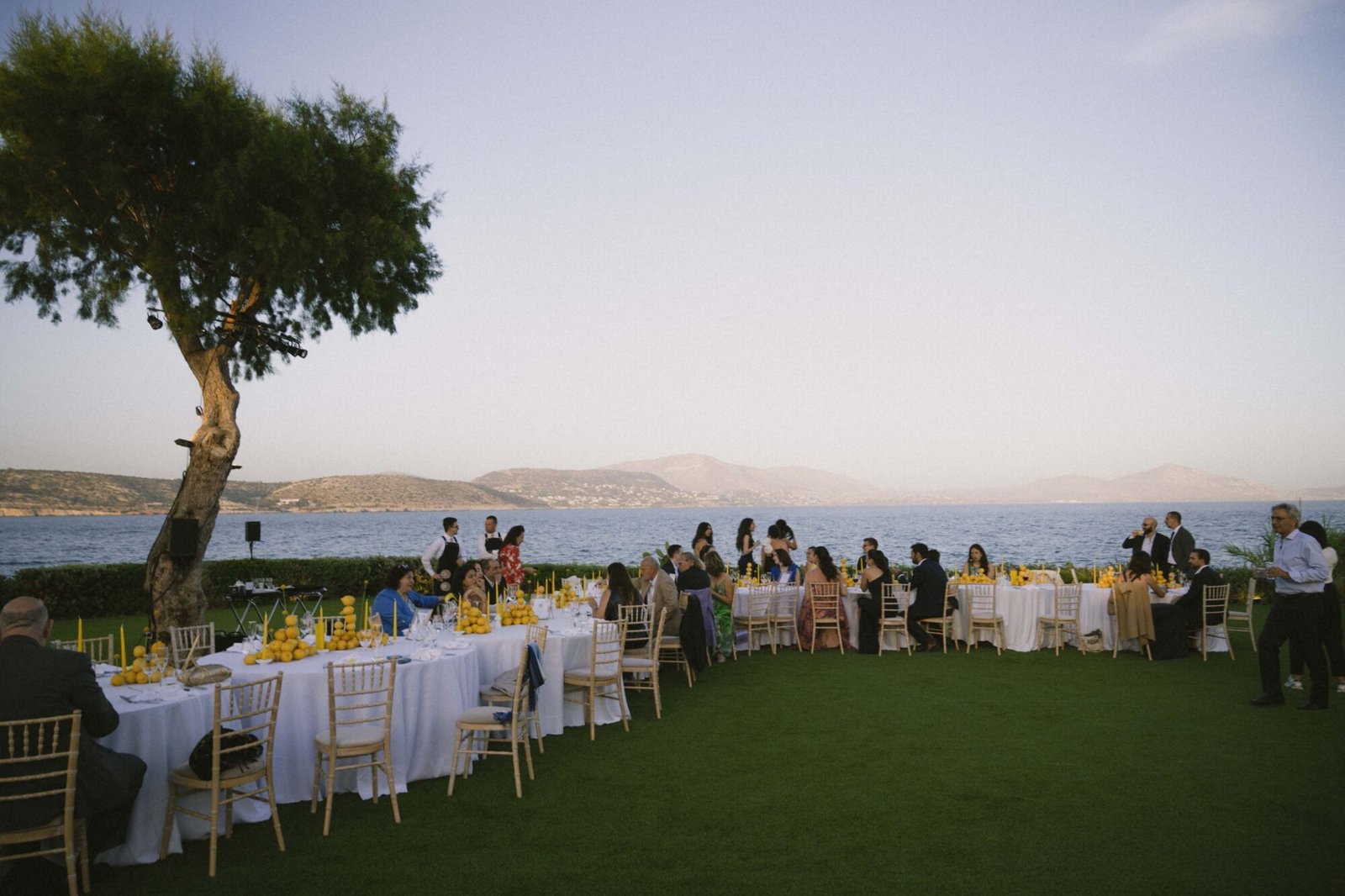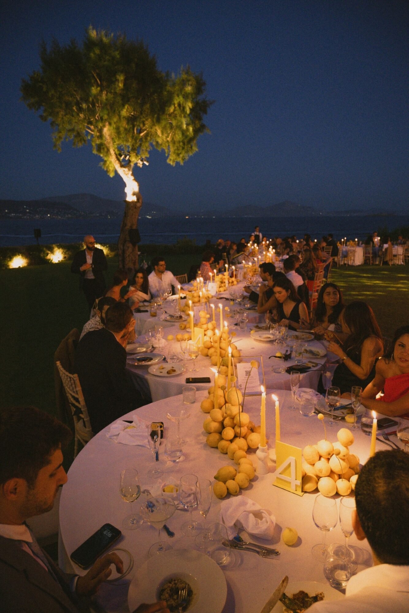 Think: long family-style round tables dressed in citrus hues, Greek flavors flowing all night, and a design story rooted in the very first thing they ever bought together… a lemon tree.