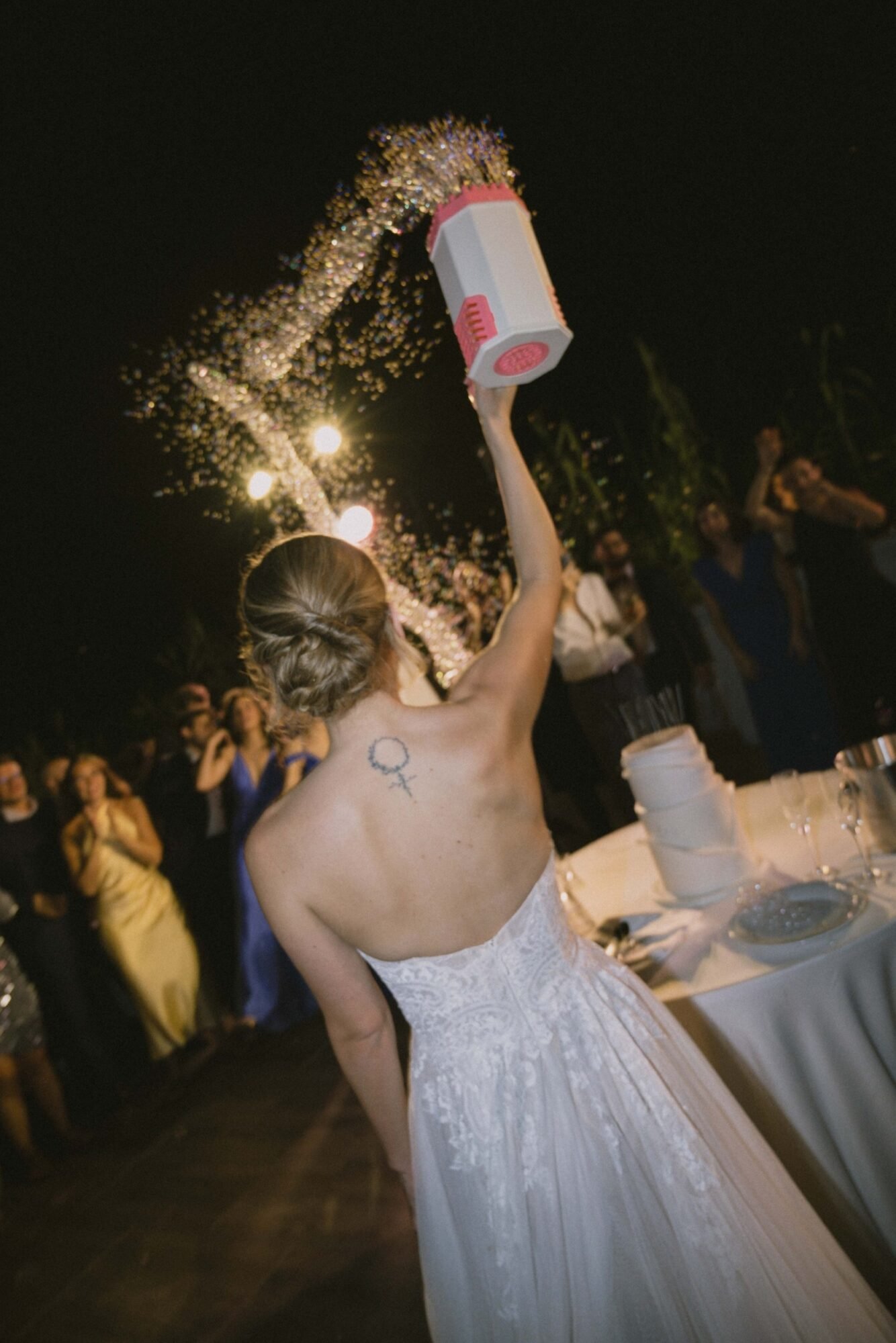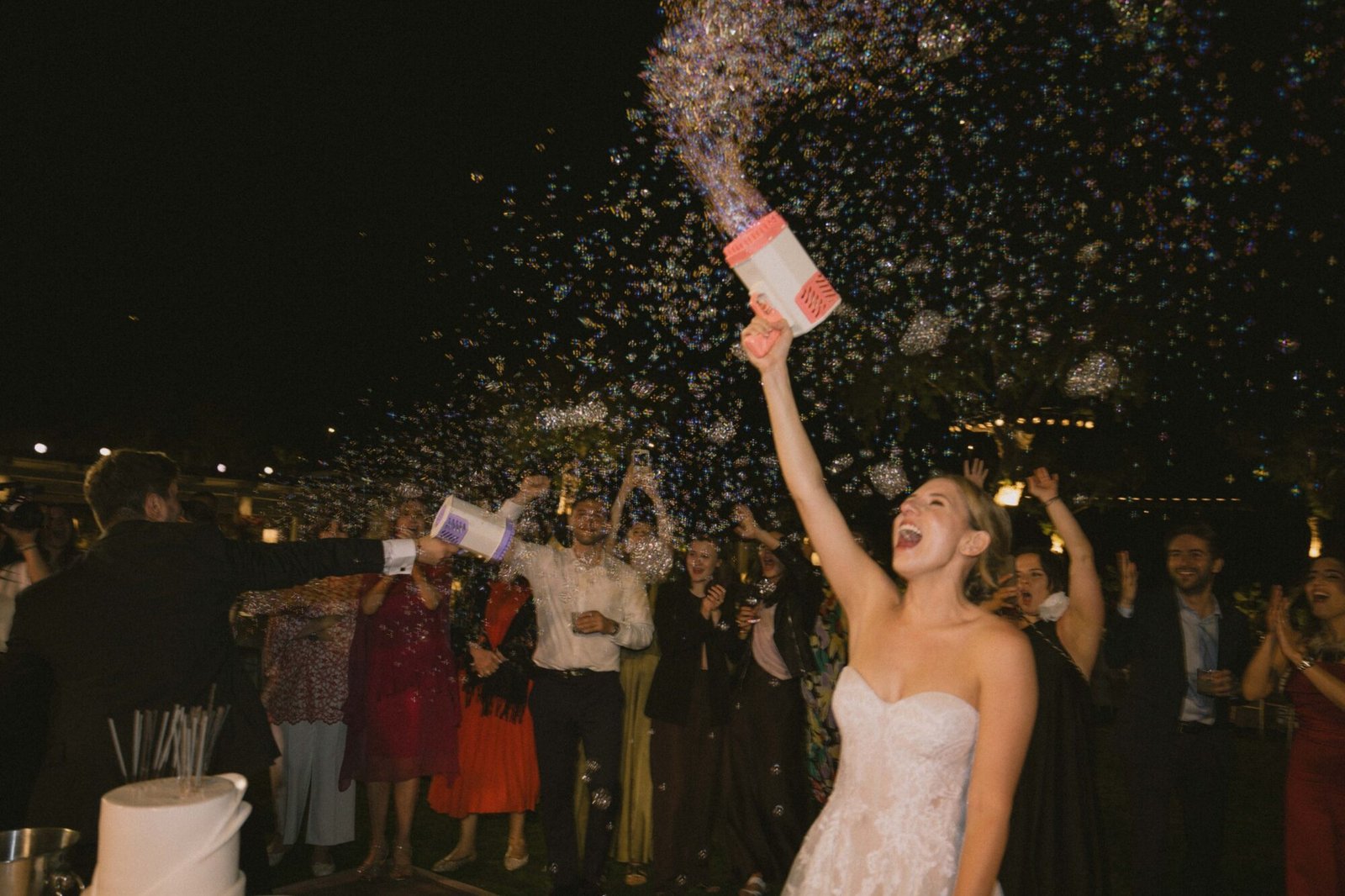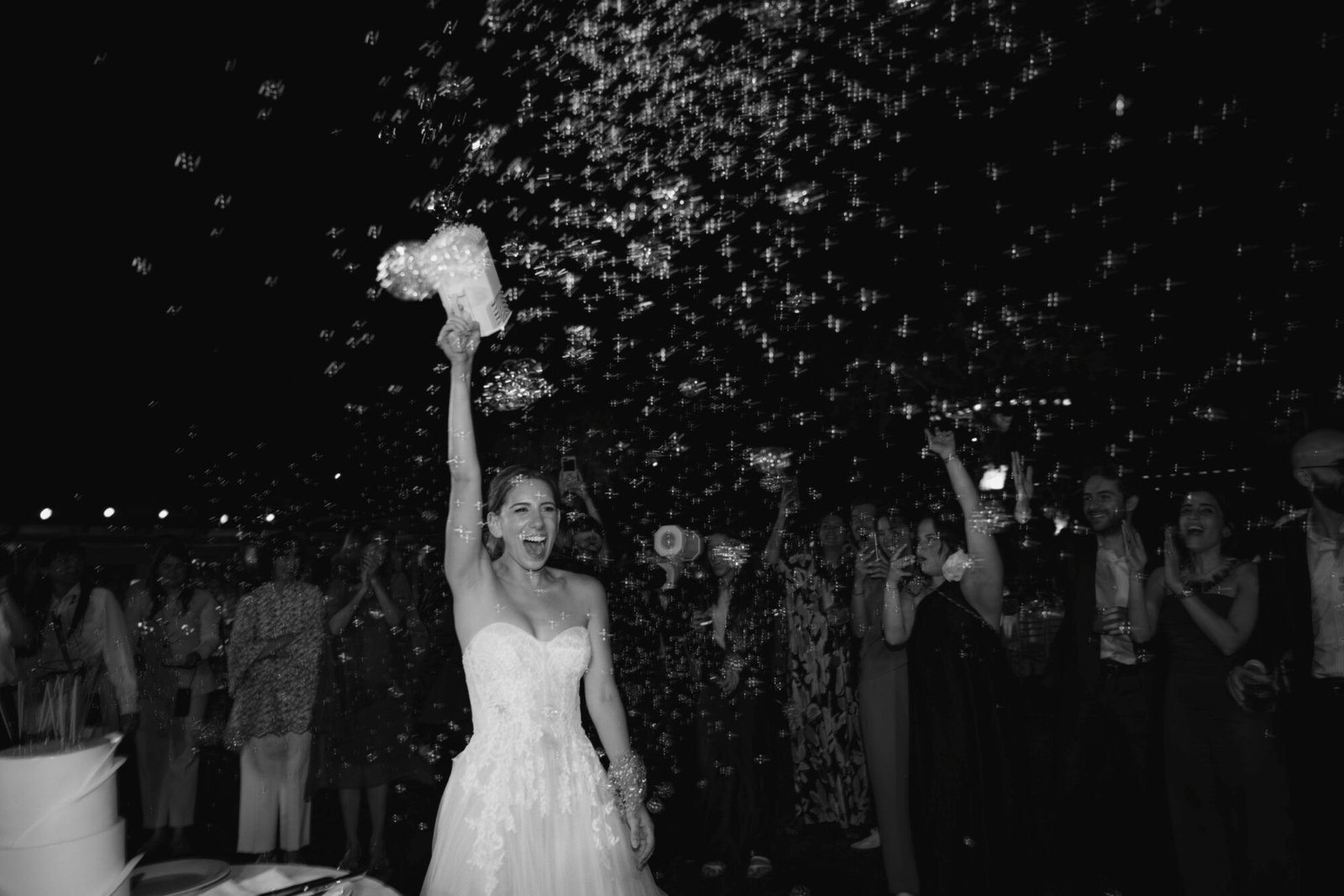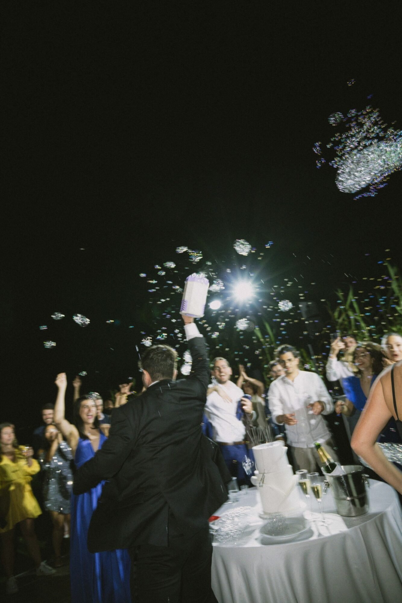 The cake was filled with traditional Greek almond sponge, chosen for its rich, delicate flavor. Its design embraced a modern aesthetic, perfectly aligned with the overall contemporary decor. As the couple cut the cake, 100 sparklers lit up its top. A magical touch to the moment, while they playfully used a bubble gun, creating a fun and unforgettable celebration scene.
