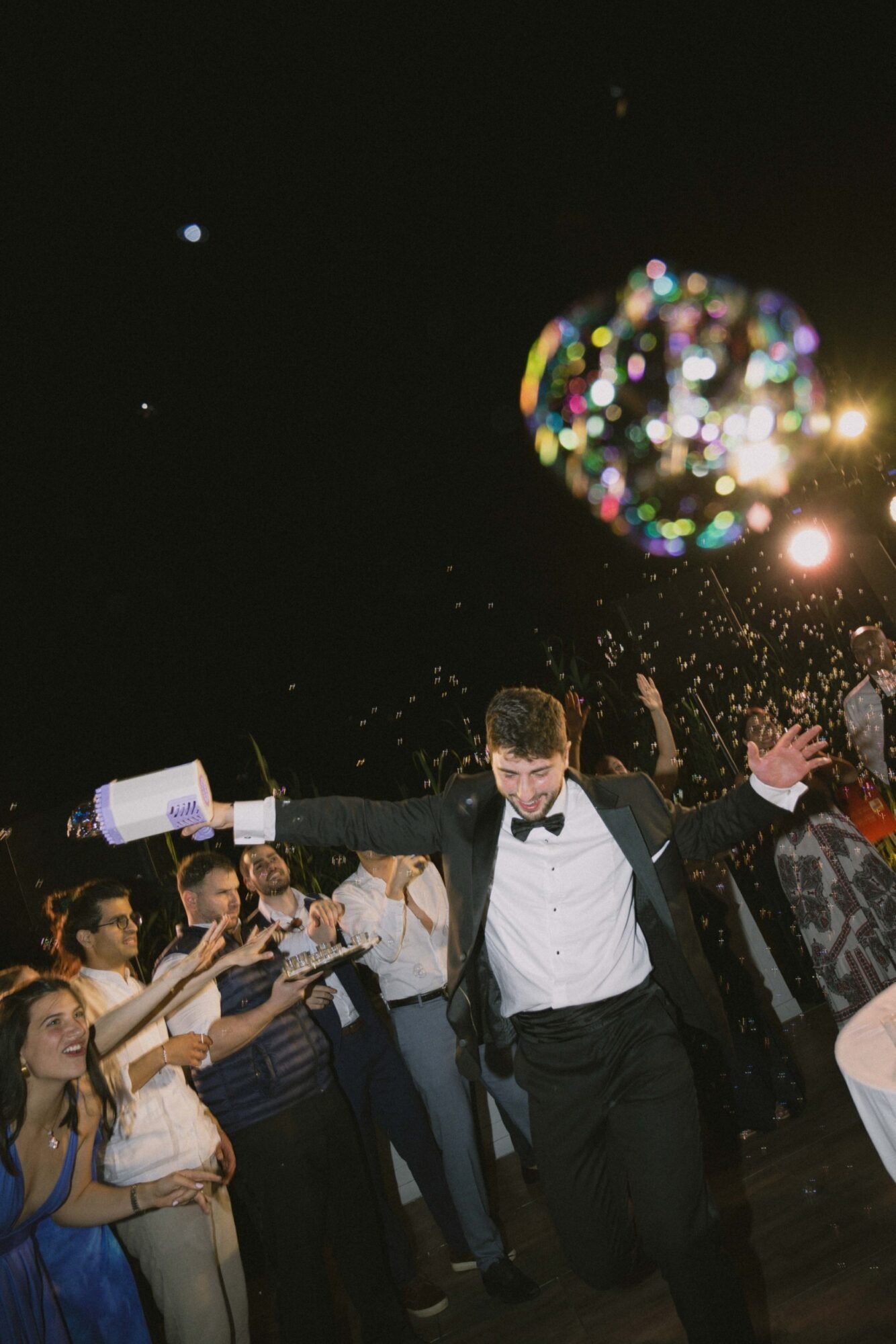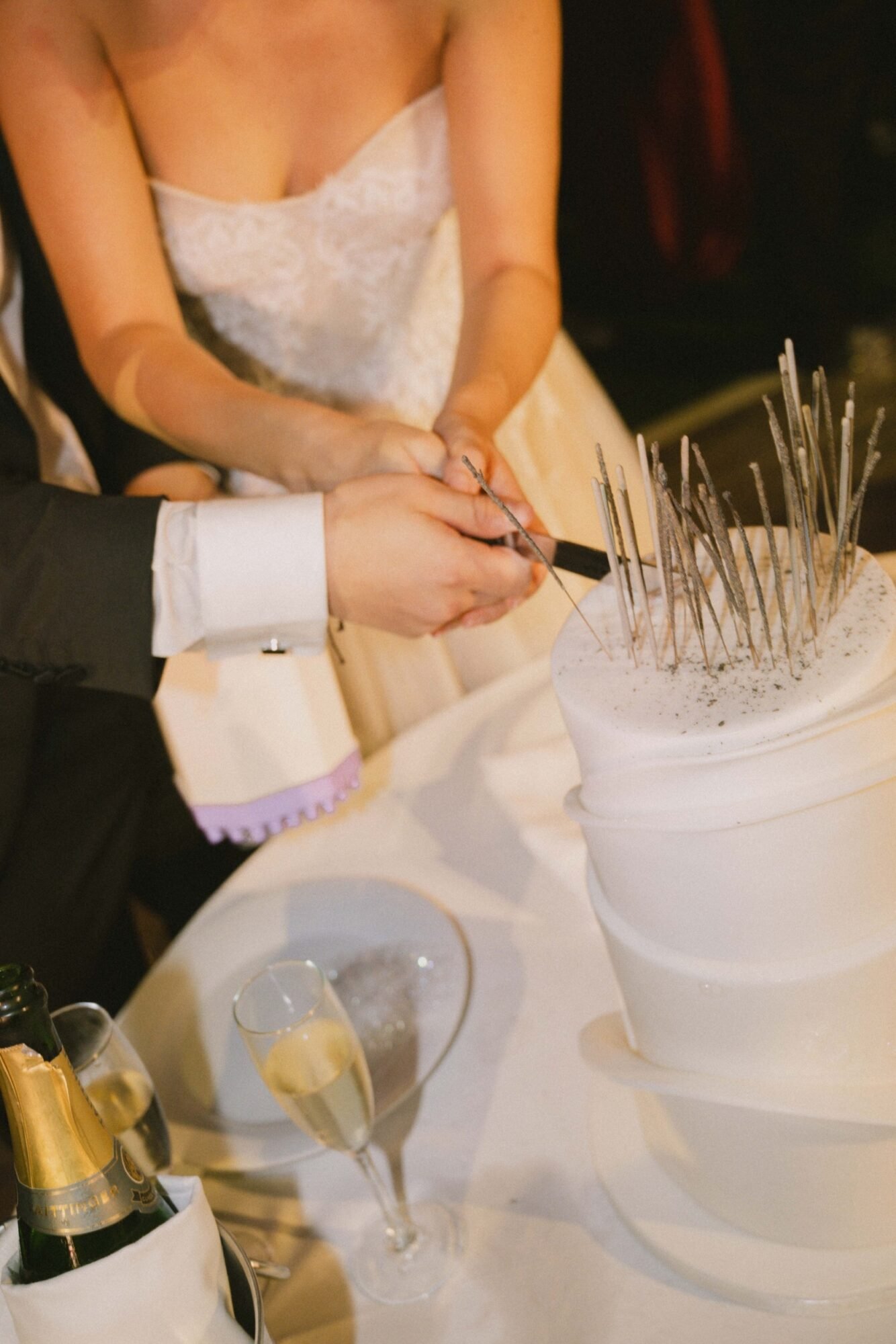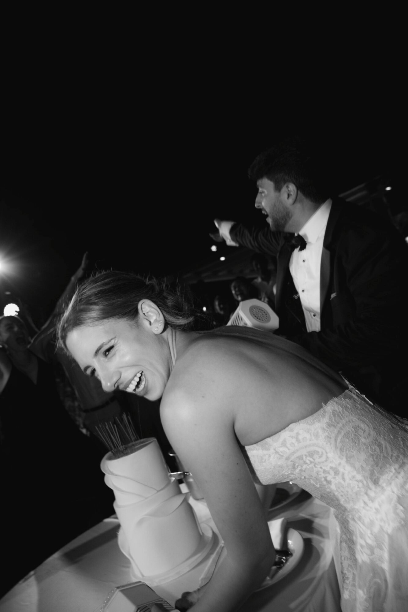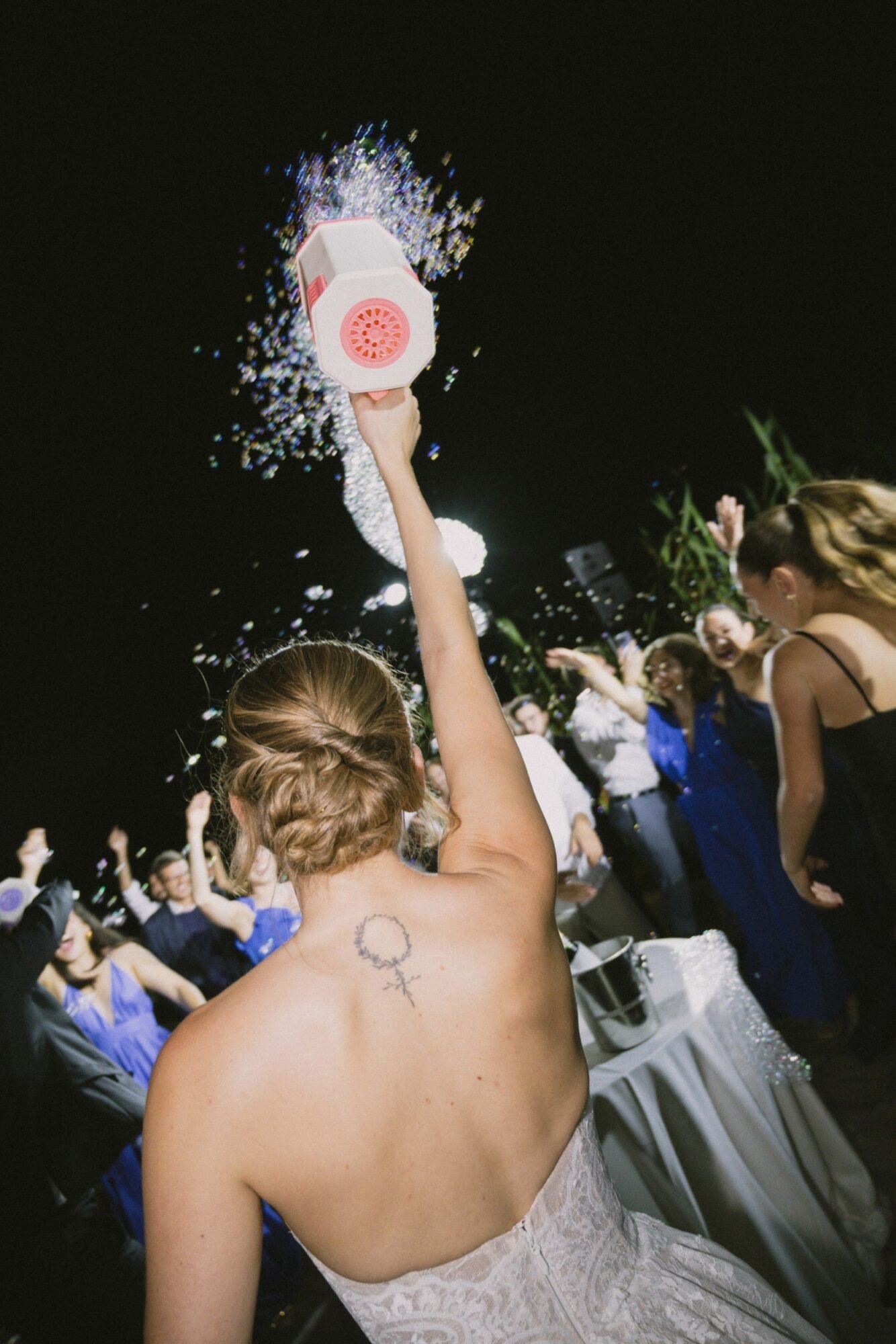 The cake was filled with traditional Greek almond sponge, chosen for its rich, delicate flavor. Its design embraced a modern aesthetic, perfectly aligned with the overall contemporary decor. As the couple cut the cake, 100 sparklers lit up its top. A magical touch to the moment, while they playfully used a bubble gun, creating a fun and unforgettable celebration scene.