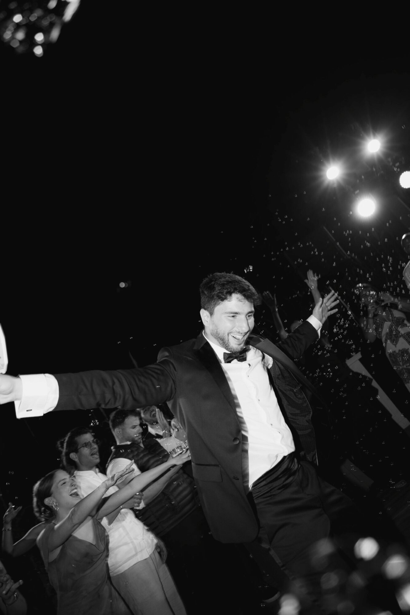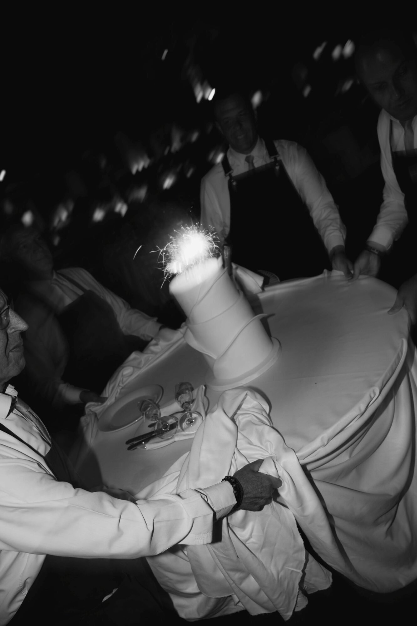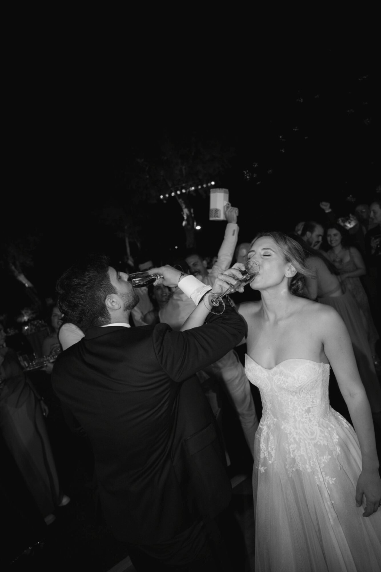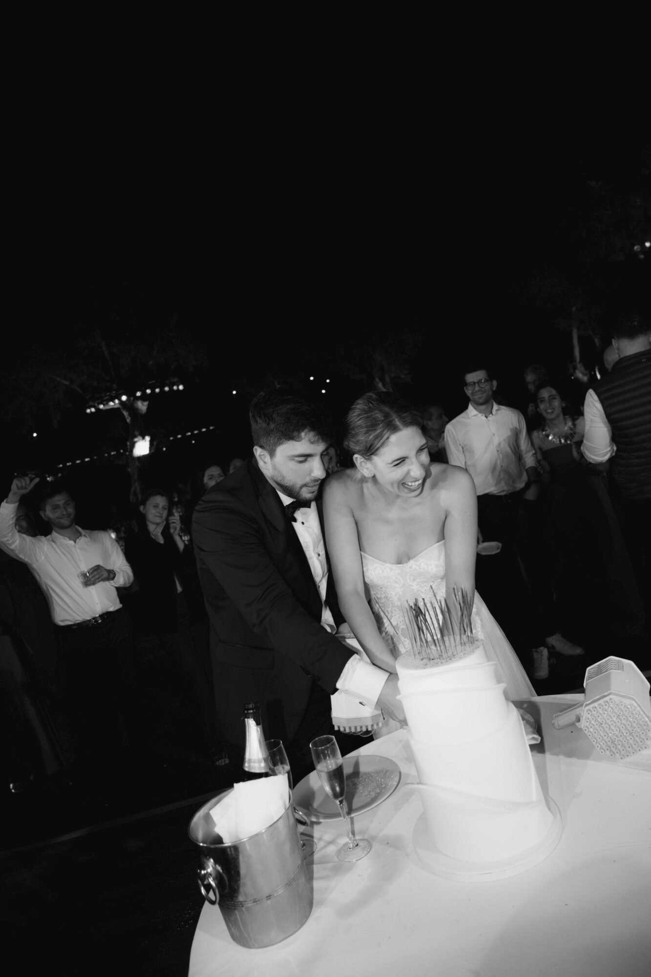 The cake was filled with traditional Greek almond sponge, chosen for its rich, delicate flavor. Its design embraced a modern aesthetic, perfectly aligned with the overall contemporary decor. As the couple cut the cake, 100 sparklers lit up its top. A magical touch to the moment, while they playfully used a bubble gun, creating a fun and unforgettable celebration scene.
