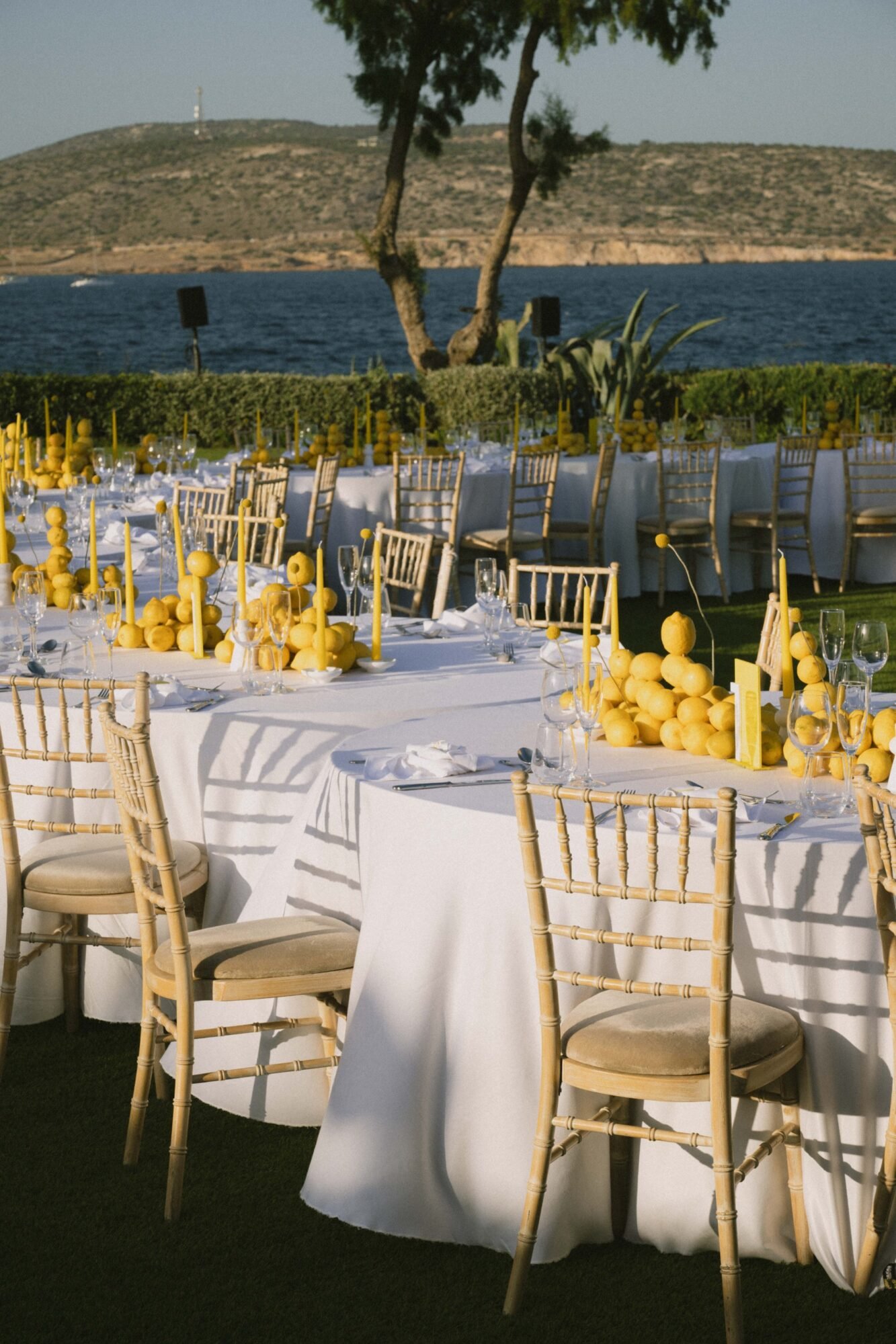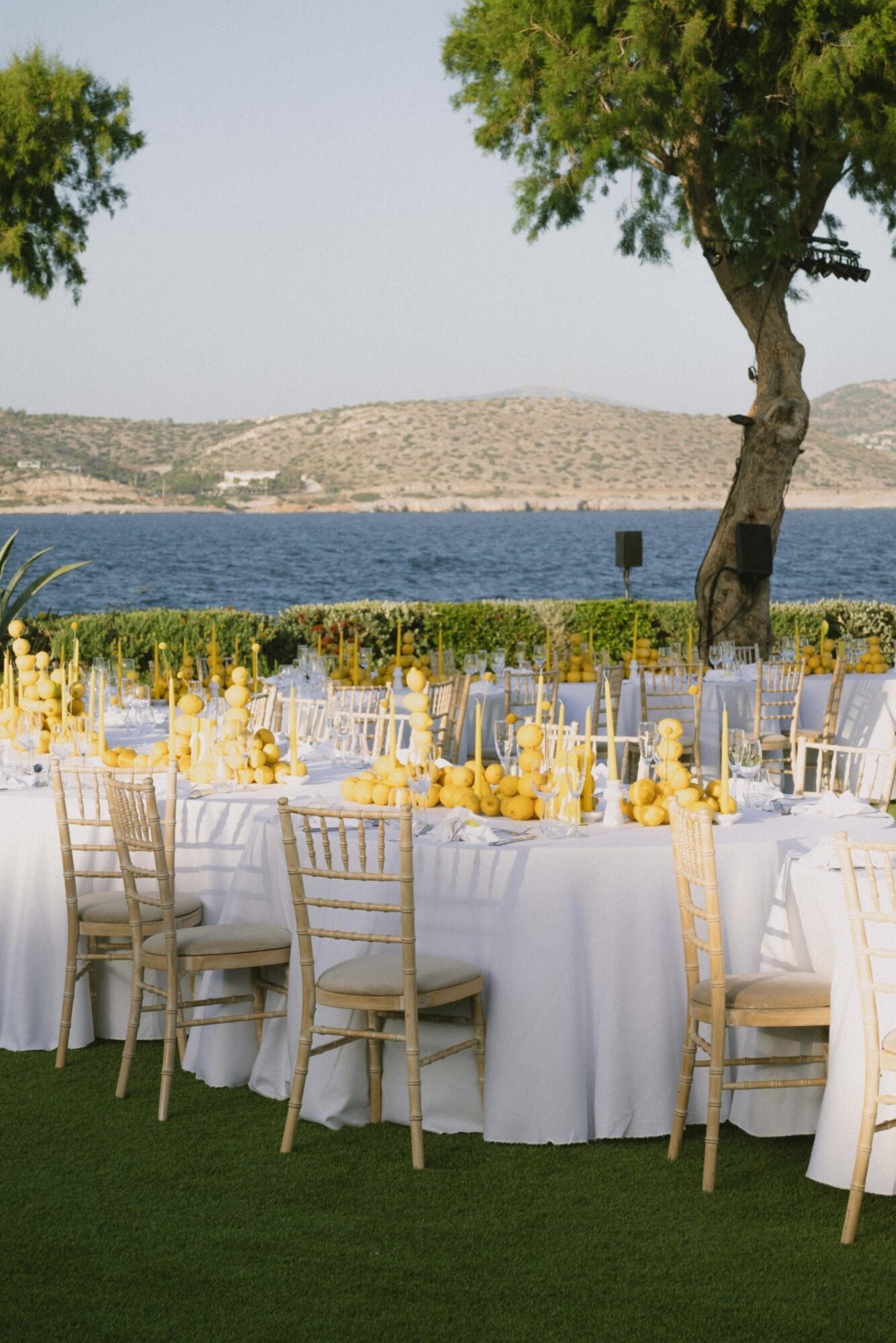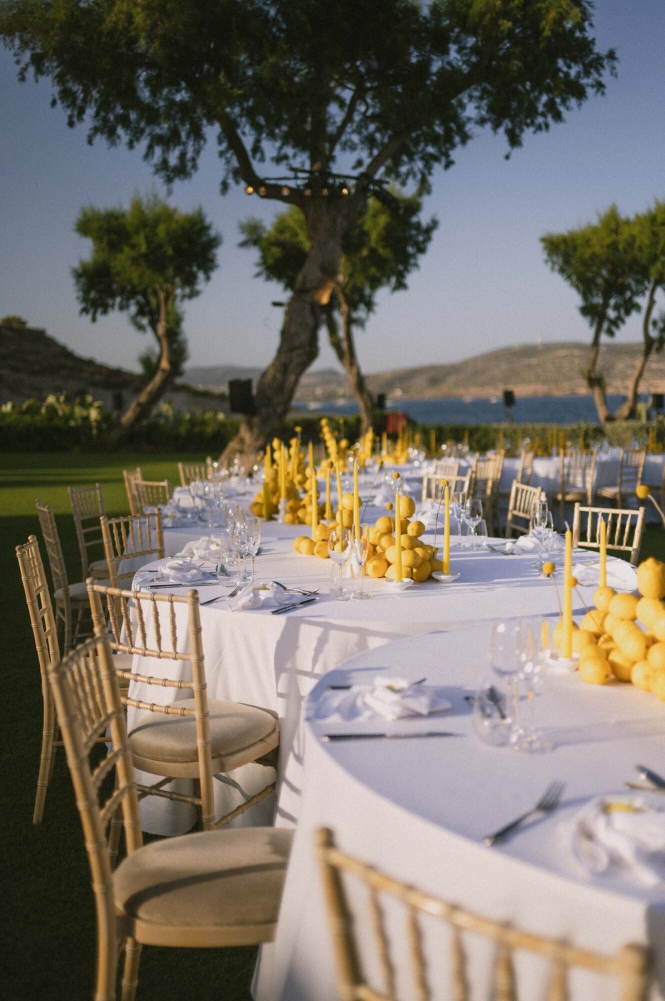 This wedding stands out for its bold lemon-themed decor. Featuring over 300kg of lemons used throughout the design, creating a vibrant and immersive Mediterranean aesthetic at the Athenian Riviera.