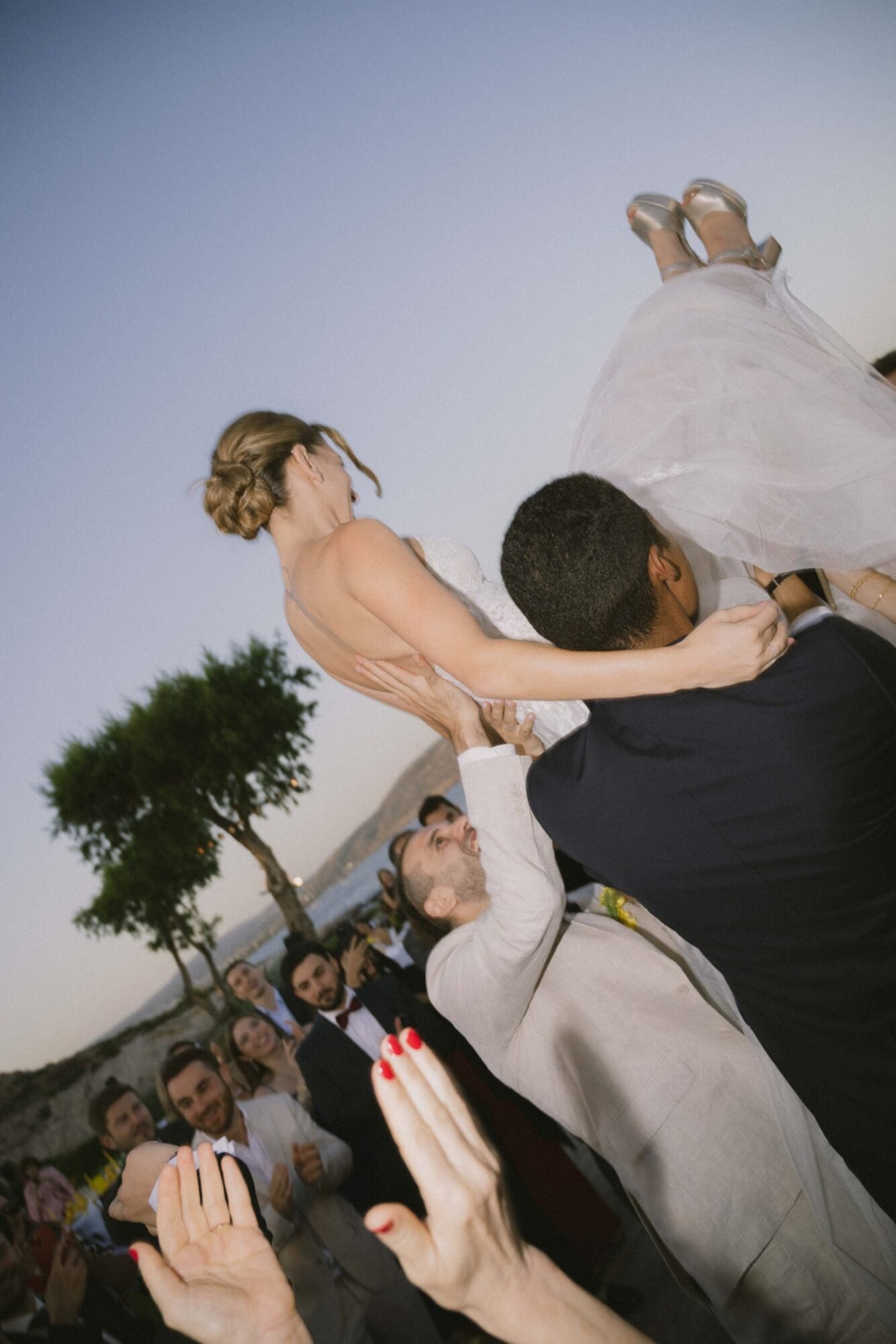 Maje Paris bridesmaid dress is effortlessly chic, crafted in a soft, flowing satin fabric in a distinctive khaki hue that echoes the olive trees of Greece and the natural beauty of the surroundings. It features a wrap-style silhouette with a gentle V-neckline and fluttery short sleeves, creating an elegant yet relaxed look. The skirt drapes beautifully with subtle pleats and an asymmetric hem that adds movement and grace. The earthy color and graceful style tie perfectly into the wedding’s nature-inspired theme, offering a refined, contemporary feel that blends seamlessly with the Mediterranean setting.