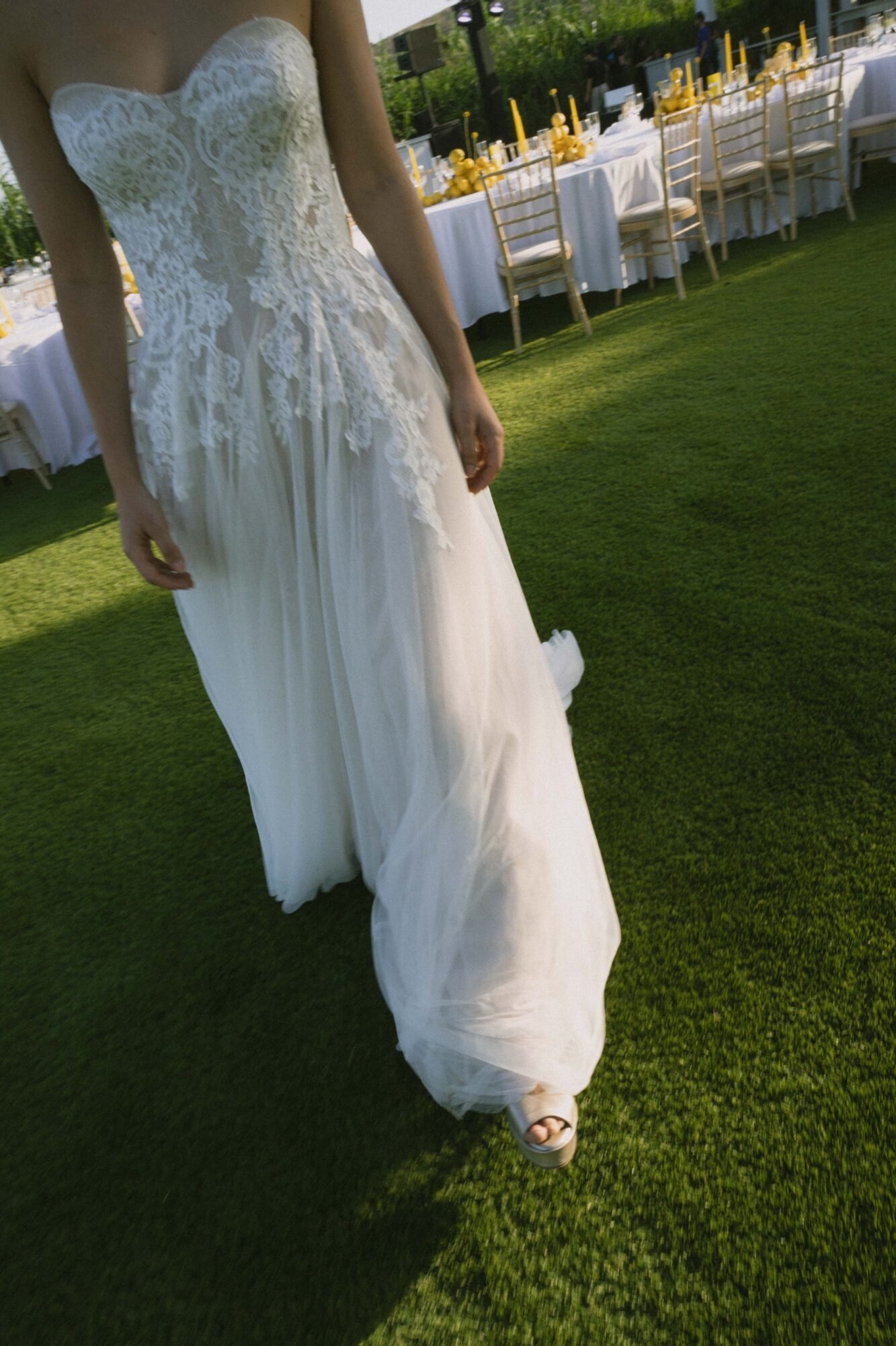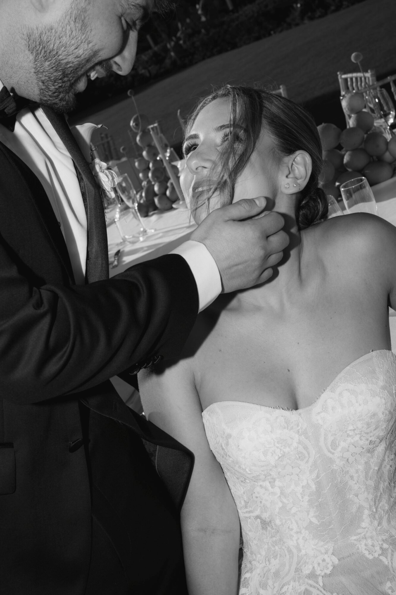 Couple’s playful personalities and their love for the unexpected inspired us to craft a wedding design that was both contemporary and delightfully lighthearted. Early in the planning process, the bride shared a sweet anecdote. The first thing the couple ever bought together was a lemon tree. That small, symbolic gesture quickly grew into the heart of the wedding’s design narrative, with lemons becoming the signature motif of the celebration. And so, instead of flowers, we designed contemporary centrepieces with real lemons. There was actually few flowers at this wedding.