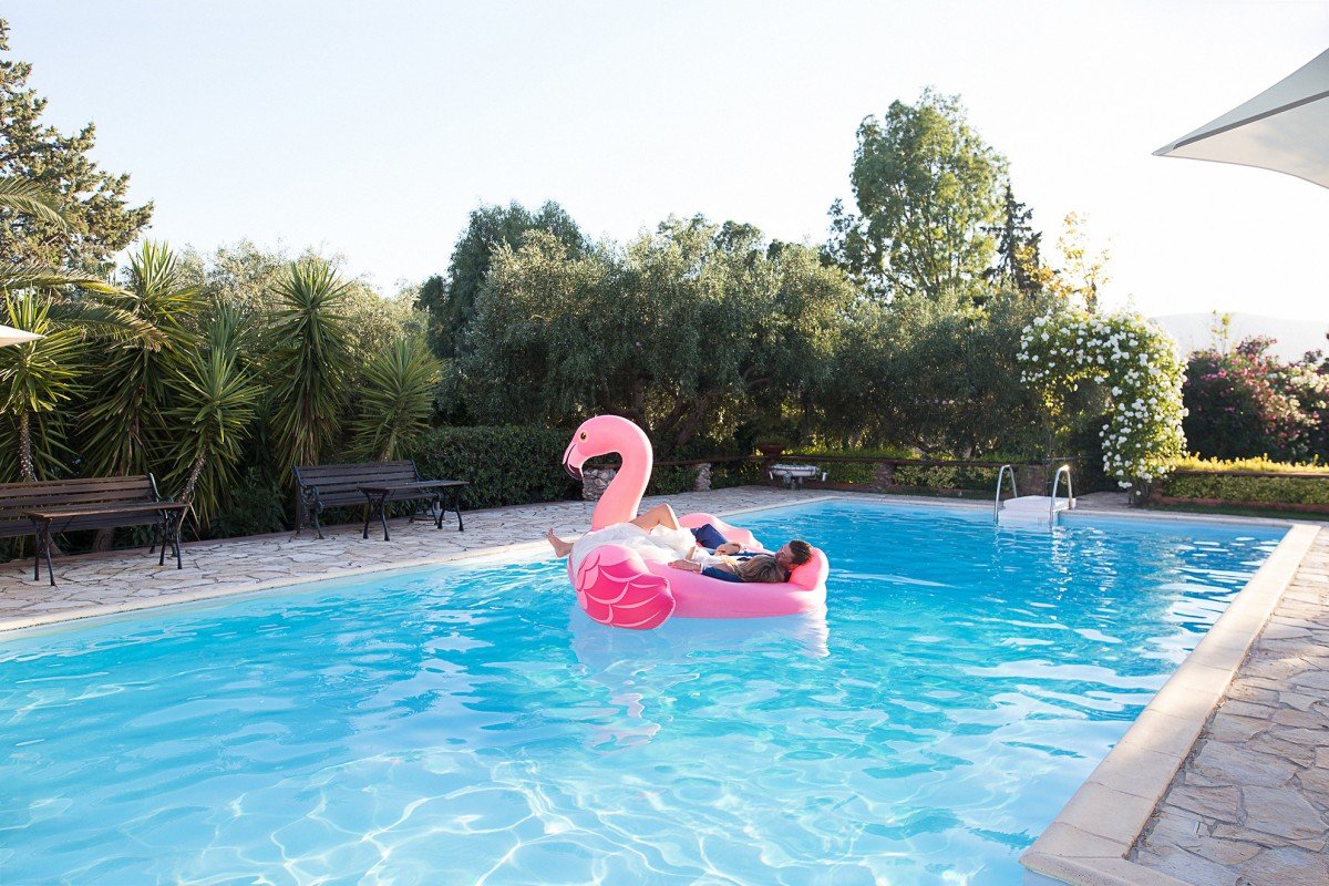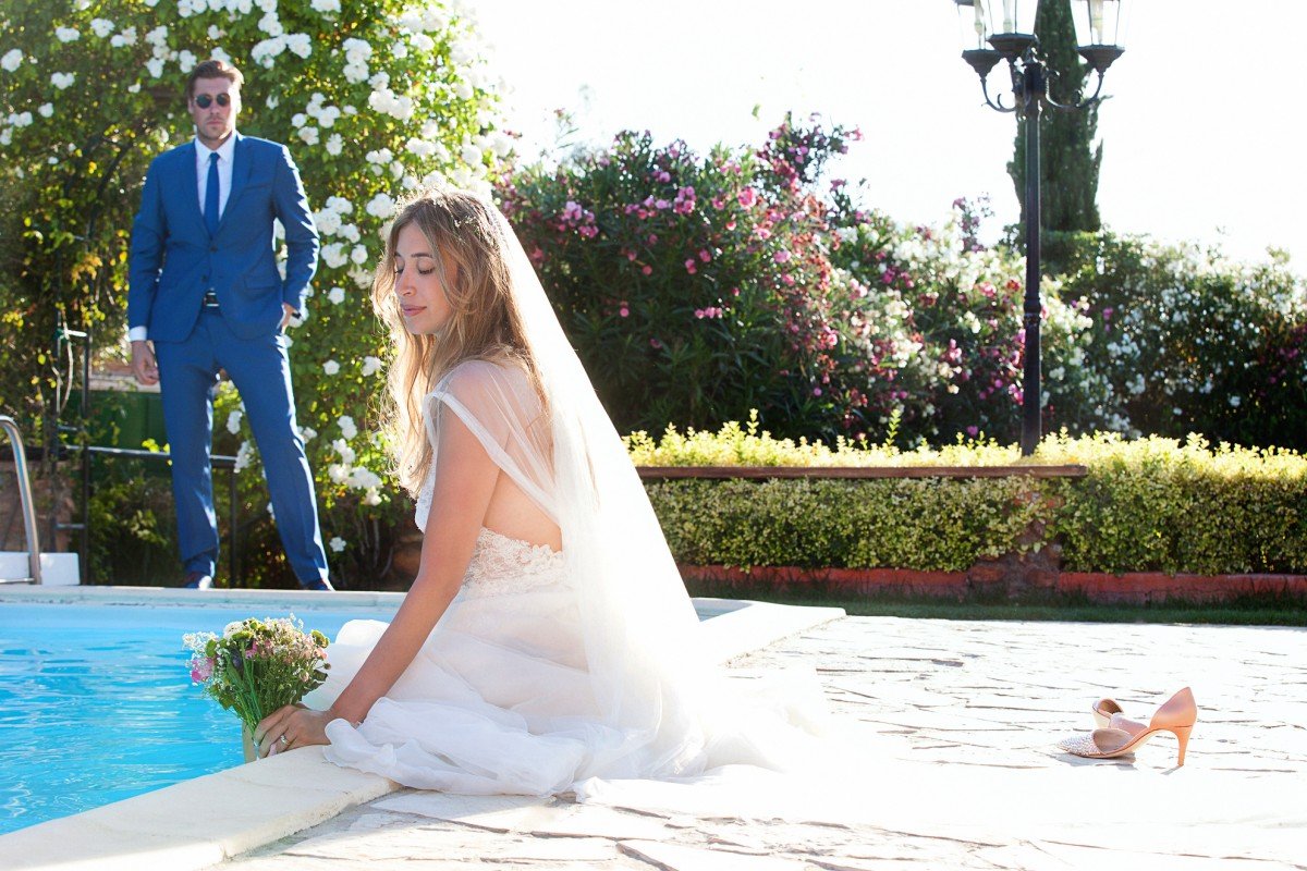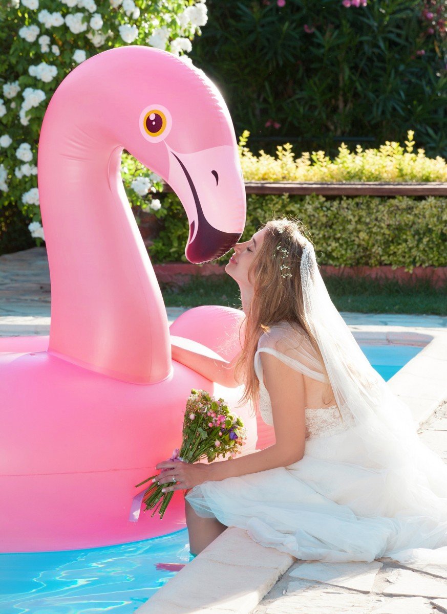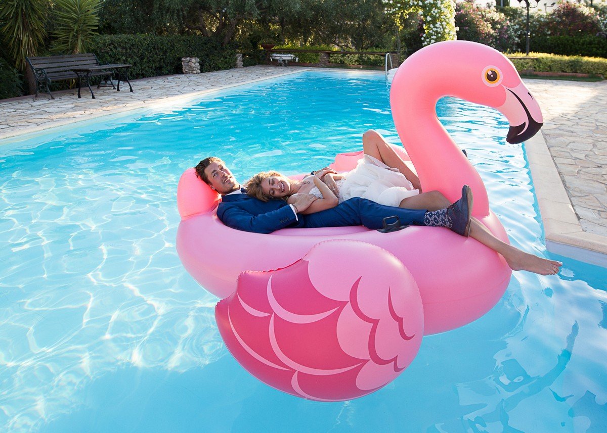 We had the most beautiful portrait session the day after, with the radiant newlyweds, enjoying walks in the lush estate and happily playing in the pool with two giant pool floats!”