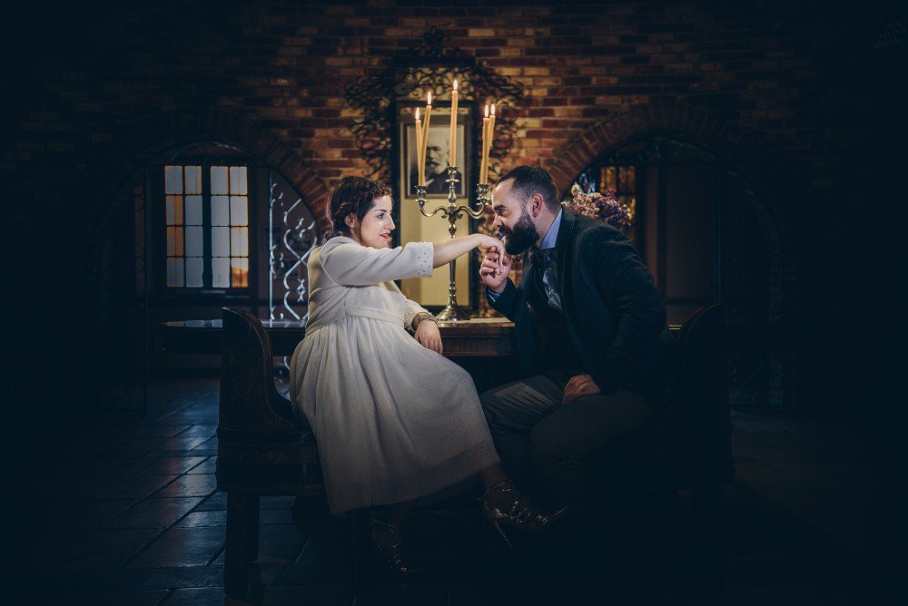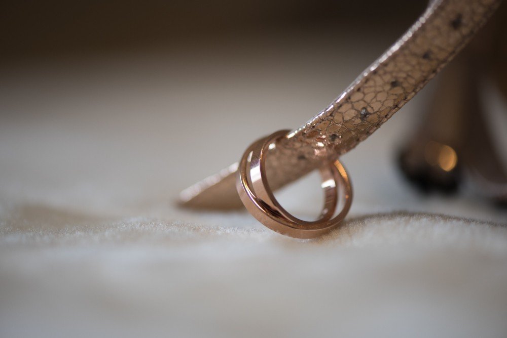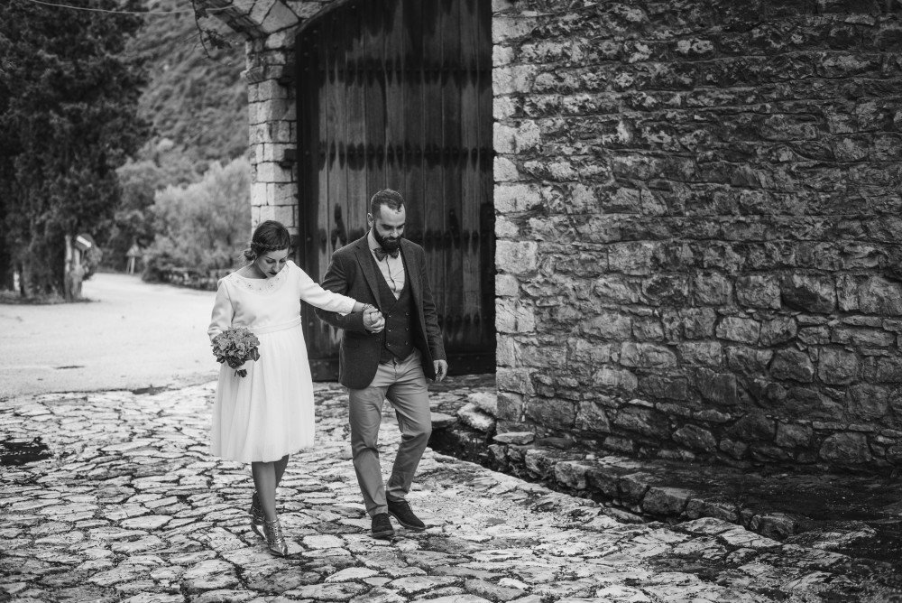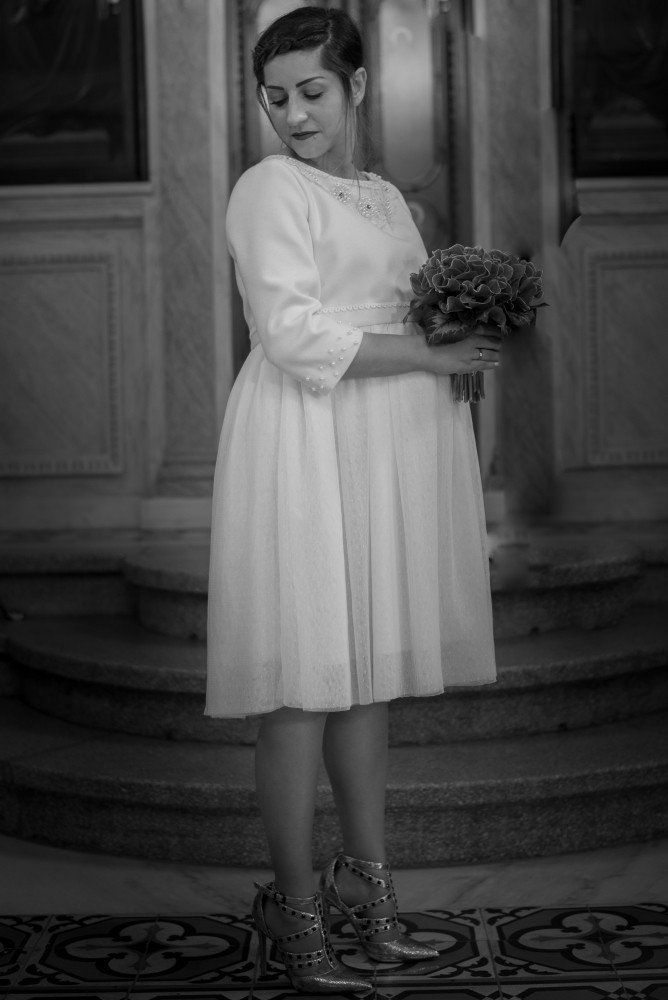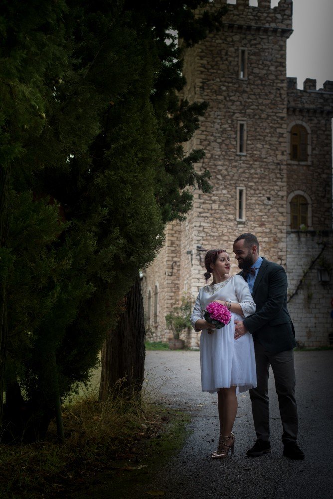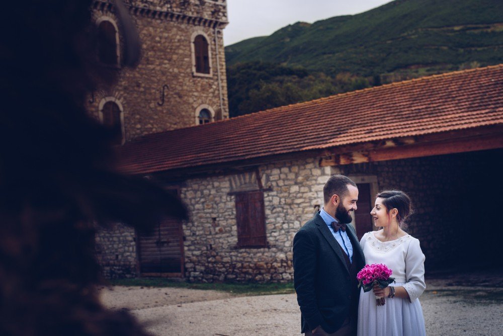 Dimitra, who was “walking for two”, chose a cute vintage white dress, while Dinos was wearing a retro style autumn suit. Bridal bouquet was simple, natural and made only with fuchsia Cyclamen flowers, which are native to Mediterranean Basin. Chick rock, rose gold metallic bridal shoes, where complimenting the rose gold wedding rings and bride’s rock vibe. This minimal wedding with vintage and rock details, was captured by George Liopetas Photography.