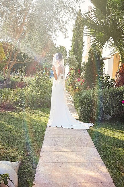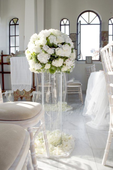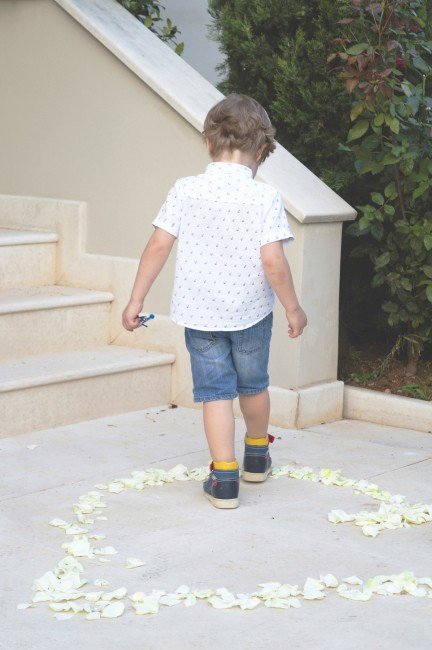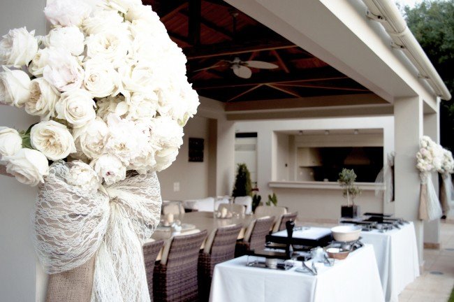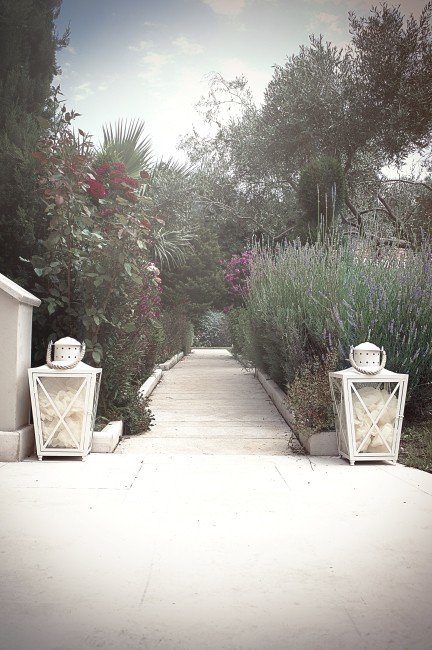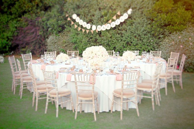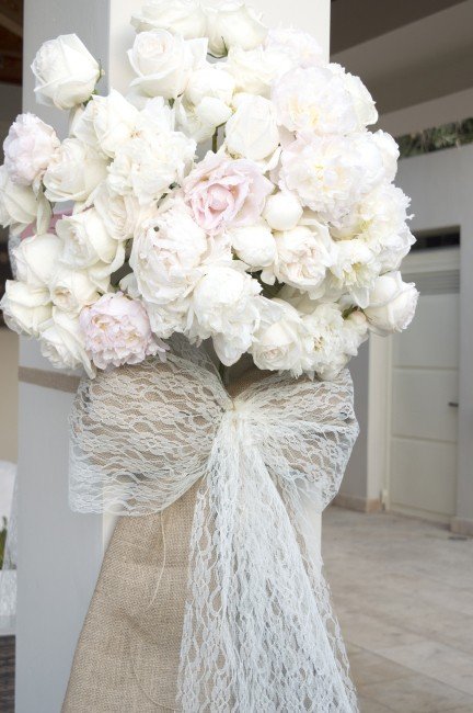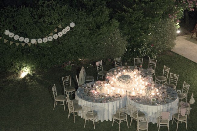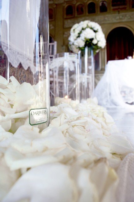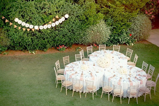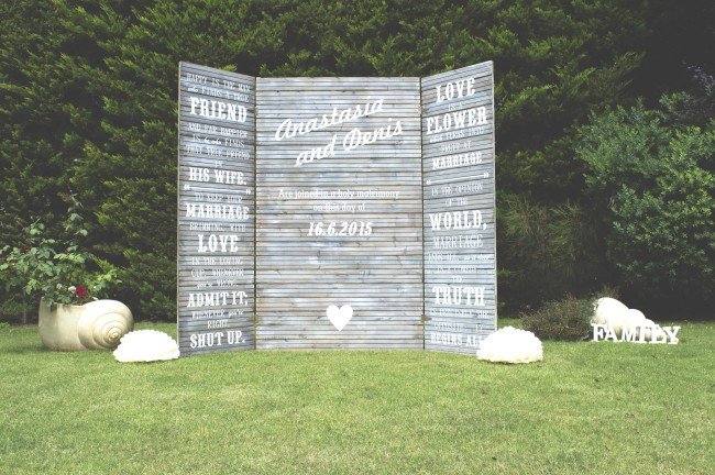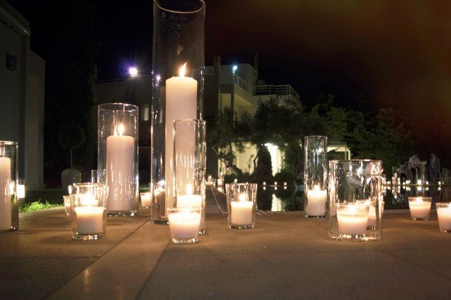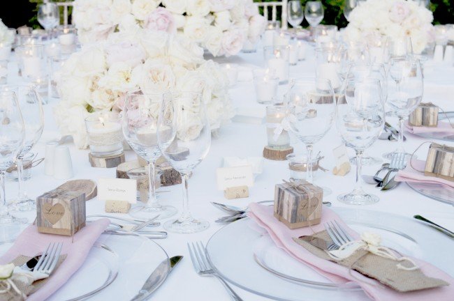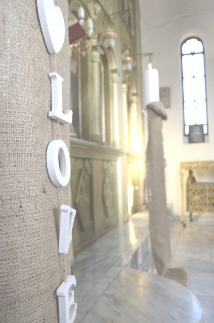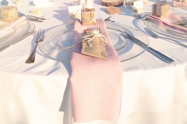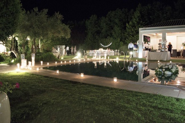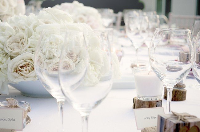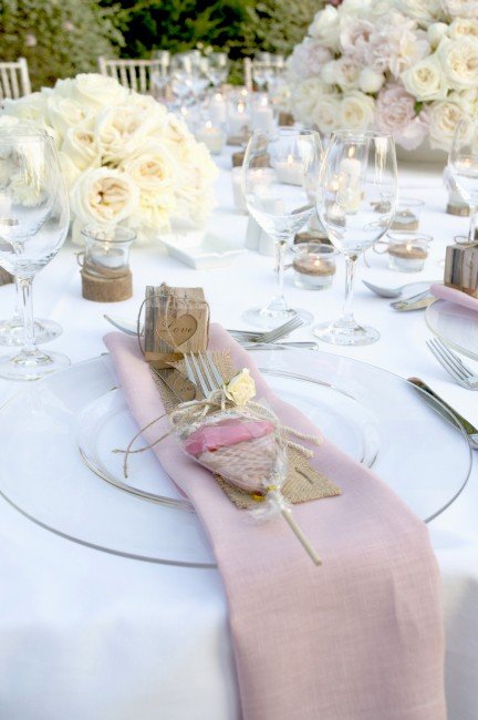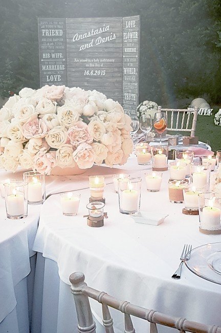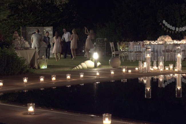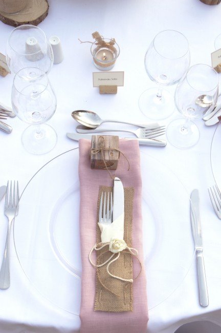 The villa was decorated with thousands of roses and peonies all in the shades of blush pink and white. They were accompanied by hundreds of candles in glass vases of all sizes. On the tables, as well as around the pool. Round tables were forming a shape of a heart. Each table had a floral centerpiece surrounded by candles in lace jars placed on slices of wood. In front of pates ware handmade name cards with crock holders, designer favor boxes with “koufetes”. Special handmade cutlery pouches from burlap, were placed on top of napkins on the center of the plate. The whole venue had a rustic-romance vibe, with the bespoke and handmade photo-booth with picture frame and props.