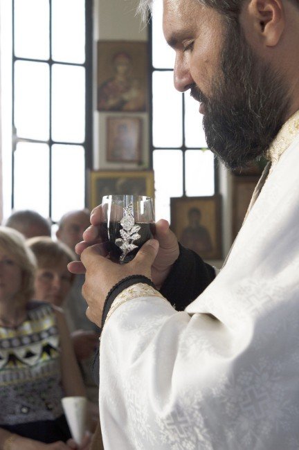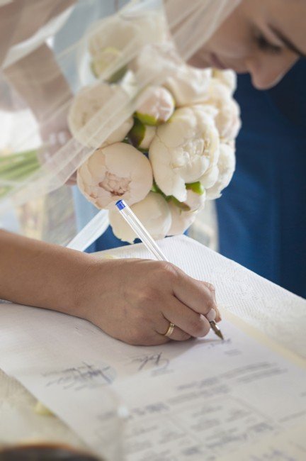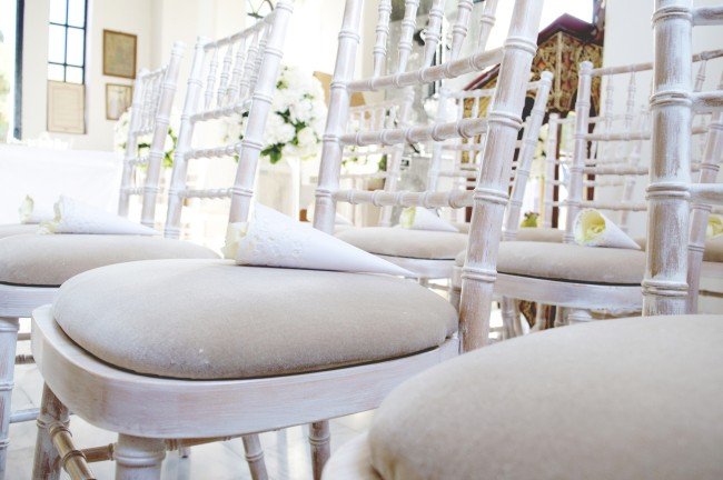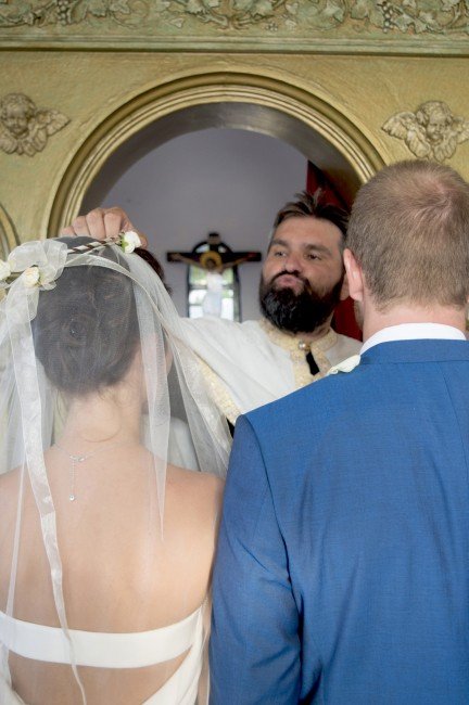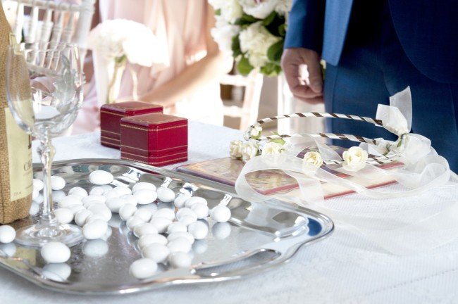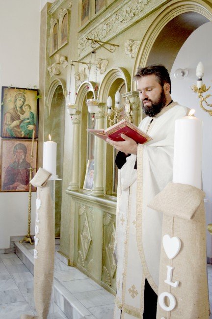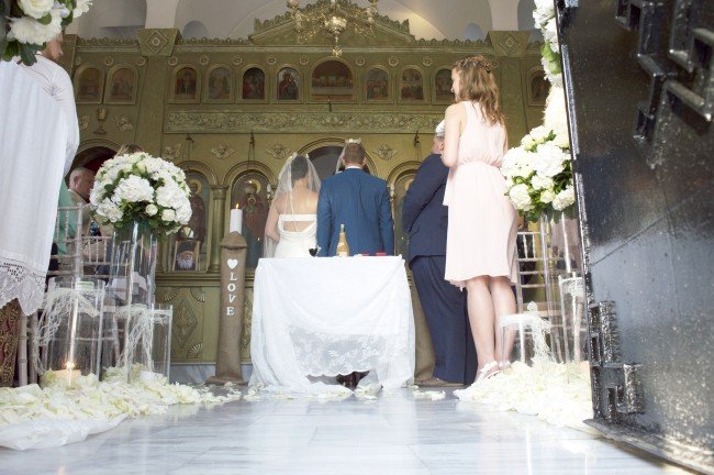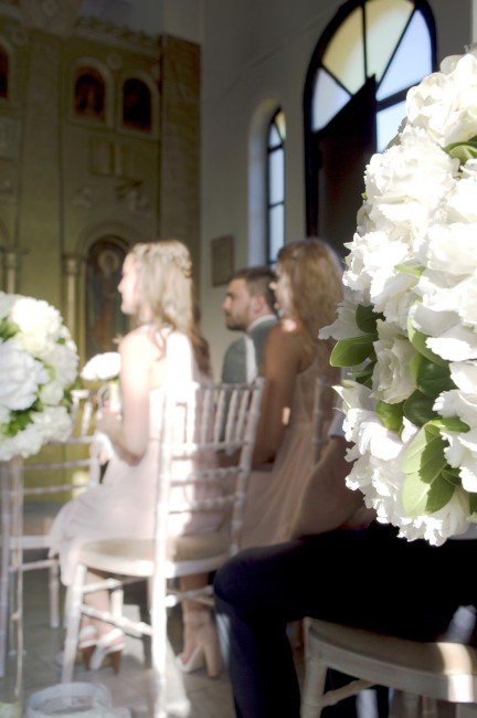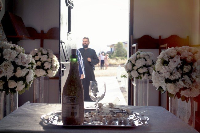 Their religious ceremony, conducted by a Greek priest happened in a small secluded church on the hills of Ag. Minas. Their wish was to have a religious ceremony in the smallest most remote church in the area, decorated with floral arrangements and rose petals. The main theme was rustic romance with a hint of hipster spirit. The church was small but just big enough for the 17 people. As by the Greek religious tradition there were the 2 big rustically decorated candles on each side of the altar. Ceremony table with koufetes (sugar coated almonds), stefania (simple crowns for bride and groom) and red wine. After the ceremony, they all gathered outside the church, where they celebrated with a glass of pink champagne.
