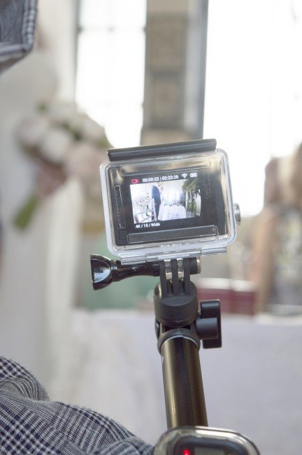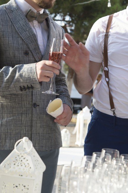 The bride wore a simple and gentle white dress with a long veil. While the groom had a dark blue suit with a beige rustic tie to match. All Groomsmen had a hipster look with a hat, blue pants and suspenders, accompanied with Go Pros for documentation. Bridesmaids, in style with the theme, wore blush pink color dresses and special handmade bouquets to match. Unique part of this wedding, were grooms boutonniere, bride’s and bridesmaid’s handmade bouquets from polymer clay.